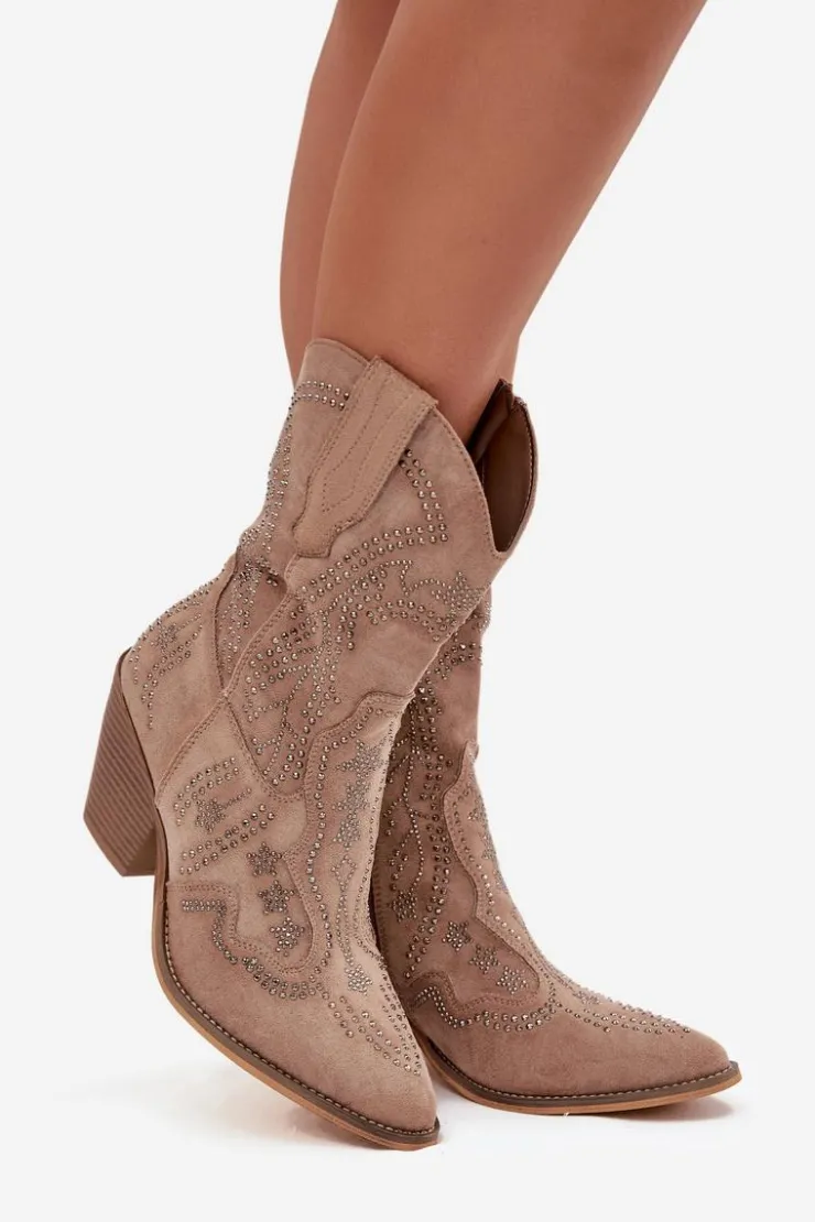 Botki kowbojki damskie wykonane z eko zamszu to propozycja, która łączy modny charakter z wygodą codziennego noszenia. Miękka w dotyku cholewka została ozdobiona stylowym zdobieniem, które nadaje wyjątkowego uroku i przyciąga uwagę. Model osadzony jest na charakterystycznym, ściętym obcasie typu słupek, który zapewnia stabilność, a jednocześnie dodaje sylwetce smukłości. Migdałowe noski podkreślają elegancję i kobiecy charakter butów, sprawiając, że świetnie komponują się z różnymi stylizacjami. Praktyczne zapięcie na zamek ułatwia zakładanie i zdejmowanie obuwia, co zwiększa komfort użytkowania. To botki, które doskonale sprawdzą się zarówno w casualowych, codziennych zestawach, jak i w bardziej stylowych outfitach inspirowanych modą boho. Przy wyborze rozmiaru prosimy sugerować się tabelą rozmiarów.