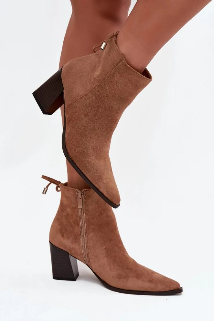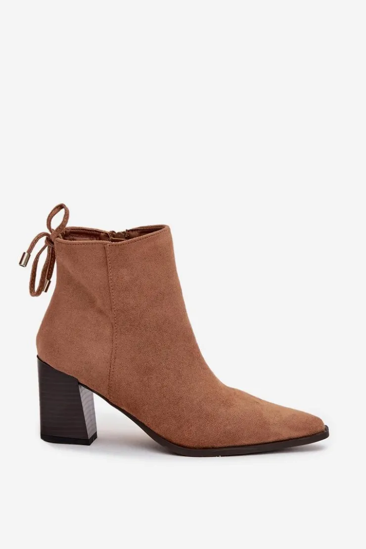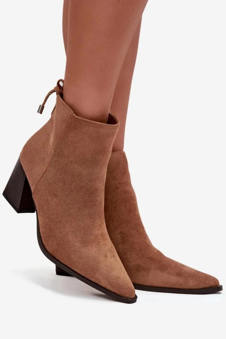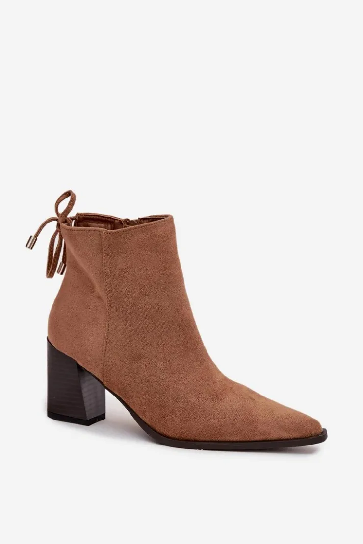 Botki damskie wykonane z eko zamszu. Osadzone na stabilnym obcasie typu słupek subtelnie wysmuklają sylwetkę, a szpiczaste noski dodają im kobiecego charakteru. Model wyróżnia się wiązaniem z tyłu na górze cholewki, które pełni funkcję dekoracyjną. To idealne botki do codziennych oraz eleganckich stylizacji.