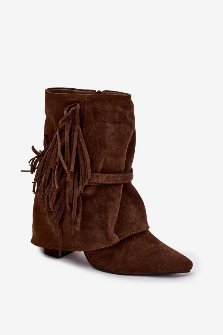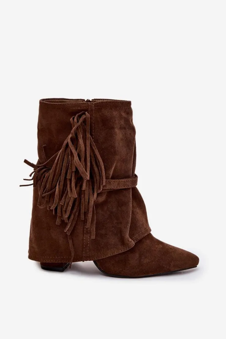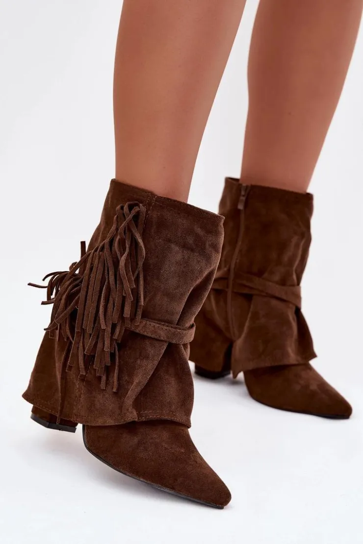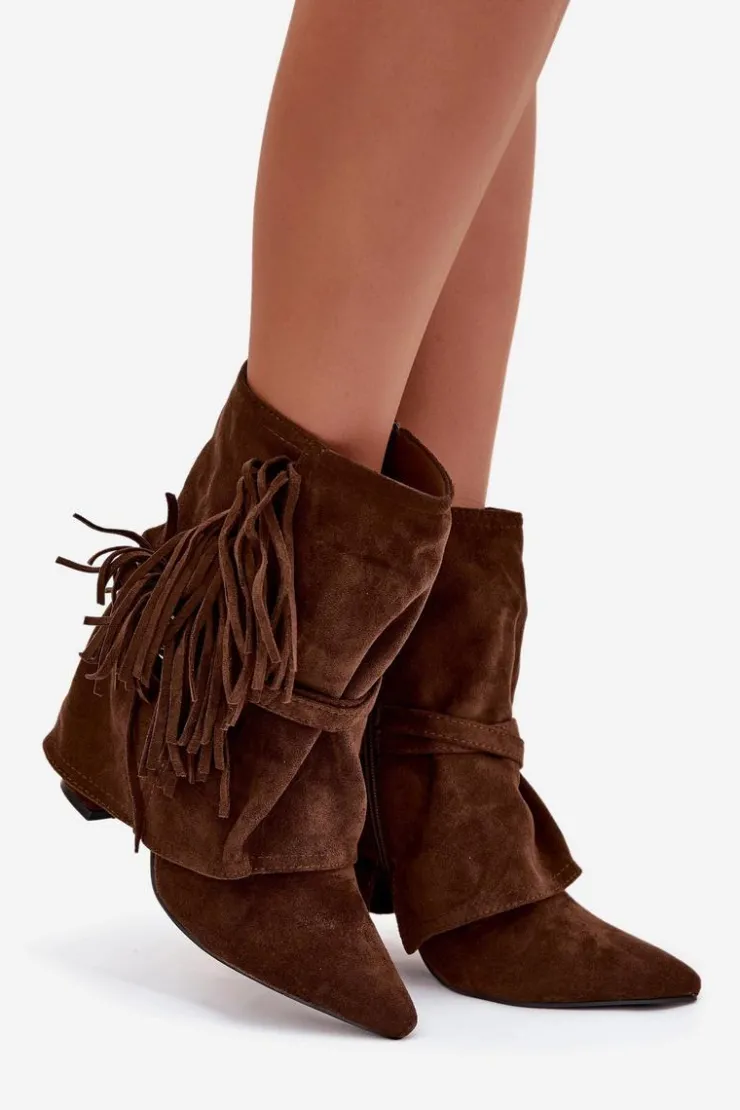 Damskie botki z eko zamszu to idealne połączenie stylu i oryginalnych detali, które przyciągają uwagę. Cholewka nachodząca na obcas subtelnie wysmukla sylwetkę, a szpiczaste noski dodają elegancji i kobiecego charakteru. Model ozdobiony frędzlami oraz cienkimi paseczkami ze złotymi klamrami wprowadza modowy akcent, nadając wyjątkowego, nowoczesnego wyglądu. Botki doskonale sprawdzą się w casualowych zestawach, jak i w bardziej wyjściowych stylizacjach, wprowadzając do nich nutę oryginalności i szyku. Komfortowe i efektowne, stanowią świetny wybór na co dzień i na specjalne okazje.Przy wyborze rozmiaru prosimy sugerować się tabelą rozmiarów.