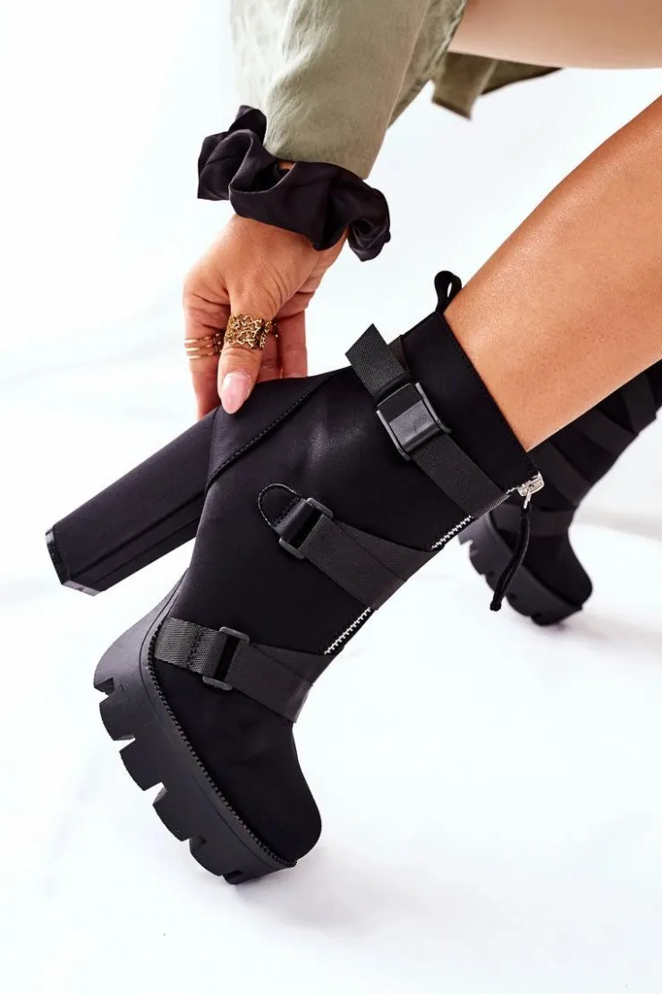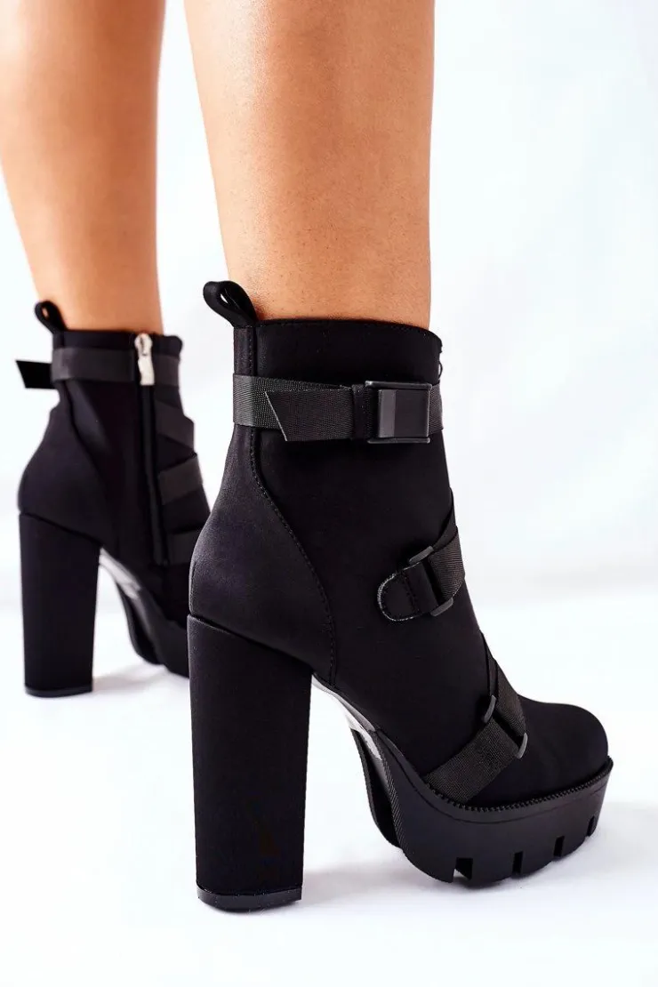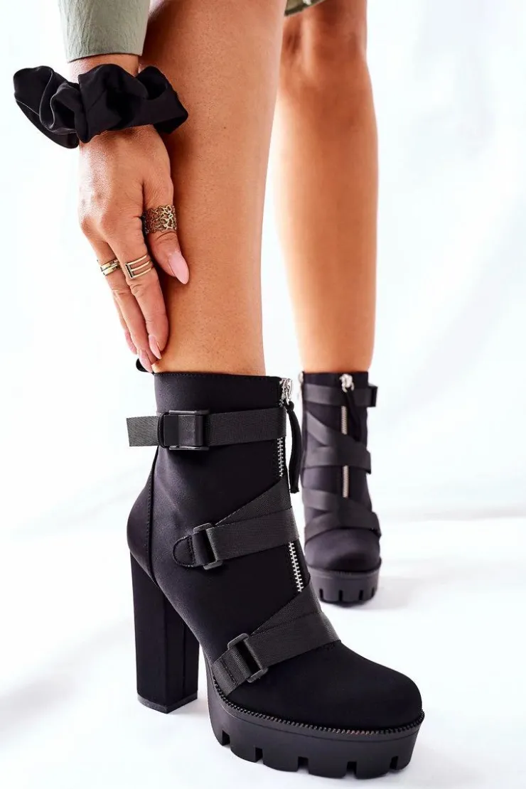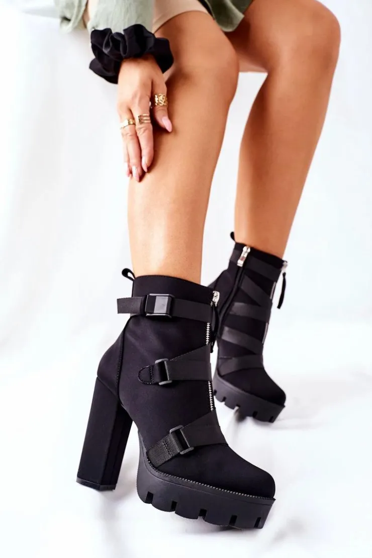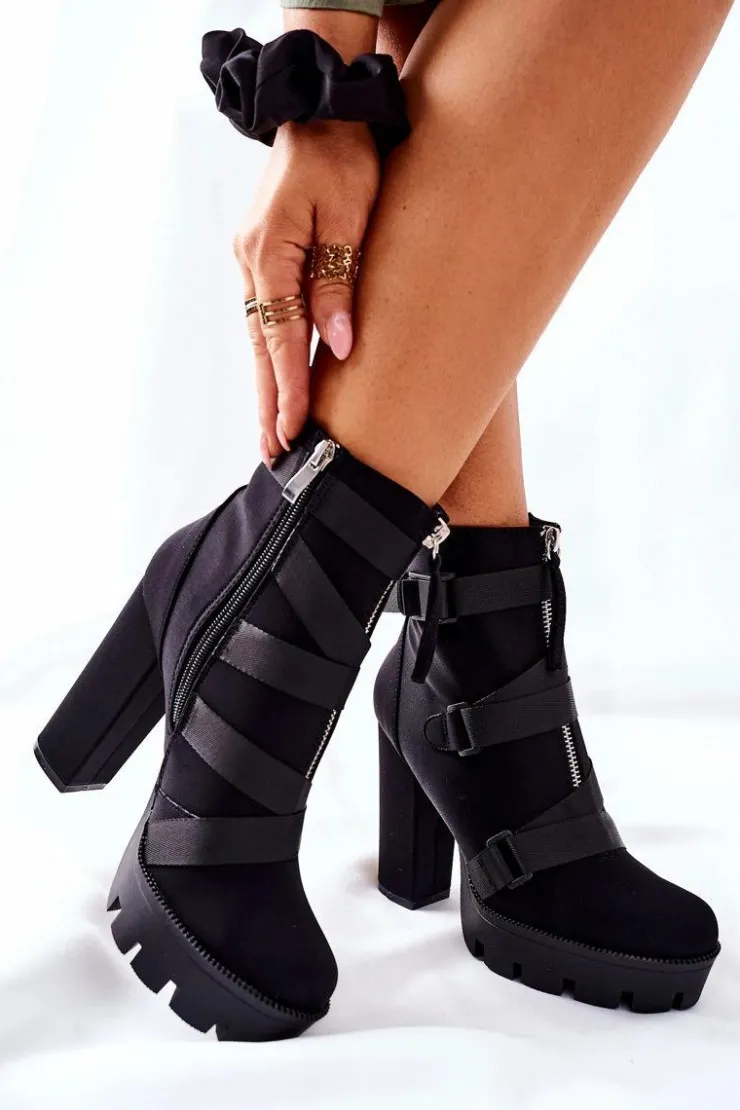 Przepiękne i modne botki są na wyciągnięcie ręki. Model na wysokim słupku oraz platformie, dzięki której wysokość słupka nie będzie aż tak odczuwalna. Zakładanie ułatwi wszyty na boku suwak. Modne zdobienie w postaci pasków oraz dodatkowego suwaka z przodu cholewki. Przy wyborze rozmiaru prosimy sugerować się tabelą rozmiarów.