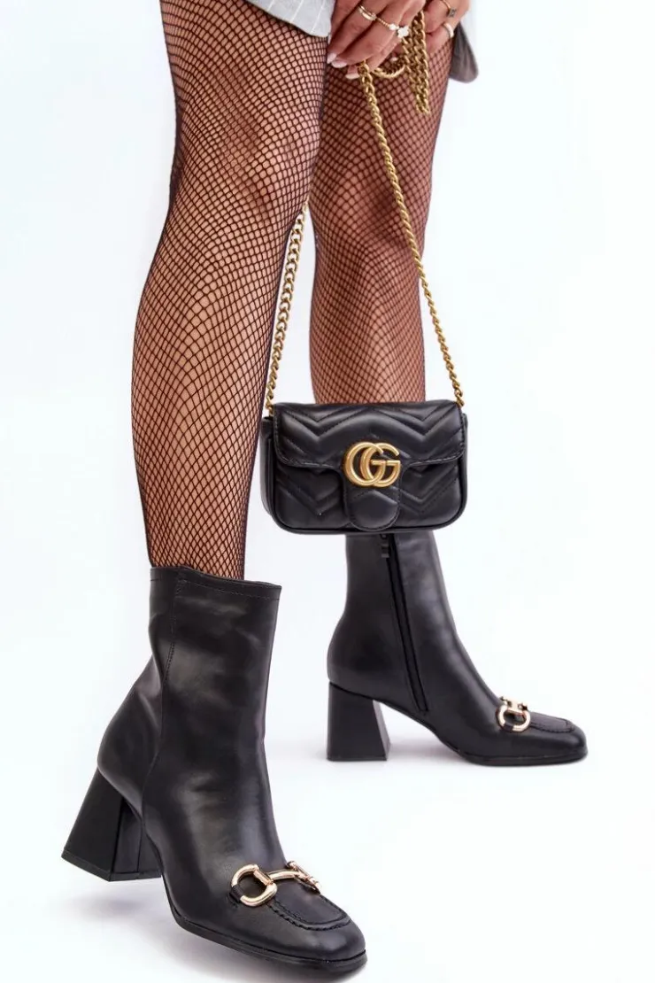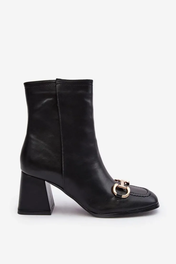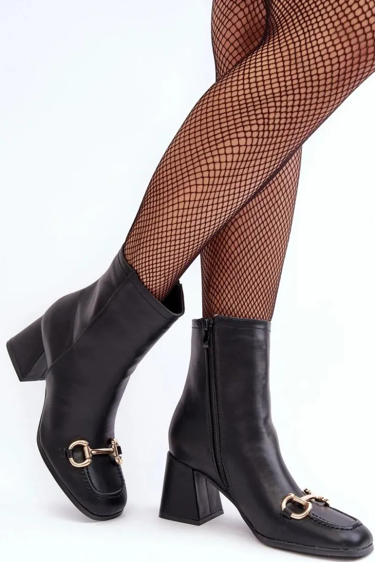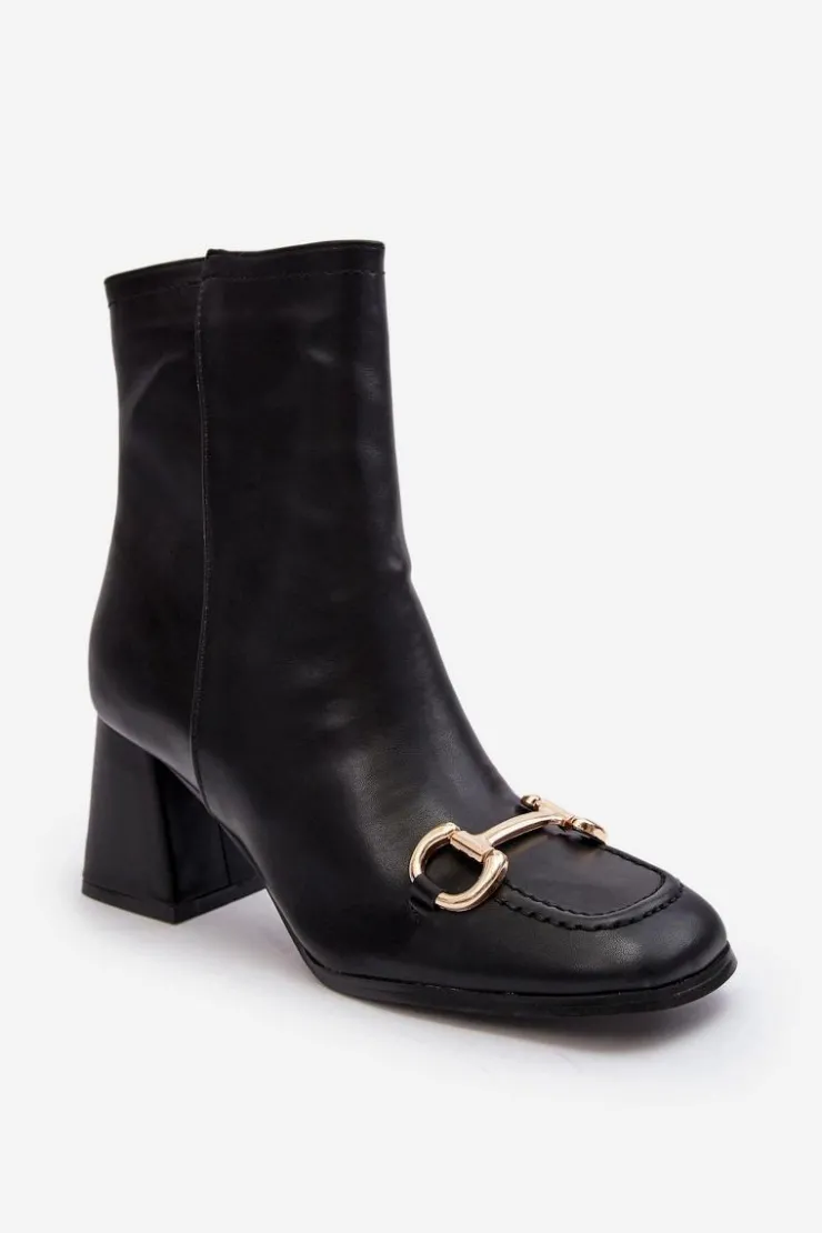 Botki damskie zostały wykonane z eko skóry. Zapinane na suwak z boku. Obcas w postaci klocka. Z przodu złota ozdoba z tworzywa sztucznego. Zapiętek jest usztywniony, noski w kwadrat. Ten model powinien znaleźć się w Twojej szafie! Przy wyborze rozmiaru prosimy sugerować się tabelą rozmiarów.