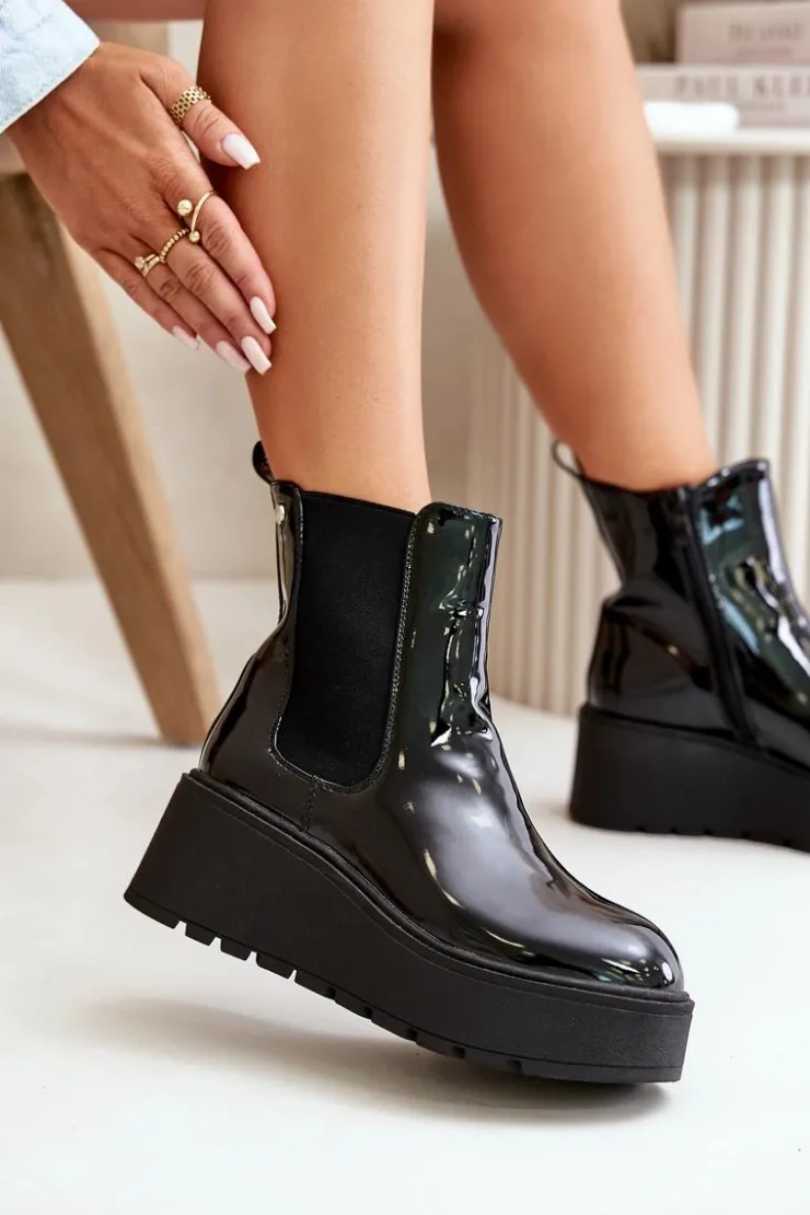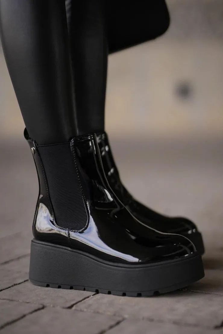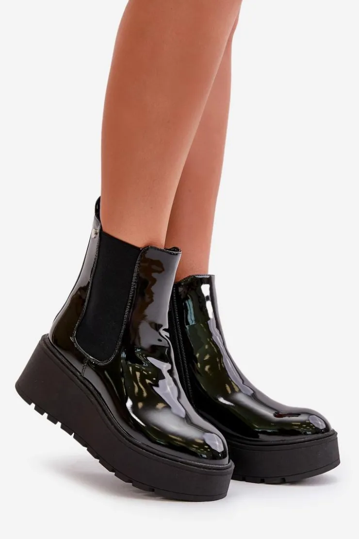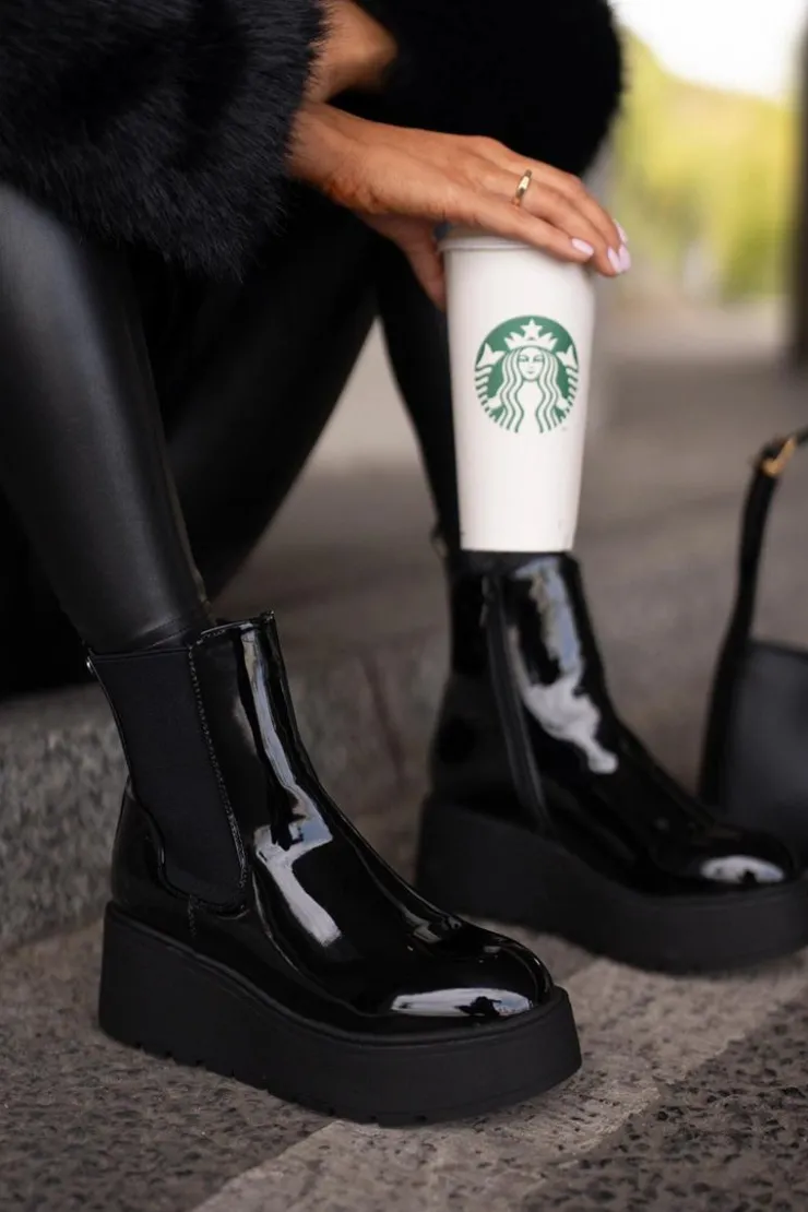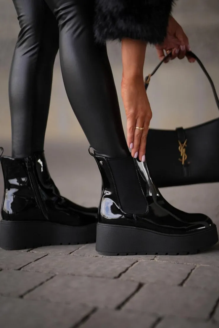 Stylowe lakierowane botki na platformie i koturnie, które łączą elegancję z wygodą. Zapinane na zamek, co zapewnia łatwe zakładanie i zdejmowanie. Wnętrze ocieplone kocem obuwniczym, gwarantując ciepło w chłodniejsze dni. Idealne na jesień i zimę, te botki będą doskonałym uzupełnieniem wielu modnych stylizacji. Przy wyborze rozmiaru prosimy sugerować się tabelą rozmiarów.