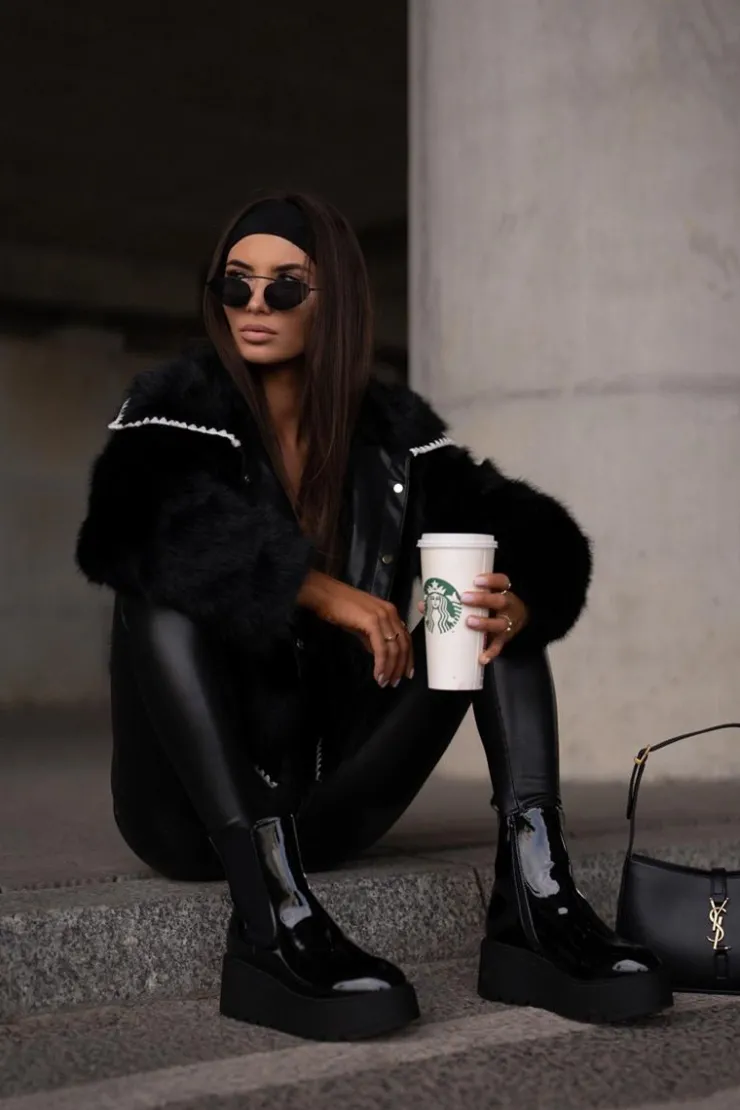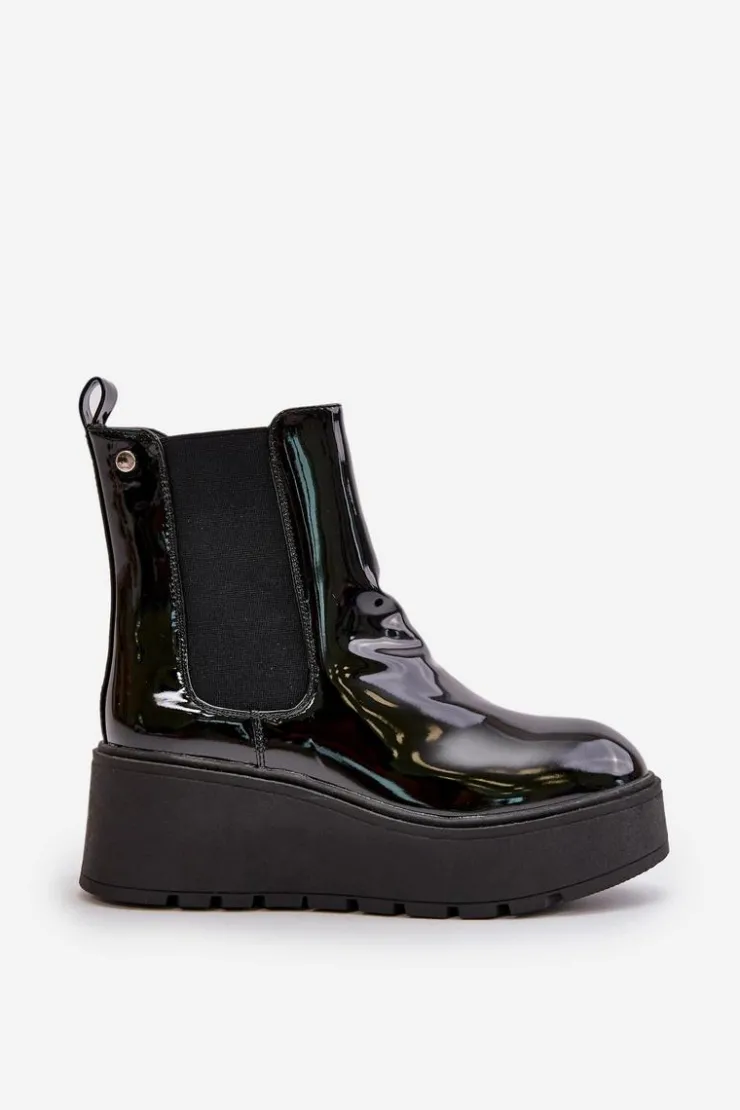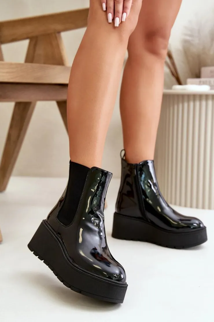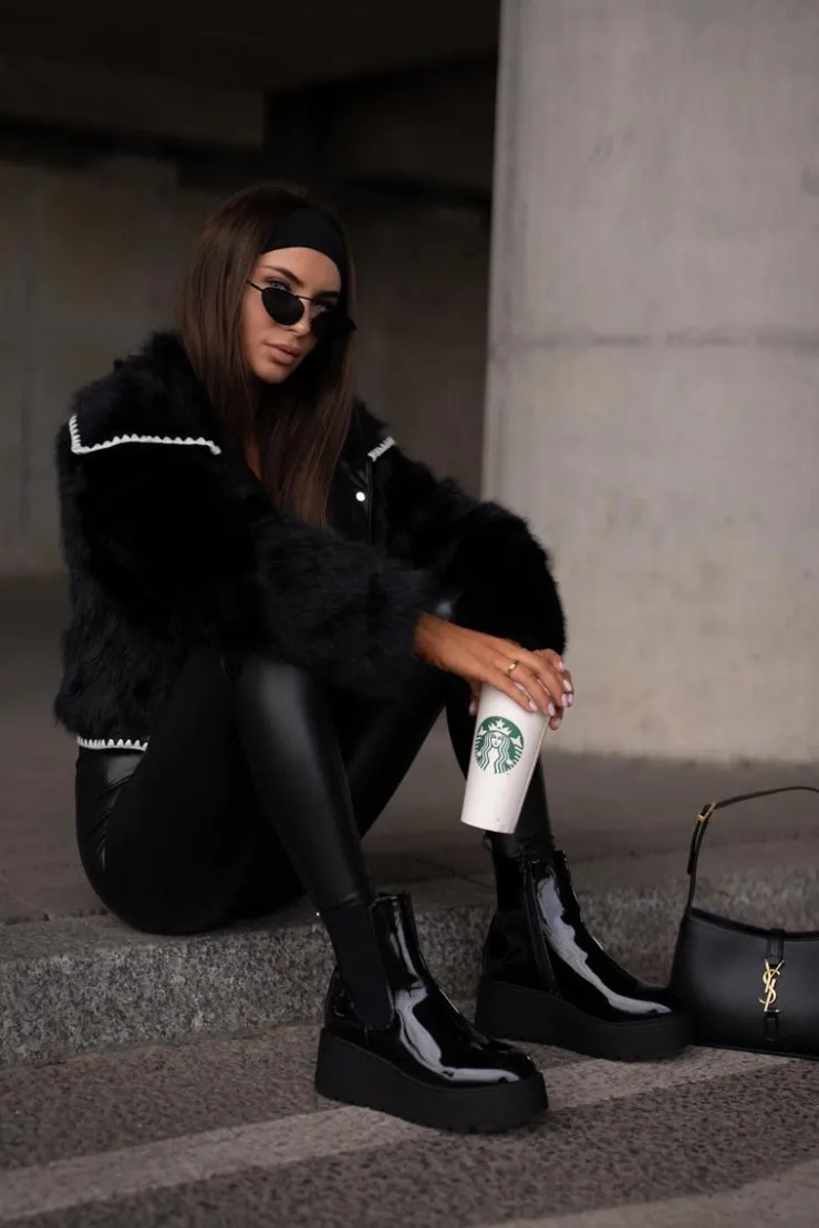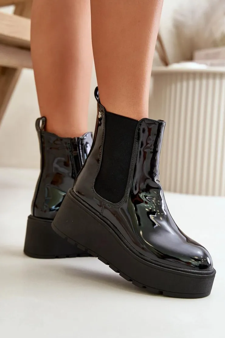 Stylowe lakierowane botki na platformie i koturnie, które łączą elegancję z wygodą. Zapinane na zamek, co zapewnia łatwe zakładanie i zdejmowanie. Wnętrze ocieplone kocem obuwniczym, gwarantując ciepło w chłodniejsze dni. Idealne na jesień i zimę, te botki będą doskonałym uzupełnieniem wielu modnych stylizacji. Przy wyborze rozmiaru prosimy sugerować się tabelą rozmiarów.