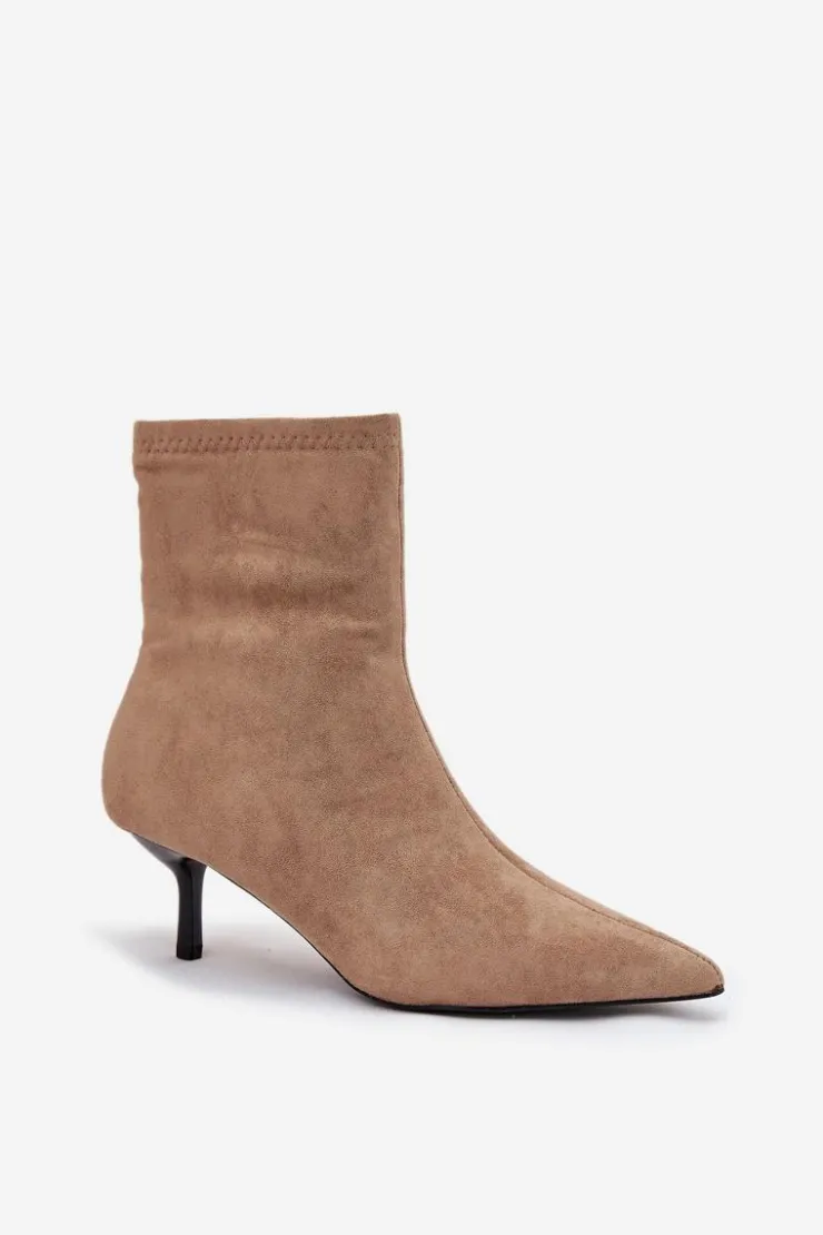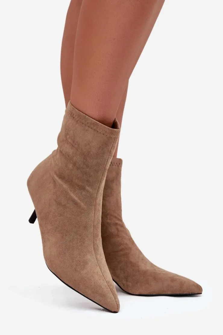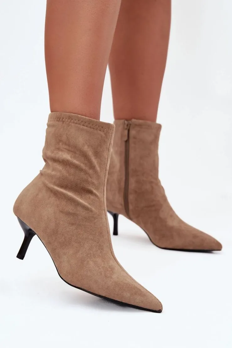Eleganckie botki damskie wykonane z wysokiej jakości eko zamszu to idealny wybór na chłodniejsze dni. Smukła szpilka oraz szpiczasty nosek nadają butom wyjątkowo kobiecy i szykowny charakter, doskonale wysmuklając sylwetkę. Wewnętrzne ocieplenie zapewnia komfort i ciepło, dzięki czemu możesz cieszyć się modnym wyglądem również w sezonie jesienno-zimowym. Botki zapinane są na praktyczny zamek, który ułatwia zakładanie i zdejmowanie obuwia. Stylowy fason sprawia, że świetnie komponują się zarówno z sukienką, jak i ulubionymi spodniami. Przy wyborze rozmiaru prosimy sugerować się tabelą rozmiarów.