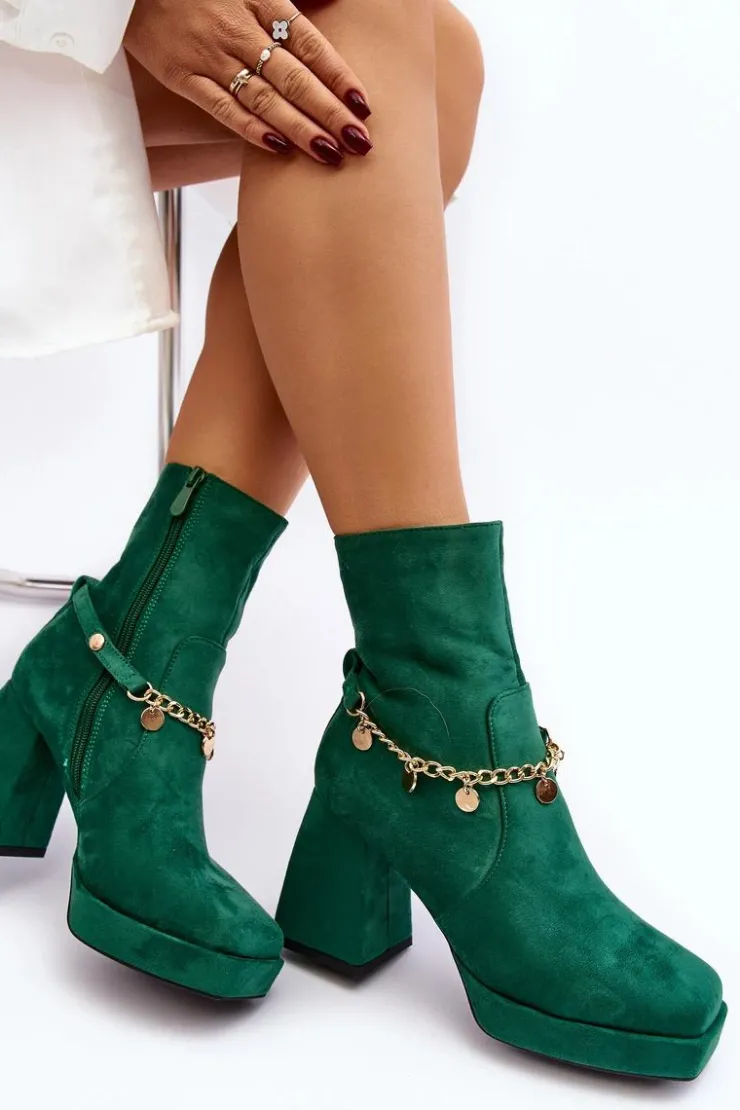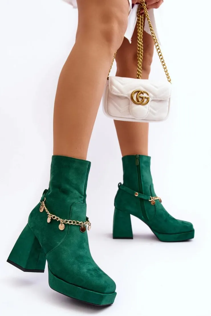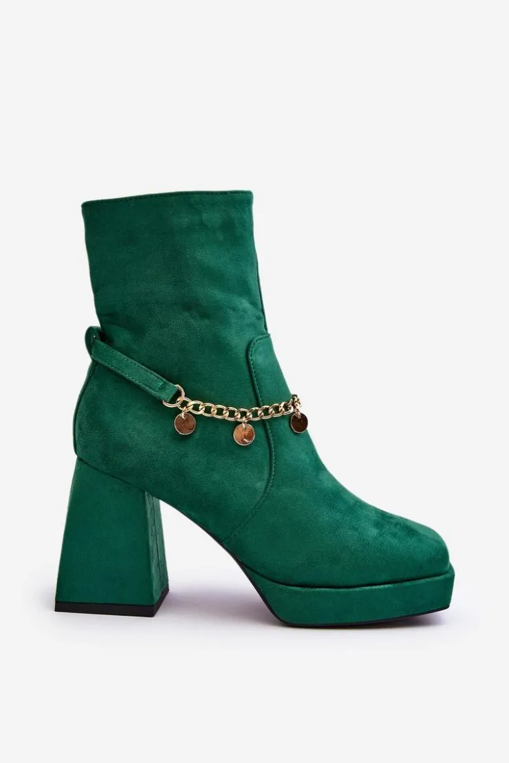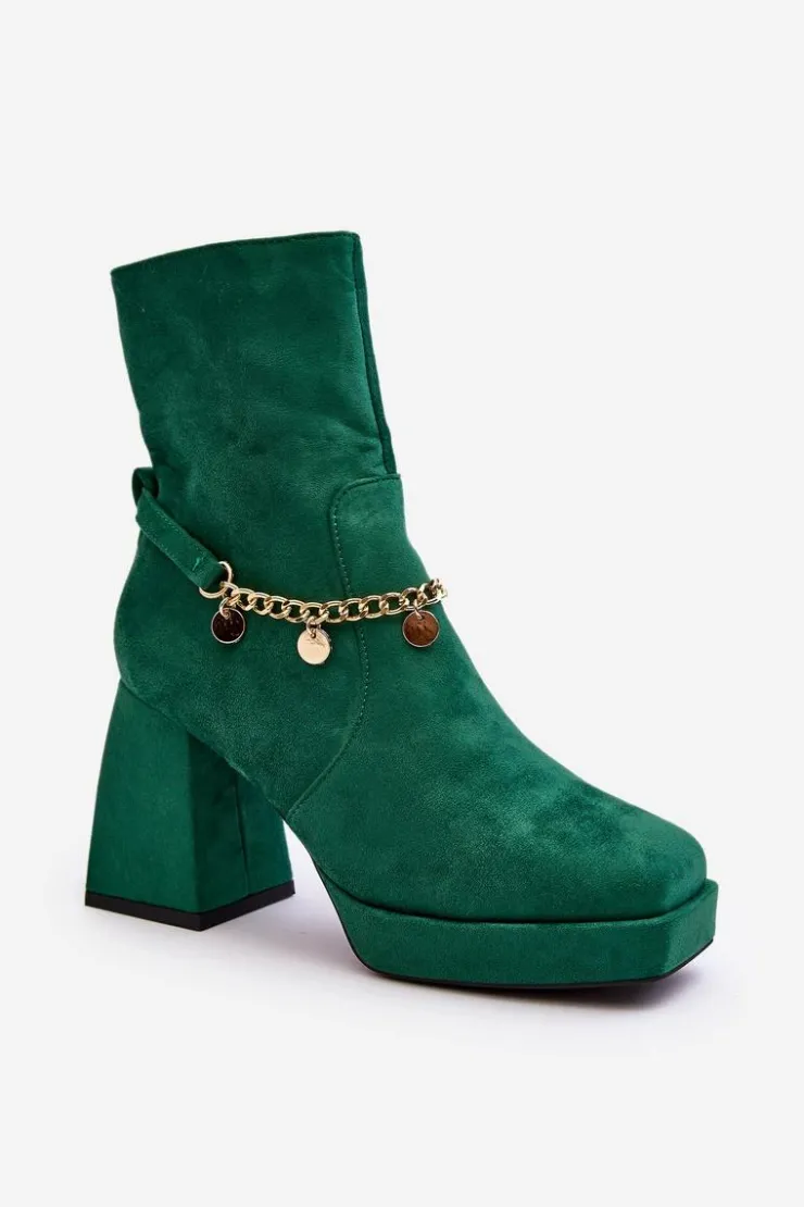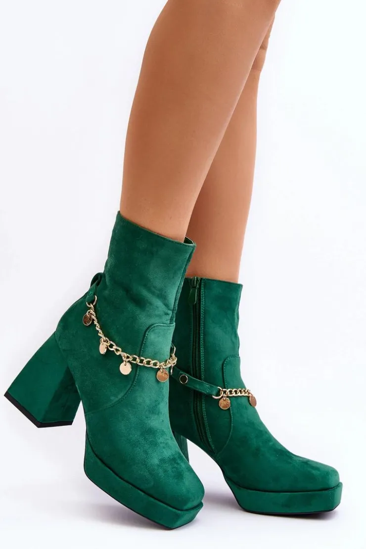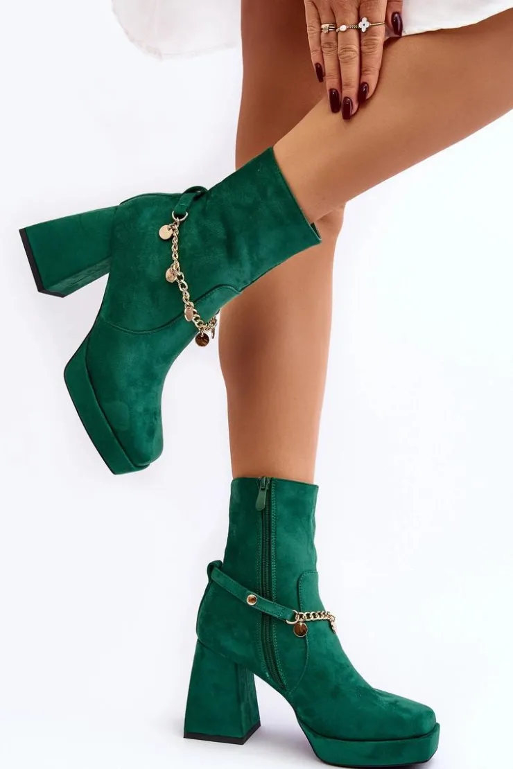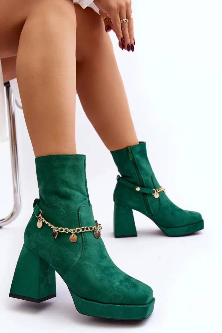 Botki damskie zostały wykonane z eko zamszu, co nadaje im eleganckiego wyglądu. Charakteryzują się solidnym obcasem typu klocek oraz noskami w kształcie kwadratu, dodającymi nutę nowoczesności. Usztywniony zapiętek zapewnia stabilność i wygodę podczas użytkowania. Cholewka ozdobiona łańcuszkiem. Botki te będą idealnym dodatkiem do jesiennych stylizacji! Przy wyborze rozmiaru prosimy sugerować się tabelą rozmiarów.