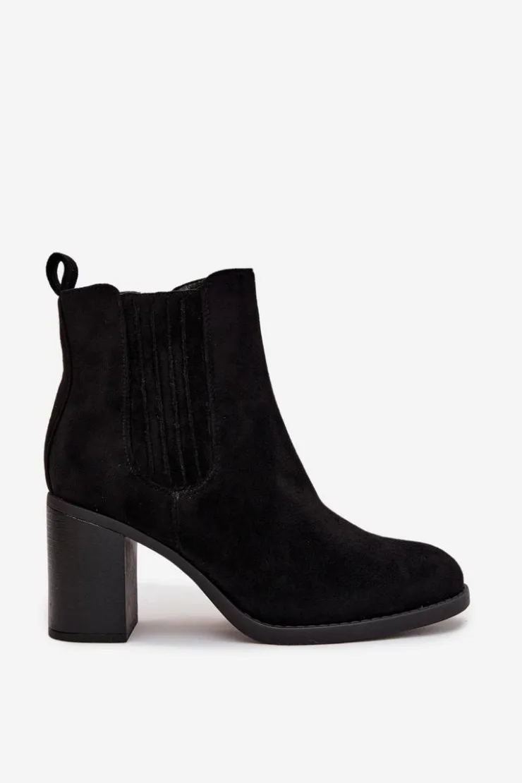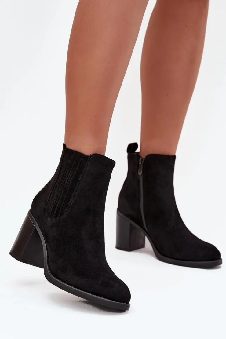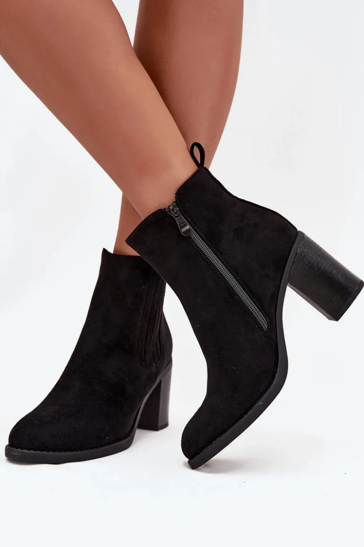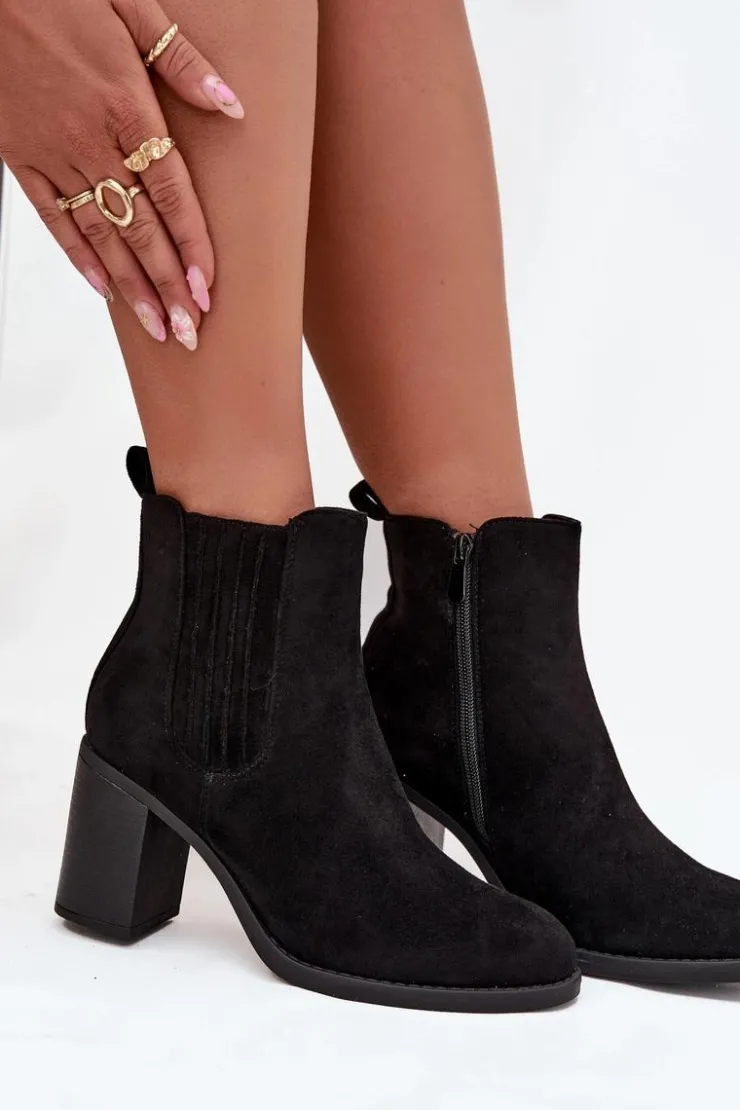 Botki damskie z eko zamszu to ponadczasowa propozycja na chłodniejsze dni. Osadzone na stabilnym obcasie typu słupek zapewniają wygodę i subtelnie podkreślają sylwetkę. Wnętrze zostało ocieplone kocem obuwniczym. Dzięki swojemu klasycznemu fasonowi buty doskonale pasują zarówno do codziennych, jak i eleganckich stylizacji – idealne do spodni, spódnic czy sukienek.