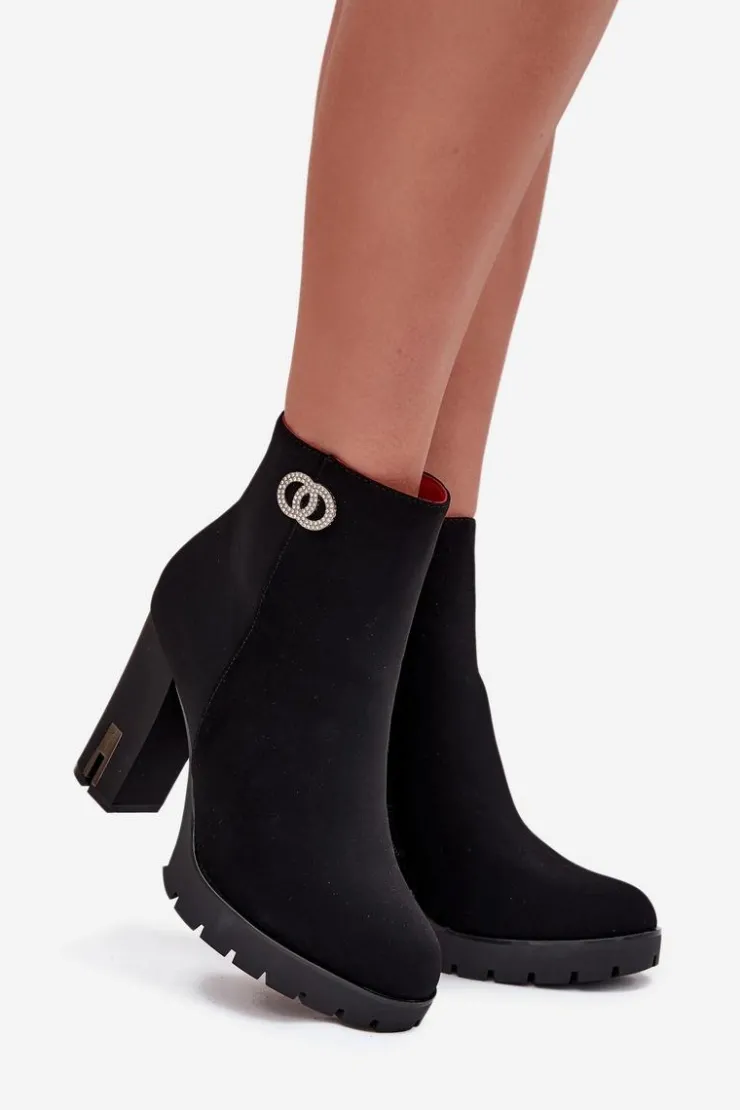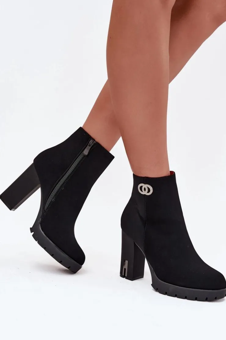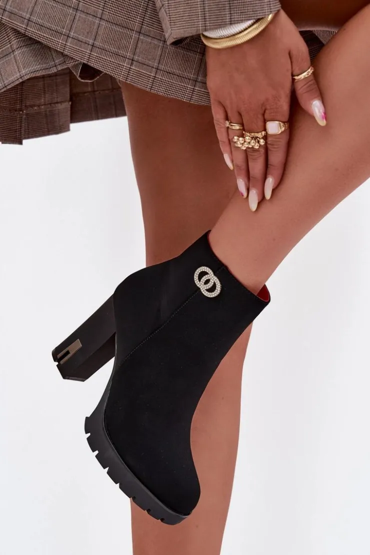Damskie botki z wysokim obcasem typu słupek to połączenie elegancji i wygody. Charakteryzują się ozdobnym detalem, który nadaje im modnego, wyrazistego charakteru. Zamek błyskawiczny ułatwia zakładanie, a wnętrze ocieplane kocem obuwniczym zapewnia ciepło i komfort w chłodniejsze dni. Te botki to idealny wybór do stylizacji, które wymagają zarówno klasycznego, jak i nowoczesnego akcentu! Przy wyborze rozmiaru prosimy sugerować się tabelą rozmiarów.