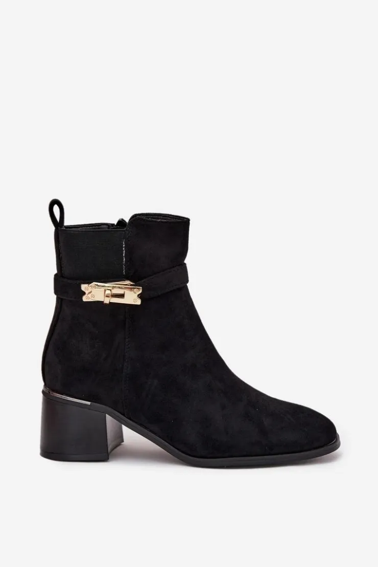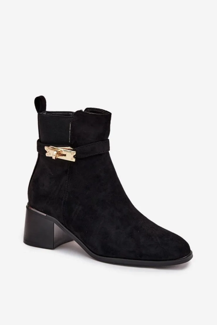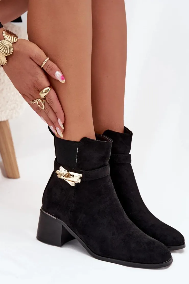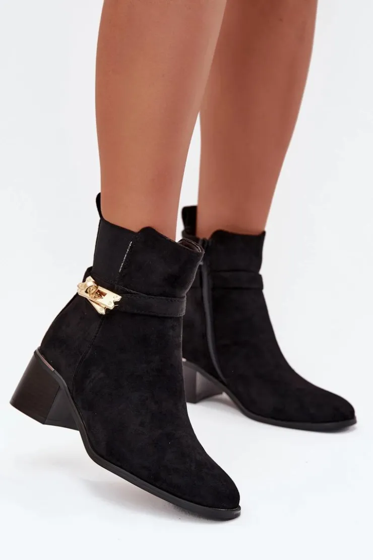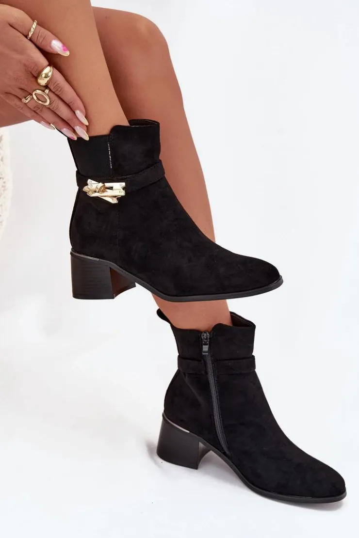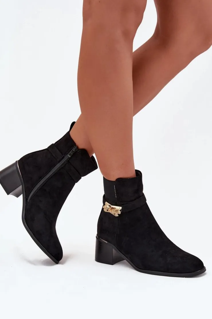 Botki damskie wykonane z eko zamszu to doskonała propozycja na chłodniejsze dni. Osadzone na obcasie w formie klocka, zapewniają stabilność i wygodę przez cały dzień. Środek ocieplany kocem obuwniczym gwarantuje ciepło i komfort. Noski zaokrąglone. Cholewka ozdobiona paseczkiem ze złotą ozdobą dodaje wyjątkowego akcentu, sprawiając, że będą doskonałym uzupełnieniem eleganckich zimowych stylizacji. Przy wyborze rozmiaru prosimy sugerować się tabelą rozmiarów.