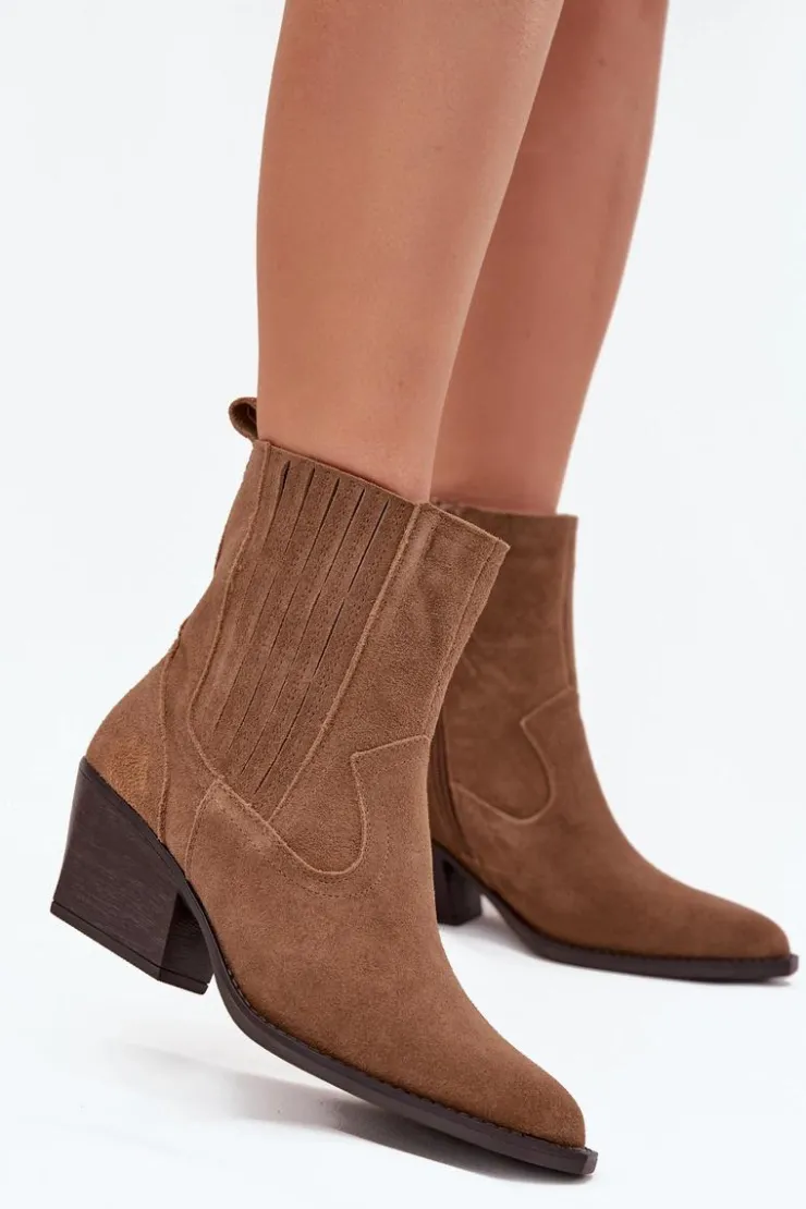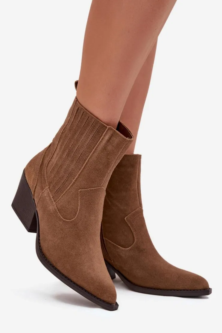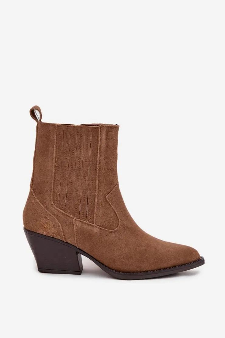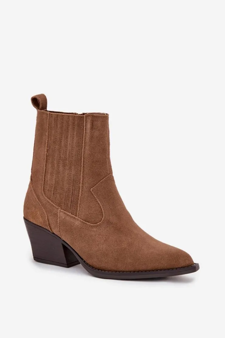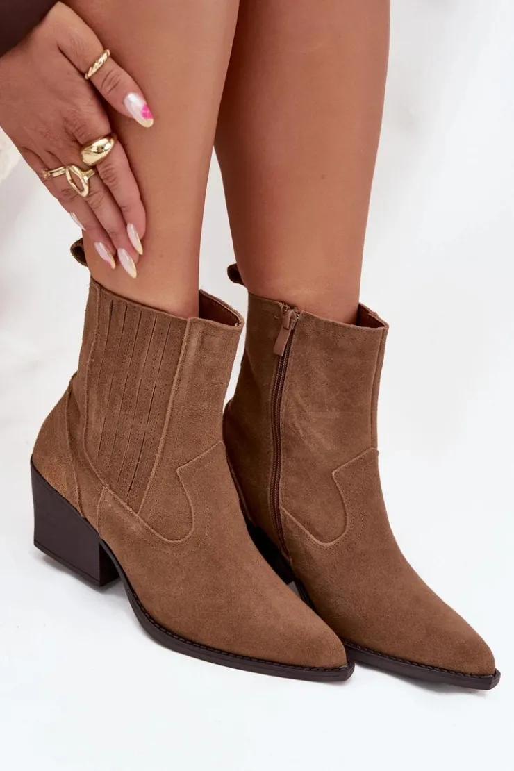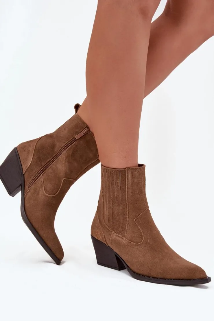 Botki kowbojki damskie z naturalnego zamszu to wyjątkowa propozycja, która łączy styl i komfort. Szpiczaste noski nadają im charakterystycznego wyglądu, a ocieplenie kocem obuwniczym zapewnia ciepło w chłodniejsze dni. Zamek błyskawiczny umożliwia wygodne zakładanie, a obcas słupek zapewnia stabilność i wygodę podczas chodzenia. Idealne do codziennych stylizacji, te botki dodadzą wyjątkowego akcentu każdemu lookowi. Przy wyborze rozmiaru prosimy sugerować się tabelą rozmiarów.