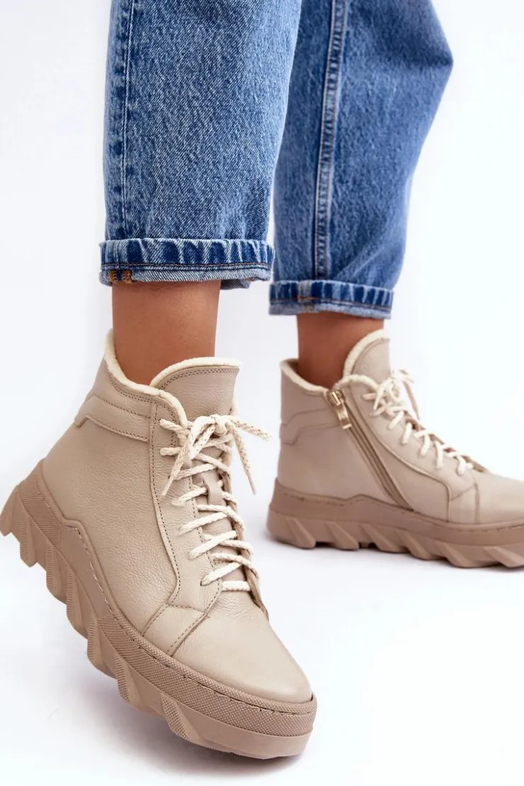 Botki damskie w sportowym stylu zostały wykonane ze skóry naturalnej. Osadzone na platformie z gumowego tworzywa. Wewnątrz ocieplone naturalną wełną. Zapinane na suwak z boku cholewki oraz dodatkowo posiadają sznurowanie. Cholewka za kostkę. Noski zaokrąglone. Usztywniony zapiętek. Przy wyborze rozmiaru prosimy sugerować się tabelą rozmiarów.