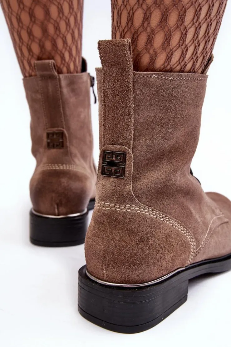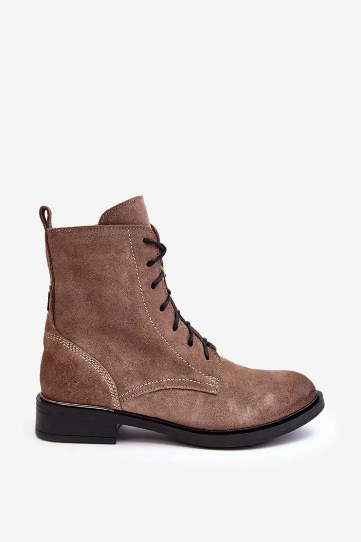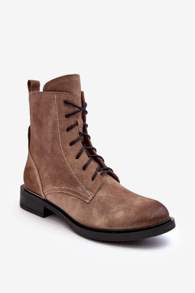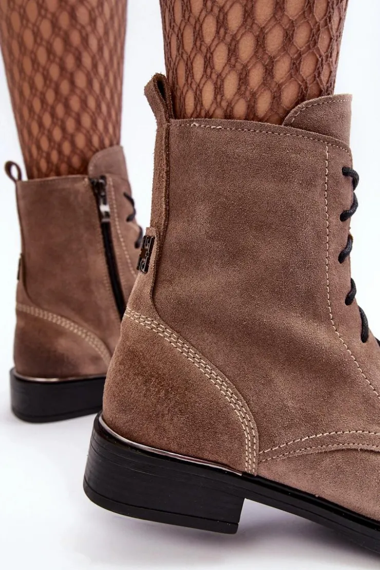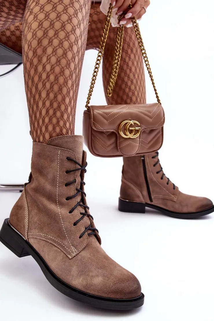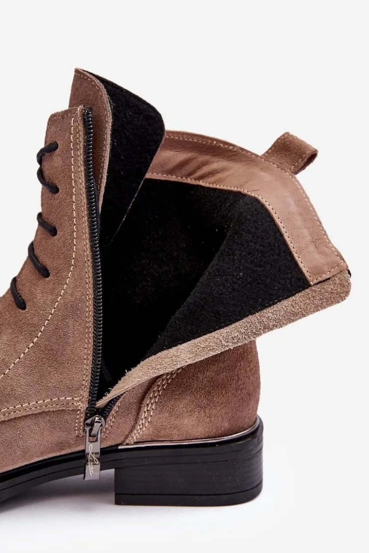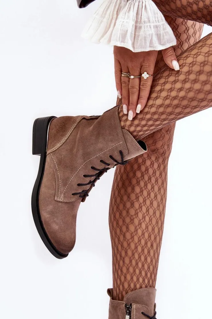 Klasyczne botki damskie zostały wykonane z wysokiej jakości naturalnych skór. Model ten posiada klasyczne sznurowanie oraz suwak z boku cholewki. Modne przetarcia na przodzie oraz tyle buta wyróżniają ten model na tle innych. Usztywniany zapiętek zapewni stabilizację stopy. Botki zostały ocieplone kocem obuwniczym. Osadzone na płaskim obcasie i delikatnej platformie. Przy wyborze rozmiaru prosimy sugerować się tabelą rozmiarów.