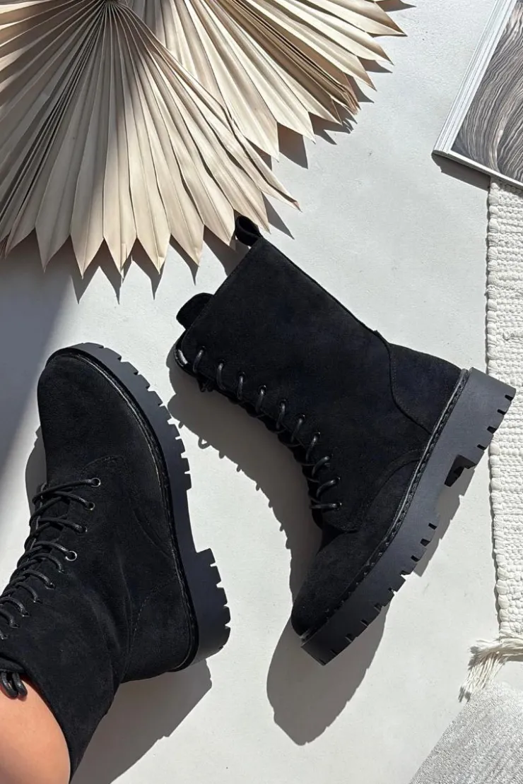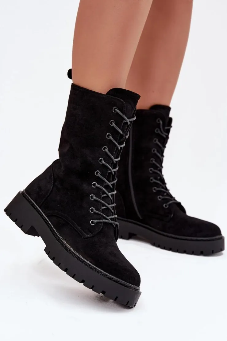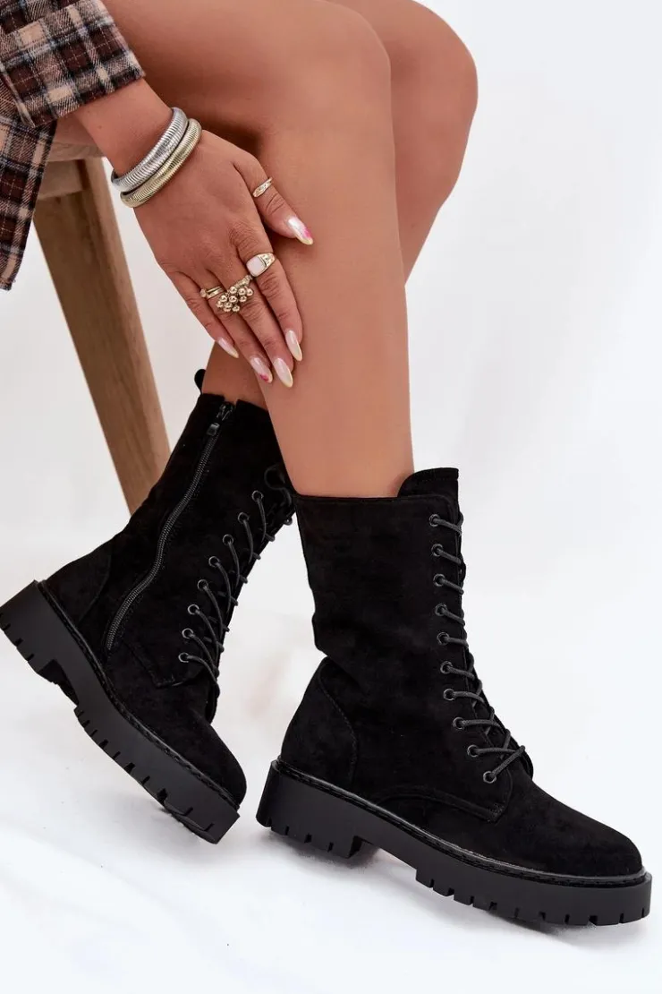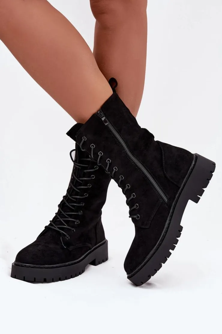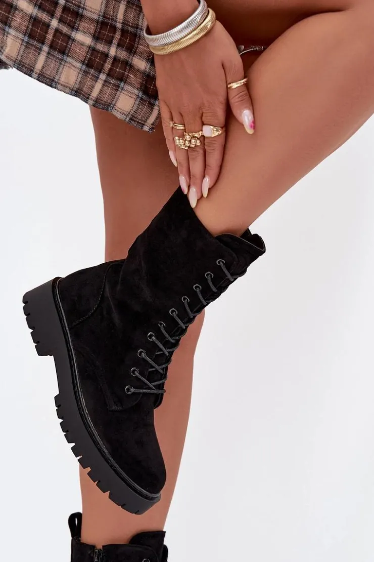 Klasyczne botki damskie typu workery wykonane z eko zamszu. Model osadzony na platformie z płaskim obcasem zapewnia stabilny krok, a ocieplenie gwarantuje komfort w chłodniejsze dni. Sznurowanie w połączeniu z zamkiem umożliwia łatwe zakładanie i idealne dopasowanie do stopy, co czyni je świetnym wyborem do codziennych, casualowych stylizacji. Przy wyborze rozmiaru prosimy sugerować się tabelą rozmiarów.