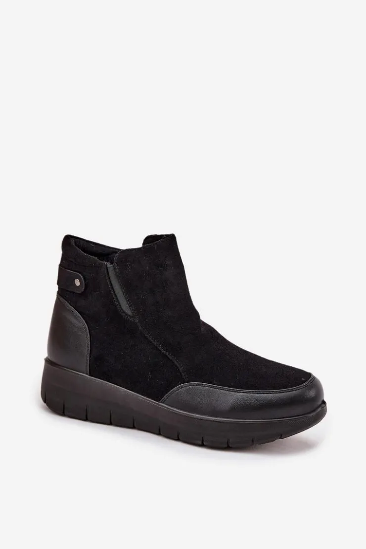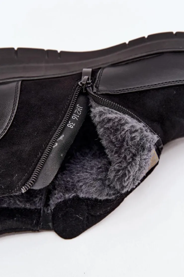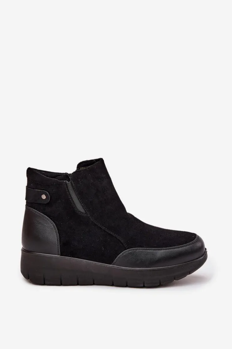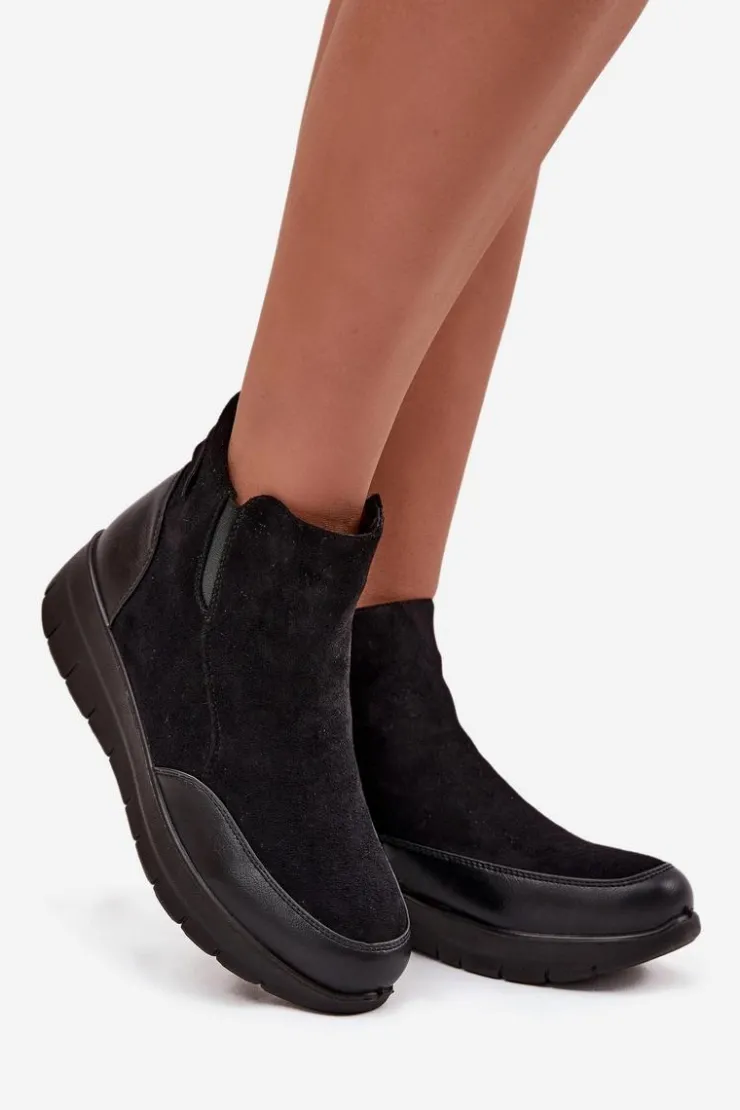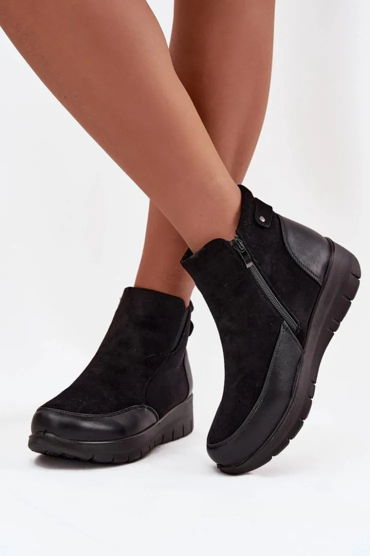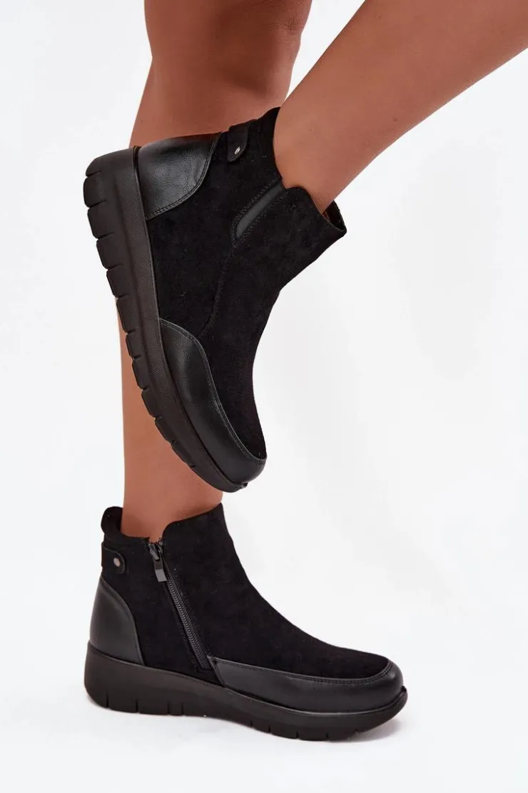 Botki damskie wykonane z połączenia eko zamszu i eko skóry. Model został osadzony na platformie, co zapewnia wygodę i stabilność podczas chodzenia. Wnętrze wykończono grubym futerkiem, które skutecznie chroni przed zimnem i gwarantuje komfort w mroźne dni. Zaokrąglone noski nadają całości klasycznego wyglądu, a praktyczne zapięcie na zamek ułatwia zakładanie i zdejmowanie. To botki, które świetnie sprawdzą się w codziennym użytkowaniu, oferując jednocześnie ciepło, wygodę i modny styl w sezonie jesienno-zimowym. Przy wyborze rozmiaru prosimy sugerować się tabelą rozmiarów.