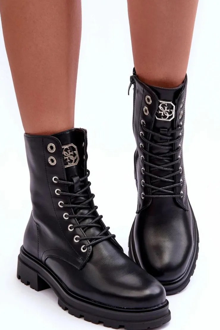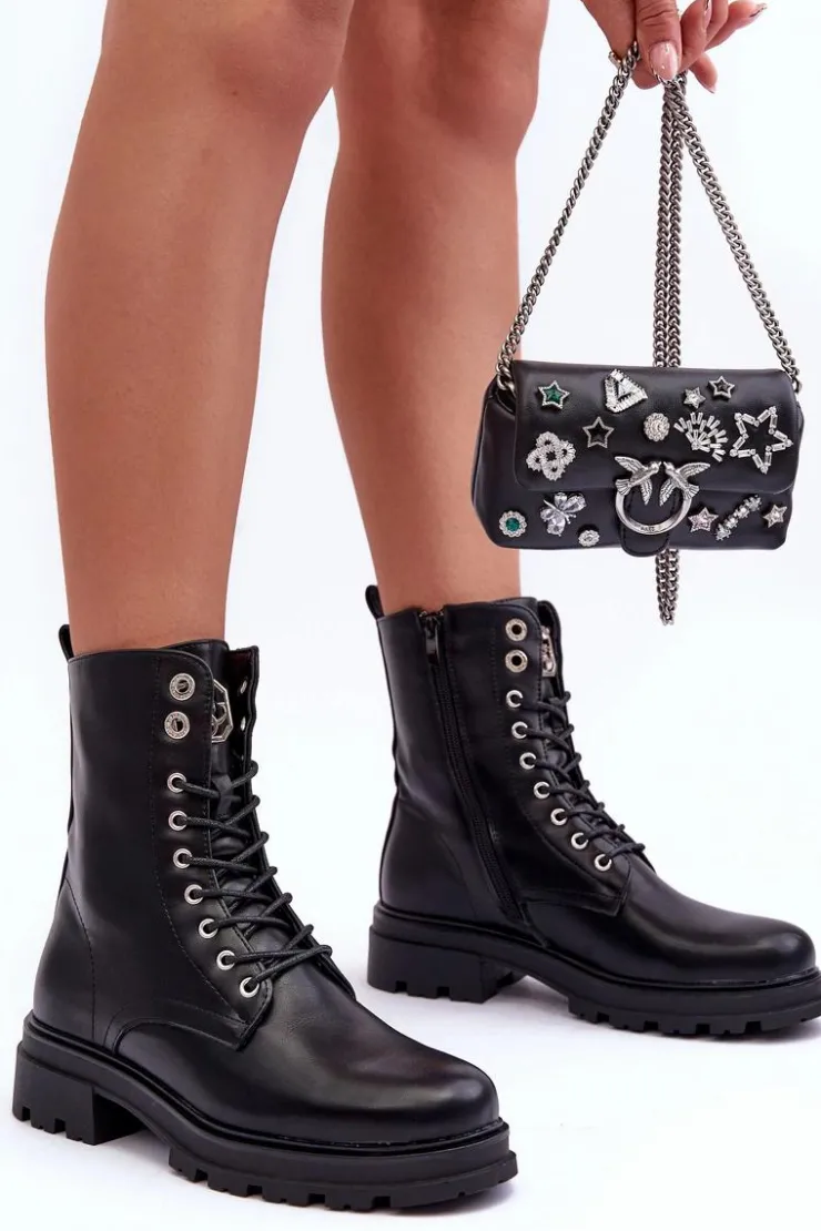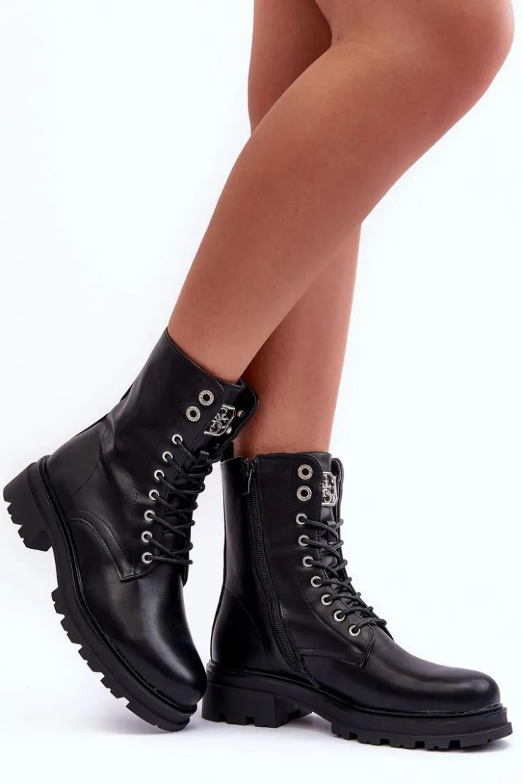 Klasyczne damskie botki zostały osadzone na płaskim obcasie i platformie. Wykonane z eko skóry. Zapinane na suwak po wewnętrznej stronie cholewki oraz dodatkowo posiadają sznurowanie. Zapiętek w tym obuwiu jest usztywniany. Z przodu ozdoba z tworzywa sztucznego. Model ten jest idealny na jesienne dni! Koniecznie powinnaś je mieć w swojej szafie! Przy wyborze rozmiaru prosimy sugerować się tabelą rozmiarów.