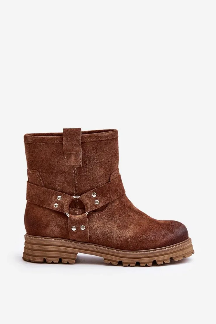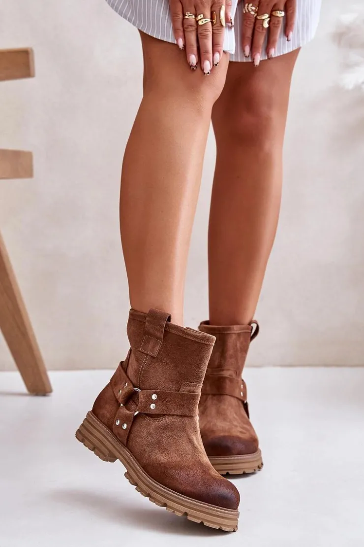 Botki wykonane z naturalnego zamszu to idealny wybór na każdą okazję. Osadzone na płaskim obcasie, zapewniają komfort i stabilność podczas chodzenia. Zaokrąglone noski dodają subtelnego charakteru. Model zapinany na zamek, co ułatwia zakładanie. Cholewka ozdobiona efektownym połączeniem pasków, które dodają stylowego akcentu. Te botki świetnie sprawdzą się w codziennych stylizacjach, łącząc elegancję z wygodą. Przy wyborze rozmiaru prosimy sugerować się tabelą rozmiarów.