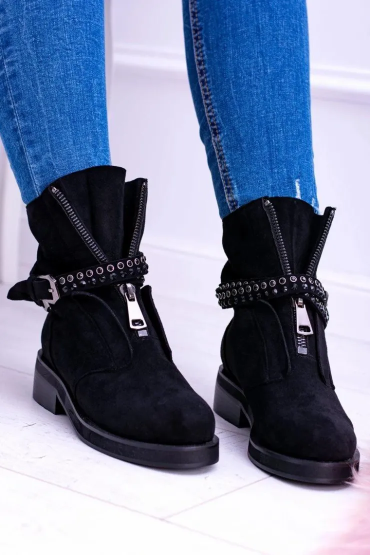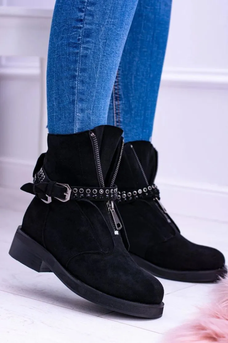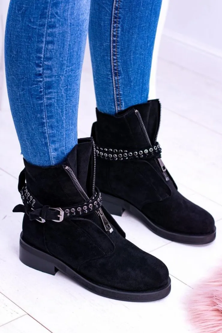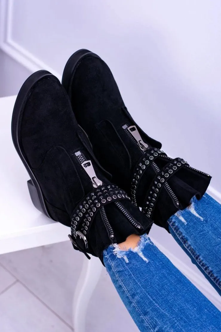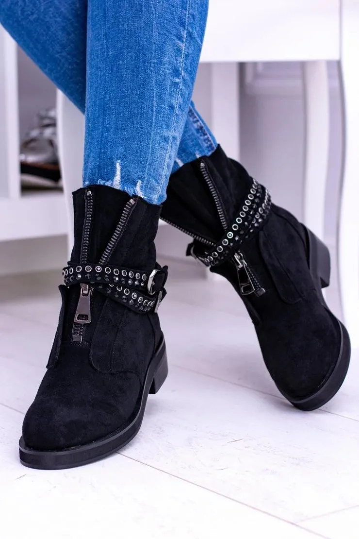 Stylowe, czarne botki nigdy nie wychodzą z mody. Nasza propozycja wspaniale uzupełni wasze stylizacje. Botki są niezwykle wygodne, a dzięki zamkowi idealnie dopasujesz je do stopy. Modne zdobienia w postaci pasków, klamry oraz mieniących się cekinów. Dodatkowym zdobieniem jest suwak na cholewce, który pięknie podkreśla ich wyjątkowości.