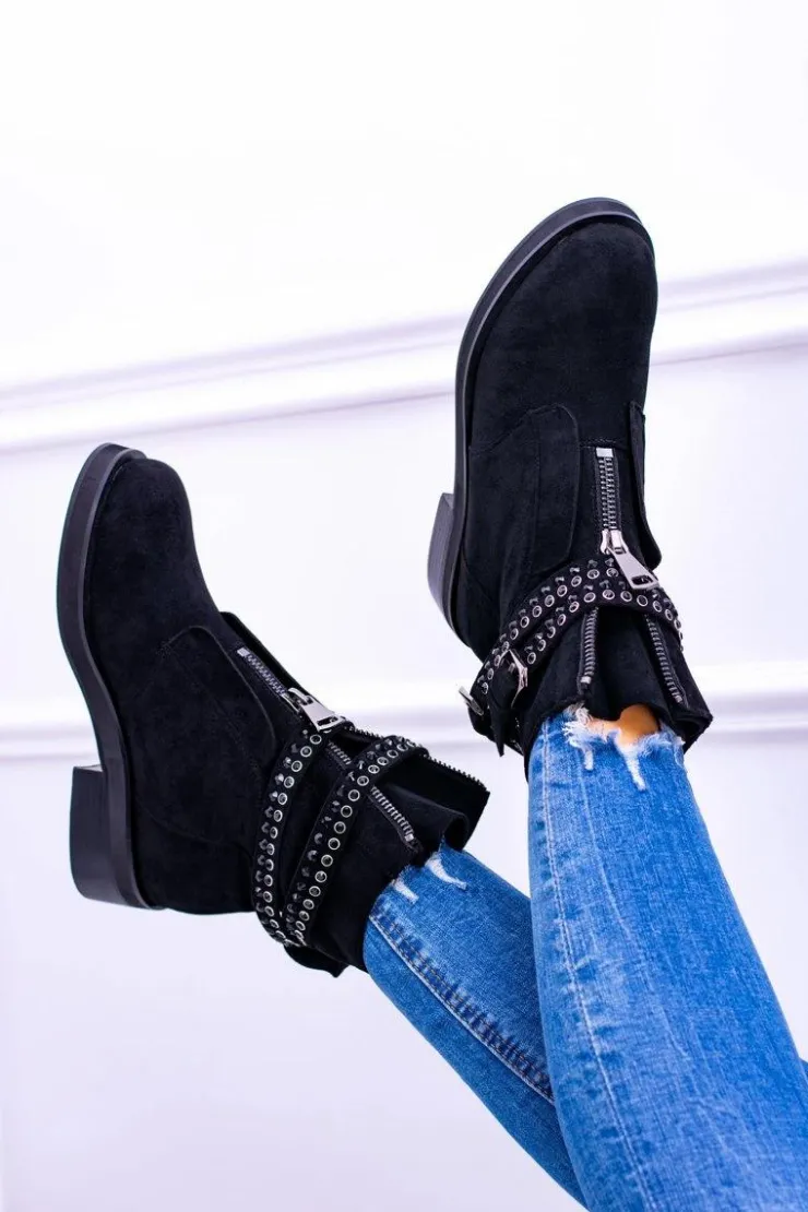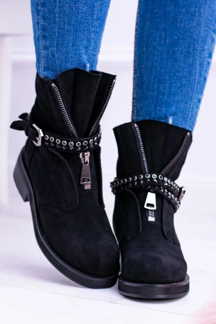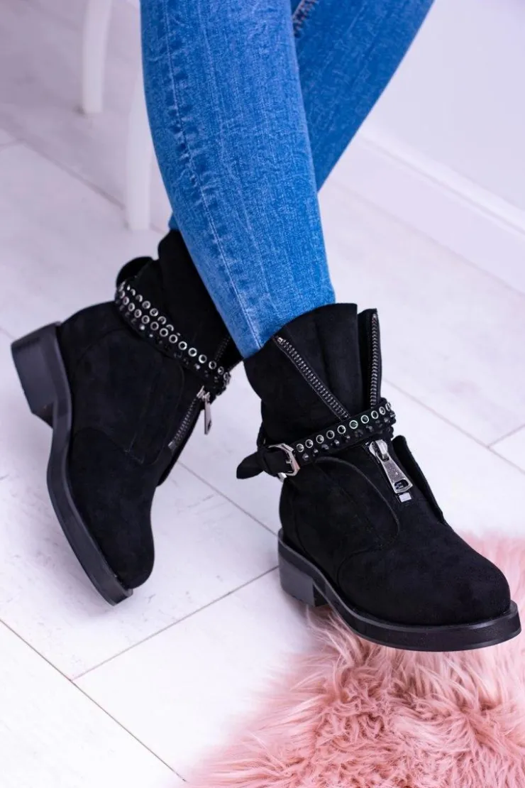 Boto Botki Płaskie|Czarne Botki*Lu Boo Czarne Damskie Botki Suwak Cekiny Rafell
