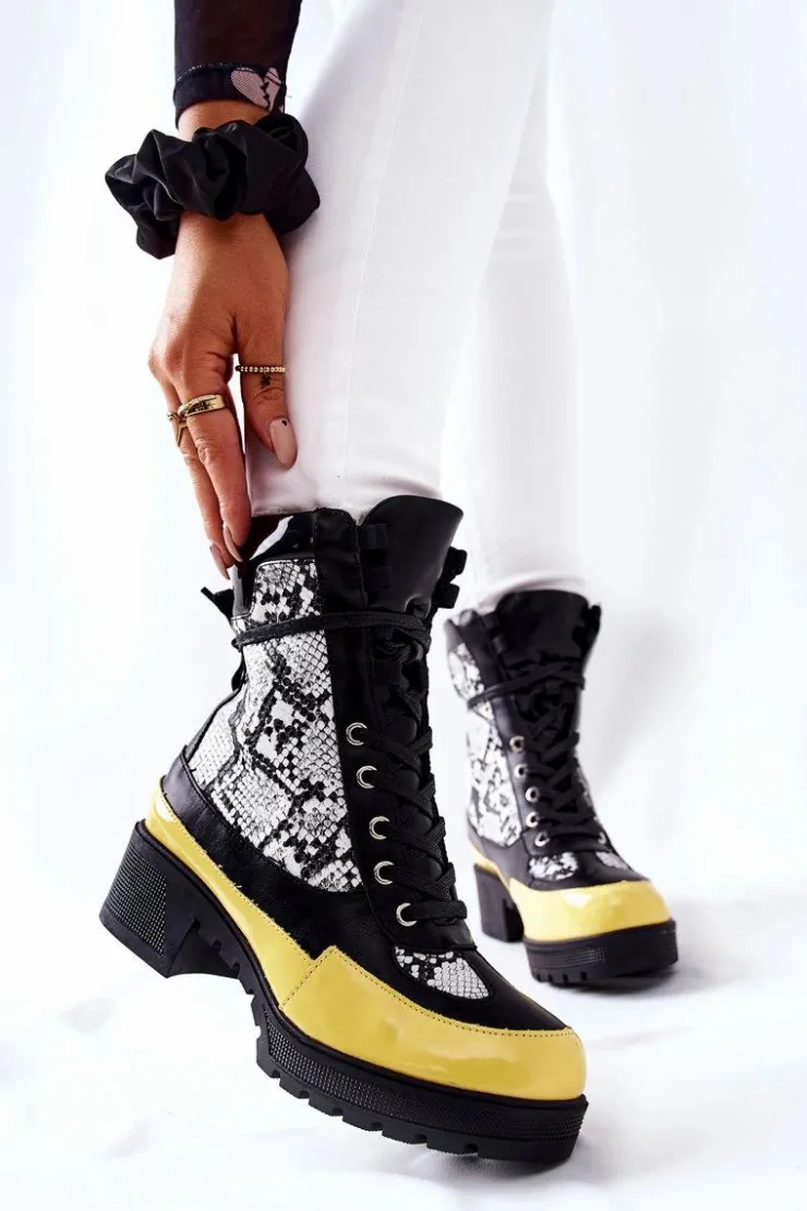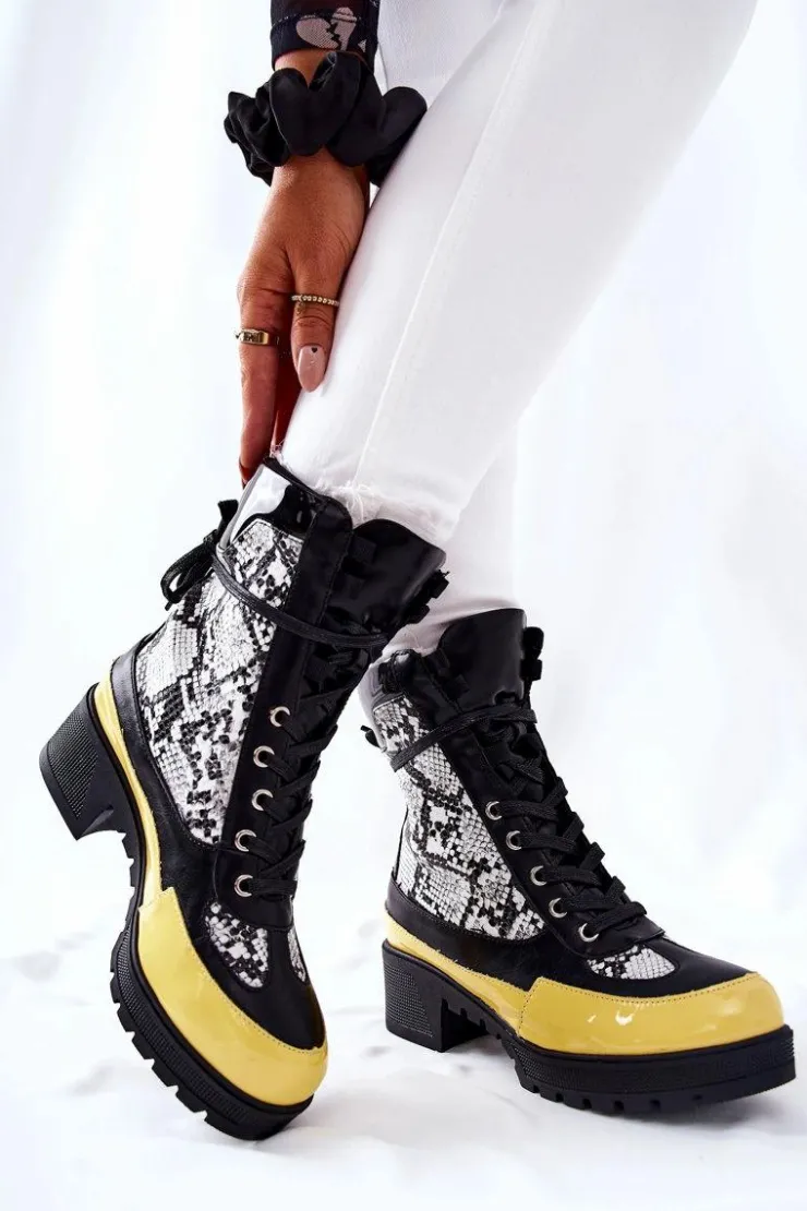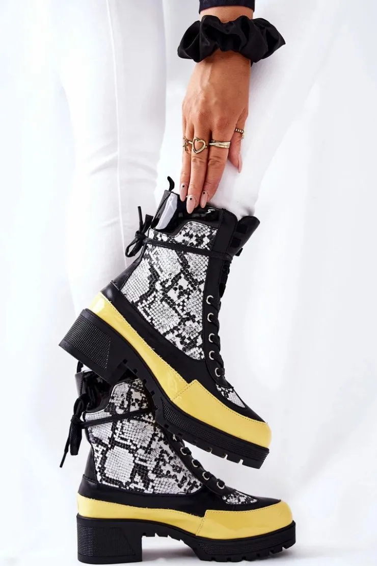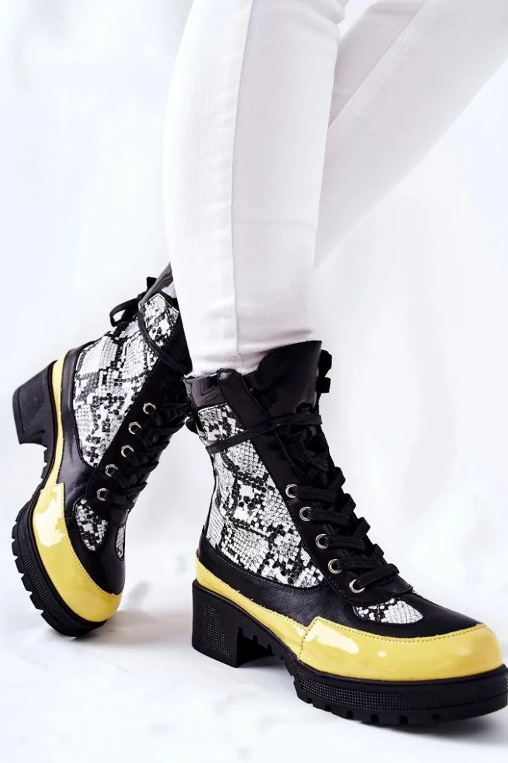 Botki wykonane z eko skóry, natomiast na górze cholewki oraz przy podeszwie są wykonane z lakierowanej eko skóry. Posiadają wiązanie. Delikatny obcas w postaci słupka subtelnie uniesie sylwetkę. Świetny model, który doda Twoim stylizacjom charakteru! Musisz je mieć! Przy wyborze rozmiaru prosimy sugerować się tabelą rozmiarów.