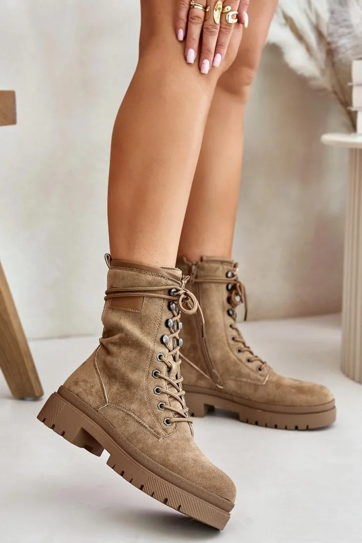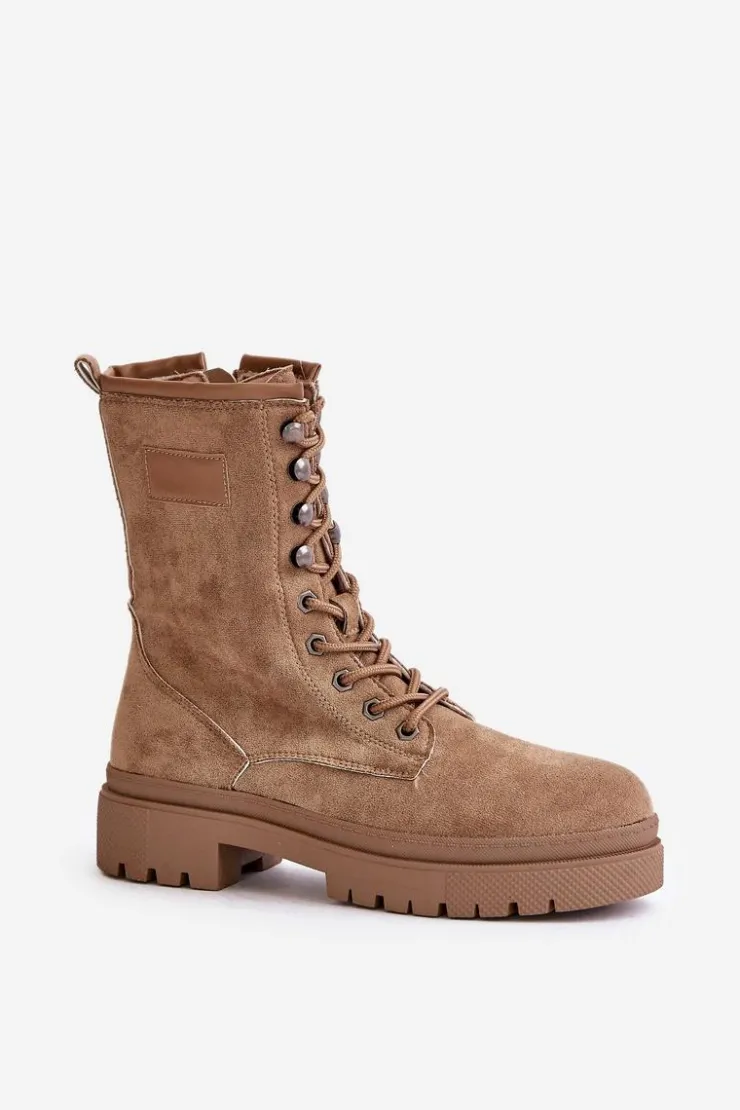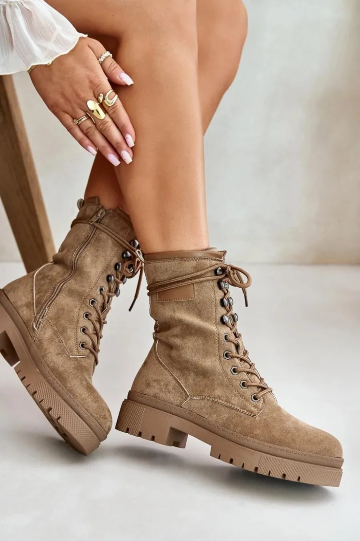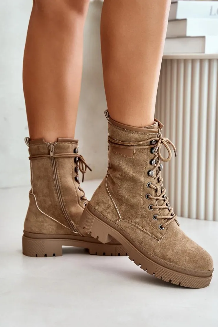 Workery damskie wykonane z eko zamszu. Osadzone na płaskim obcasie. Noski zaokrąglone. Zapinane na zamek oraz sznurowane. Klasyczny, modny fason, który dopełni wiele jesiennych stylizacji! Przy wyborze rozmiaru prosimy sugerować się tabelą rozmiarów.