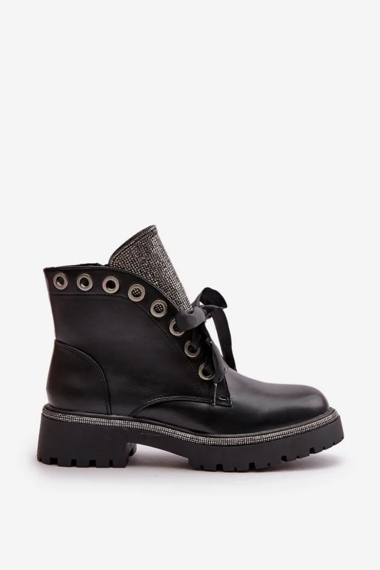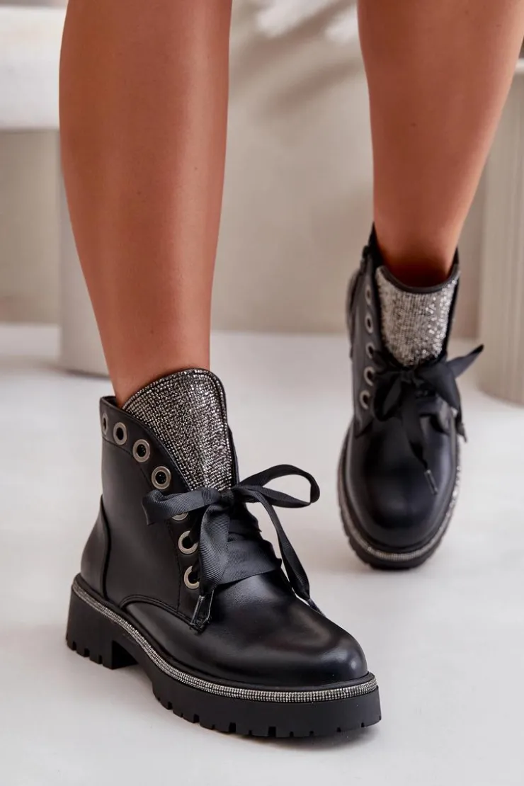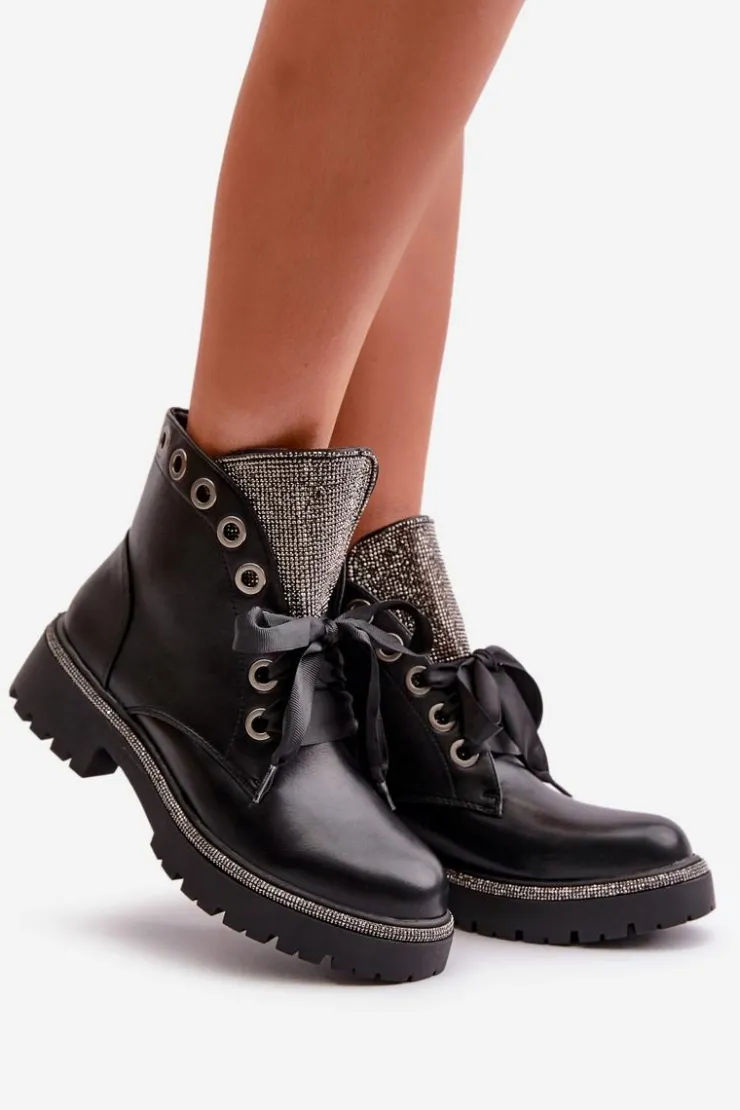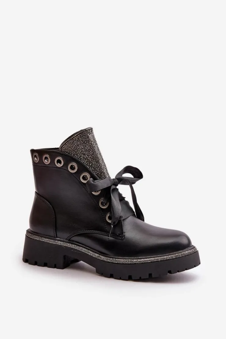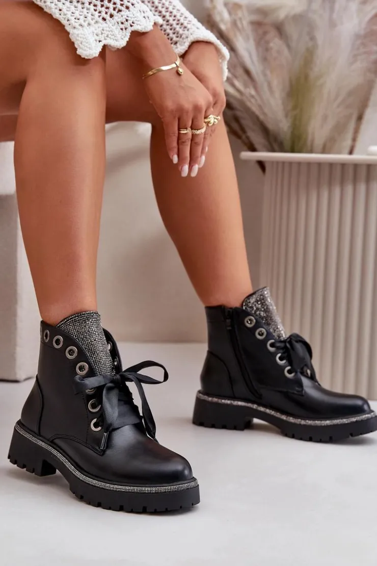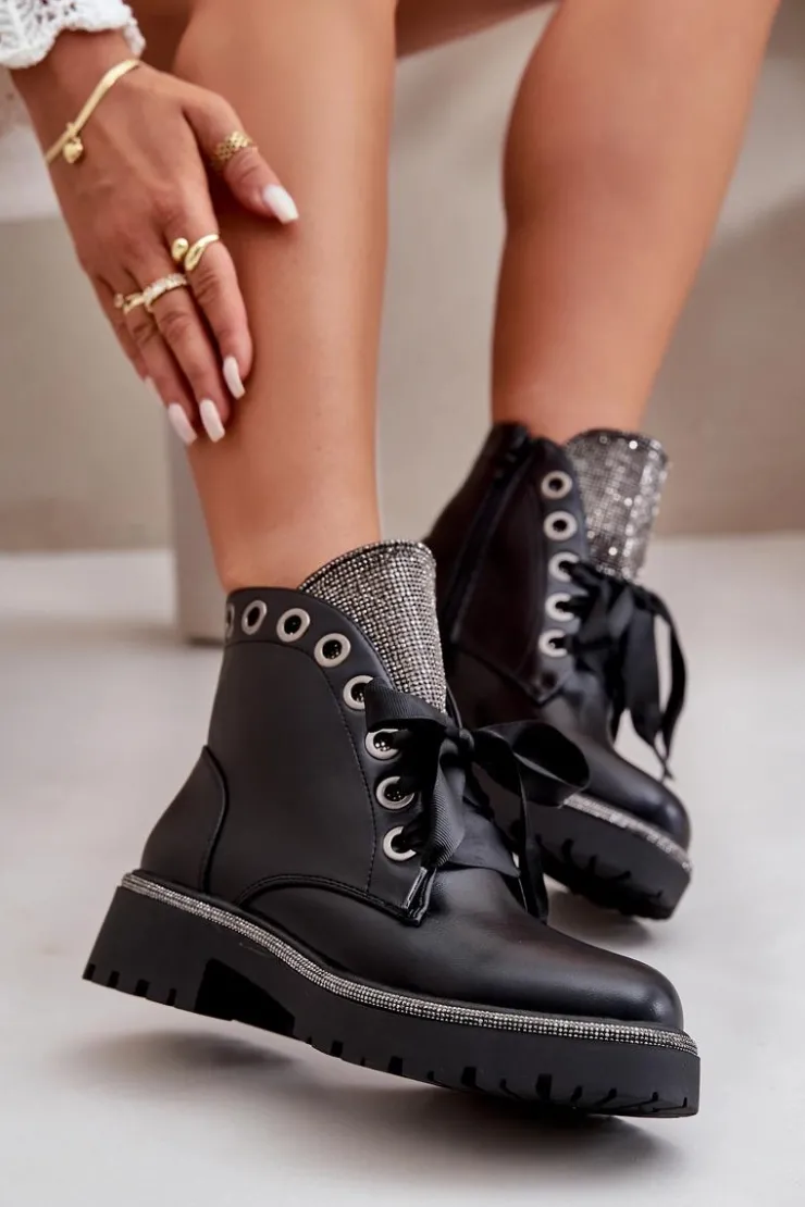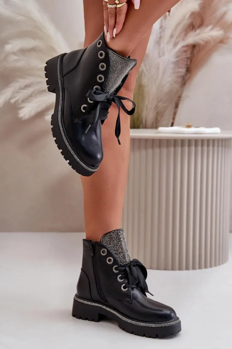 Botki damskie wykonane z eko zamszu. Osadzone na płaskim obcasie. Zapinane na zamek oraz wzbogacone sznurowaniem. Model ten wyróżnia się błyszczącym zdobieniem ja języku i przy podeszwie. Noski zaokrąglone. Środek ocieplony kocem obuwniczym. Przy wyborze rozmiaru prosimy sugerować się tabelą rozmiarów.
