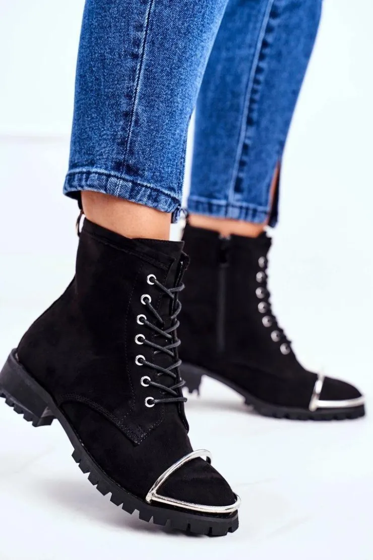 Boto Botki Sznurowane|Botki Workery*Botki Damskie Lu Boo Czarne Zamszowe Workery ze Stalową Oprawą Jacksy