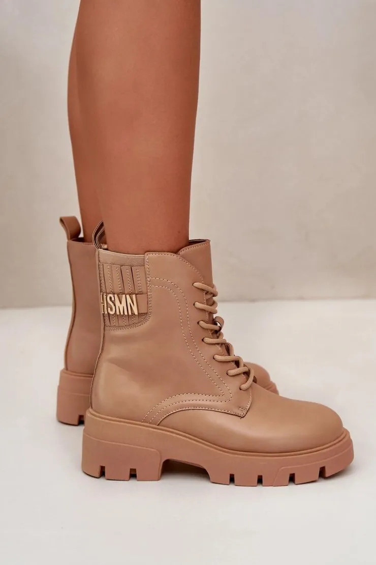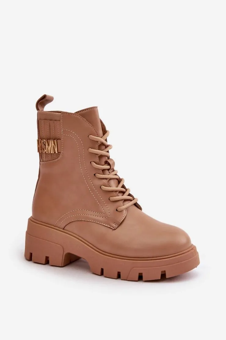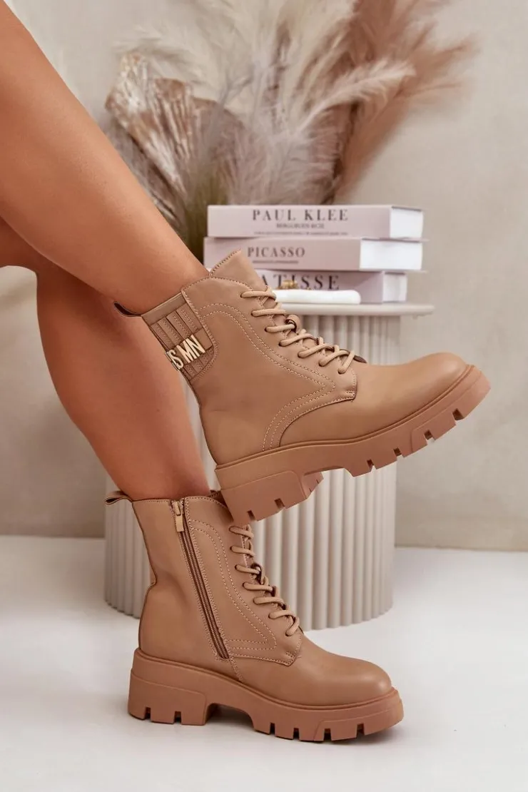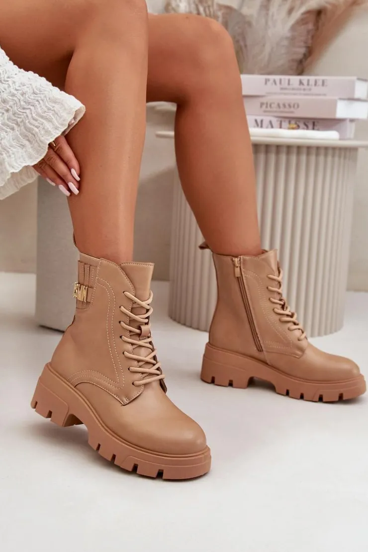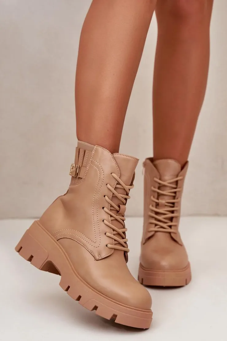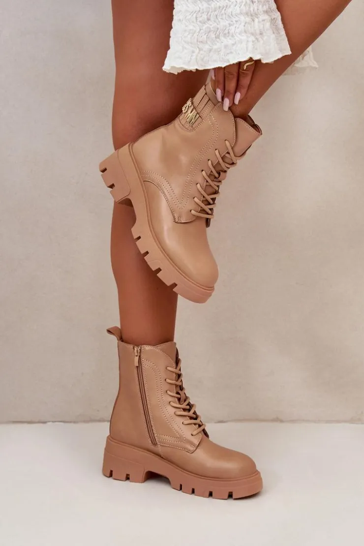 Botki damskie w kolorze beżowym, idealne na każdą porę roku. Wykonane z wysokiej jakości skóry ekologicznej, gwarantują trwałość i odporność na zmienne warunki pogodowe. Masywna, gumowa podeszwa z głębokim bieżnikiem zapewnia doskonałą przyczepność, co jest nieocenione podczas chodzenia po śliskich lub nierównych powierzchniach. Stylowe sznurowanie umożliwia idealne dopasowanie, a dodatkowy zamek błyskawiczny na boku ułatwia zakładanie i zdejmowanie butów. Eleganckie przeszycia dodają charakteru, a dyskretna, wytłaczana nazwa marki na górnej części cholewki podkreśla ekskluzywny charakter produktu. Te botki będą wyjątkowym dodatkiem do każdej stylizacji, od casualowych jeansów po bardziej formalne, miejskie outfity.Przy wyborze rozmiaru prosimy sugerować się tabelą rozmiarów.