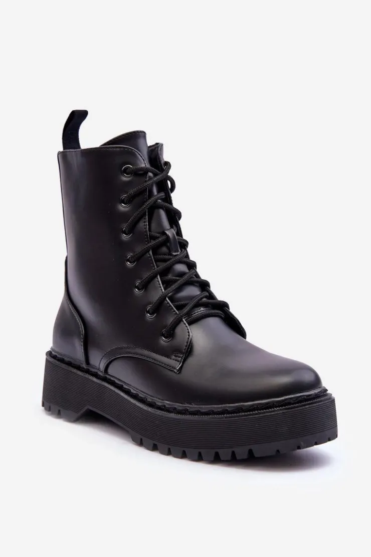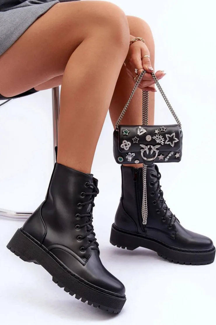 Modne damskie botki zostały wykonane z eko skóry. Płaski obcas oraz platforma zapewnią stabilność na każdym kroku. Zapinane są z boku cholewki na zamek oraz dodatkowo sznurowane. Zapiętek w tym obuwiu jest usztywniany. Ocieplone kocem obuwniczym. Świetny model do jesiennych i zimowych stylizacji! Przy wyborze rozmiaru prosimy sugerować się tabelą rozmiarów.