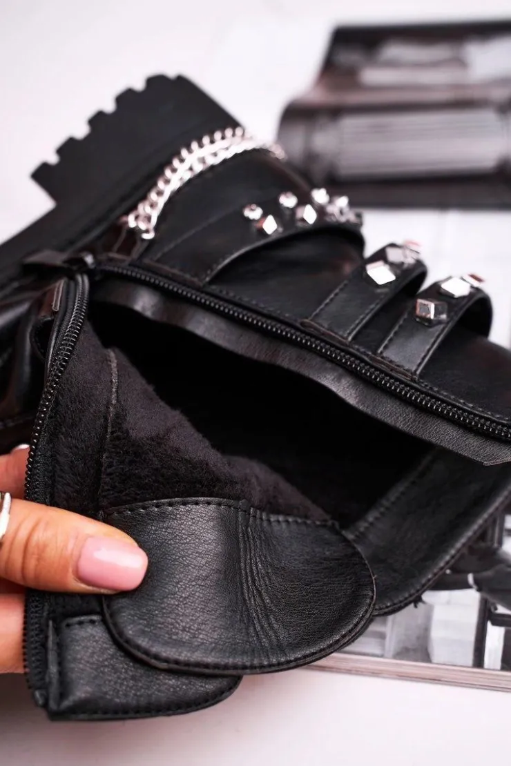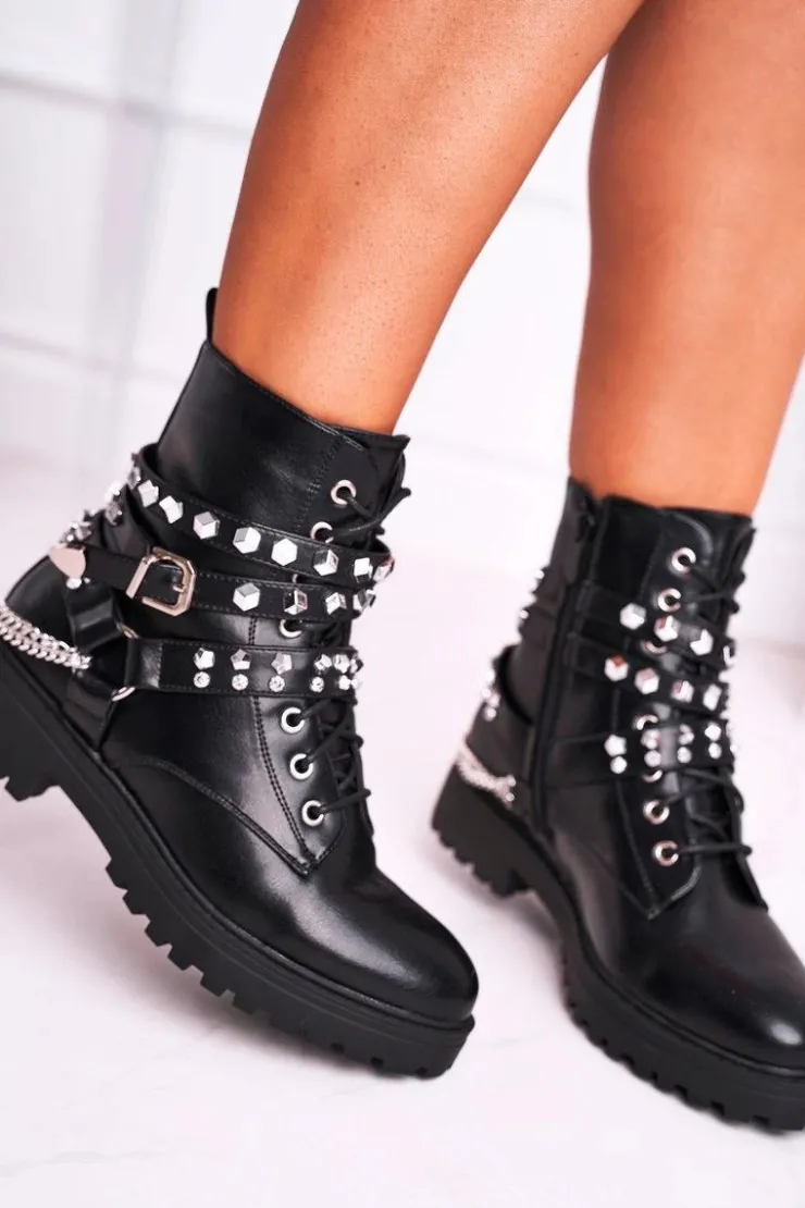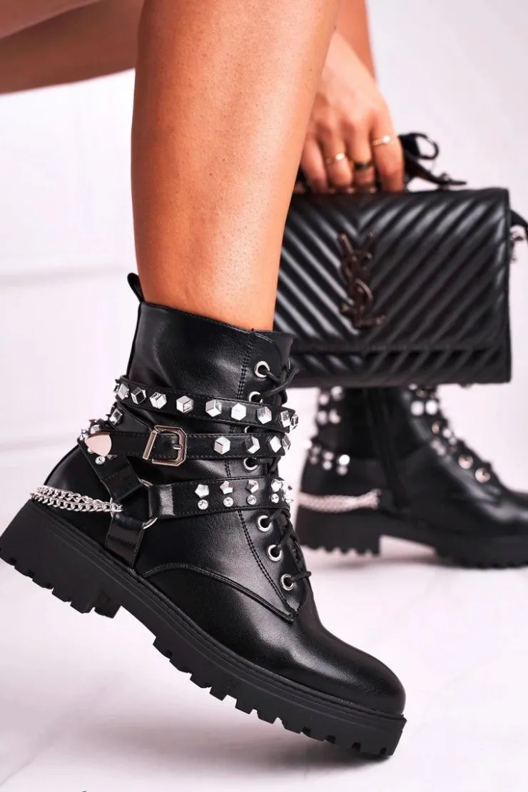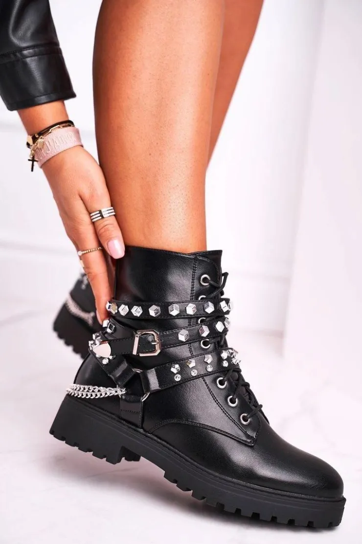 Boto Botki Sznurowane|Czarne Botki*Botki Damskie Ciepłe Dżety Łańcuchy Czarne Desire
