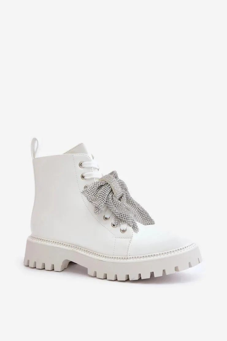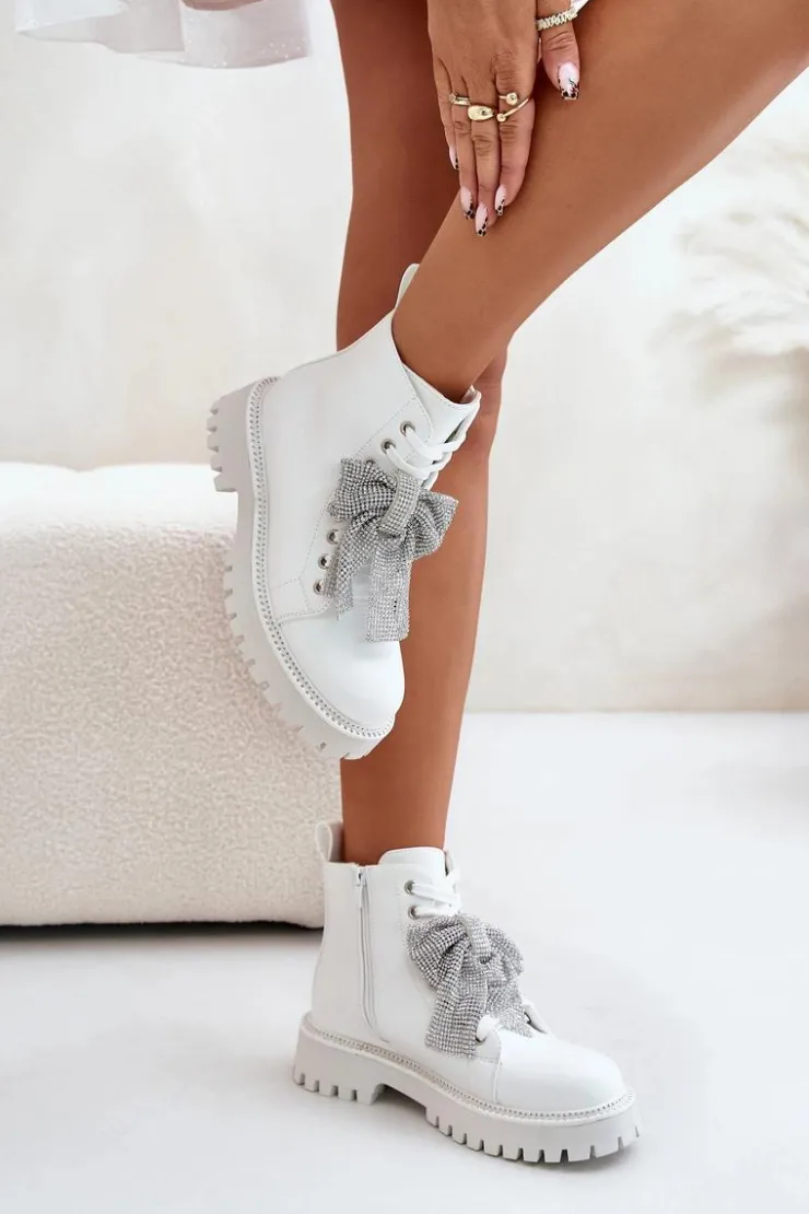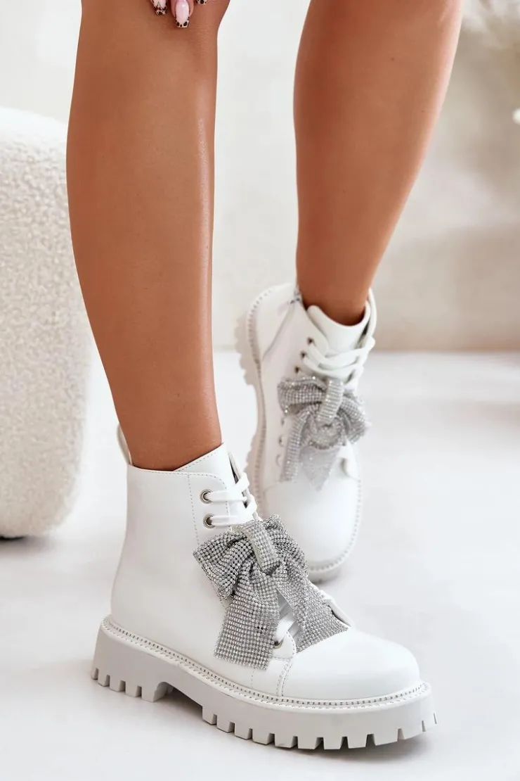 Botki na płaskim obcasie łączą w sobie wygodę i styl, idealnie wpisując się w codzienne i wyjątkowe stylizacje. Zaokrąglone noski nadają im klasyczny wygląd. Zapięcie na zamek ułatwia szybkie zakładanie, a dodatkowe sznurowanie pozwala na idealne dopasowanie do stopy. Główną zaletą tego modelu jest kokarda z cyrkoniami umieszczona z przodu, która dodaje eleganckiego i kobiecego akcentu, przyciągając wzrok i podkreślając wyjątkowość tego obuwia. Przy wyborze rozmiaru prosimy sugerować się tabelą rozmiarów.