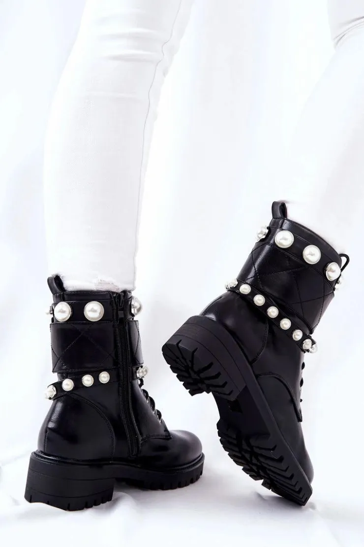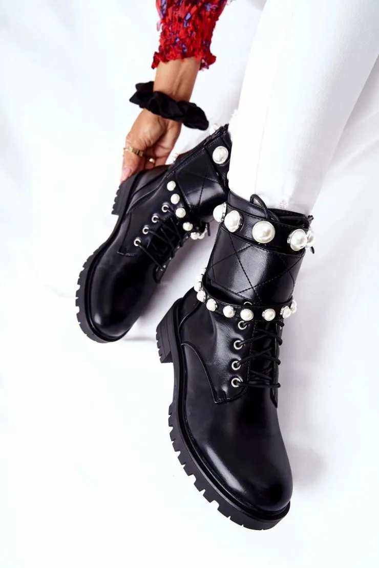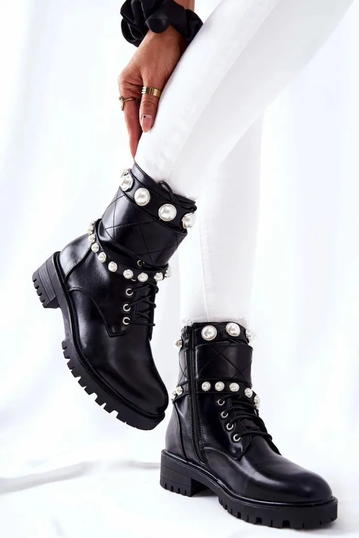 Boto Botki Sznurowane|Czarne Botki*Botki Damskie Z Perełkami Czarne Mystique