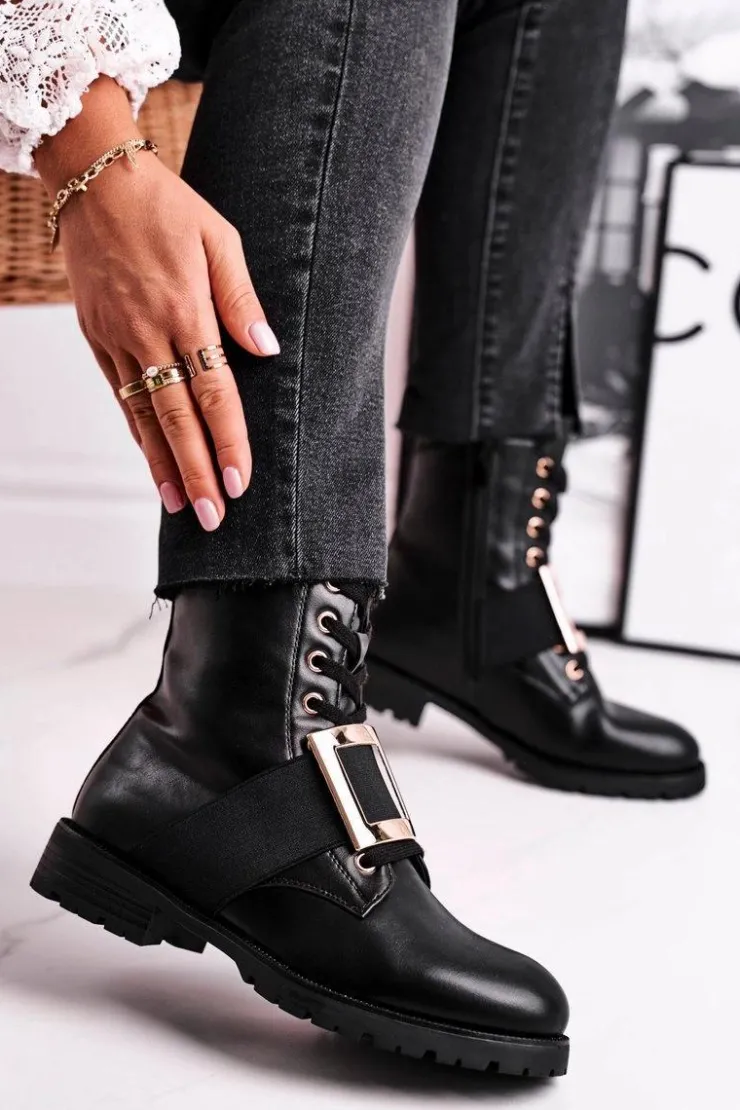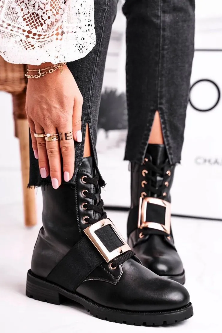Boto Botki Sznurowane|Czarne Botki*Botki Damskie Ze Złotą Klamrą Happy Su Czarne