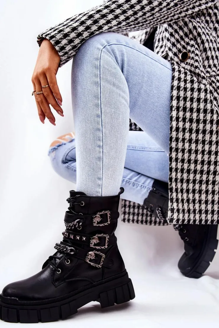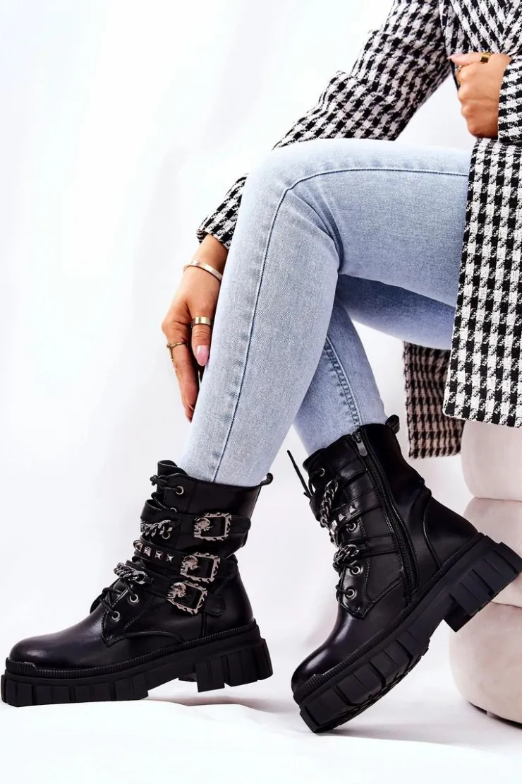 Boto Botki Sznurowane|Czarne Botki*Botki Wiązane Łańcuch Sprzączka Czarne Reiloy
