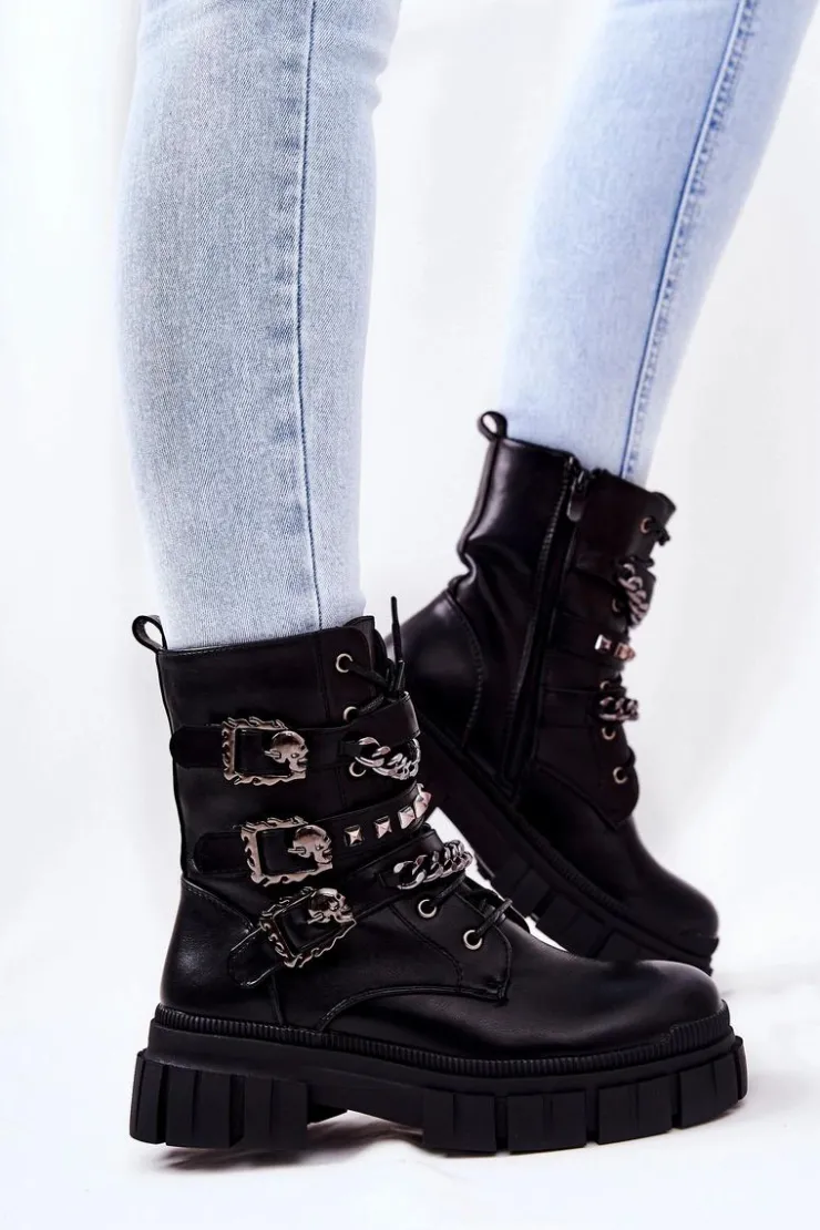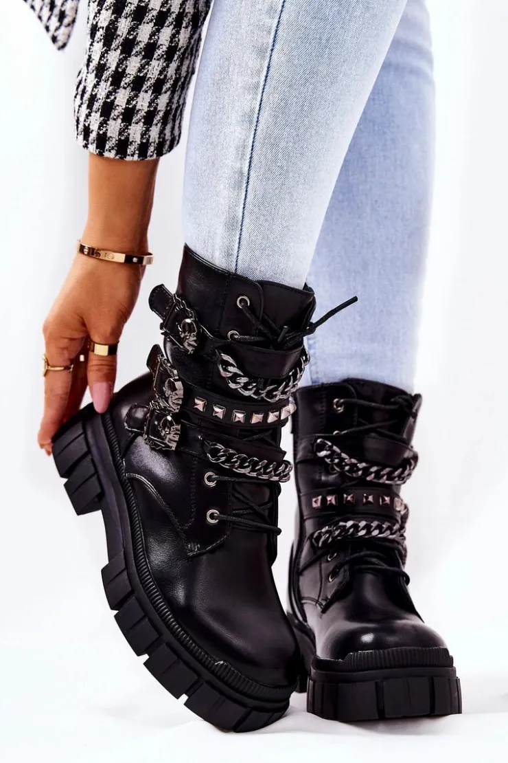 Wyjątkowe botki wykonane ze skóry ekologicznej. Posiadają wiązanie oraz suwak ułatwiający zakładanie obuwia. Z boku cholewki znajdują się sprzączki z motywem czaszki, na które są zapinane paski z ozdobnymi łańcuszkami i ćwiekami. Świetne botki, które nadadzą charakteru Twojej stylizacji! Przy wyborze rozmiaru prosimy sugerować się tabelą rozmiarów.
