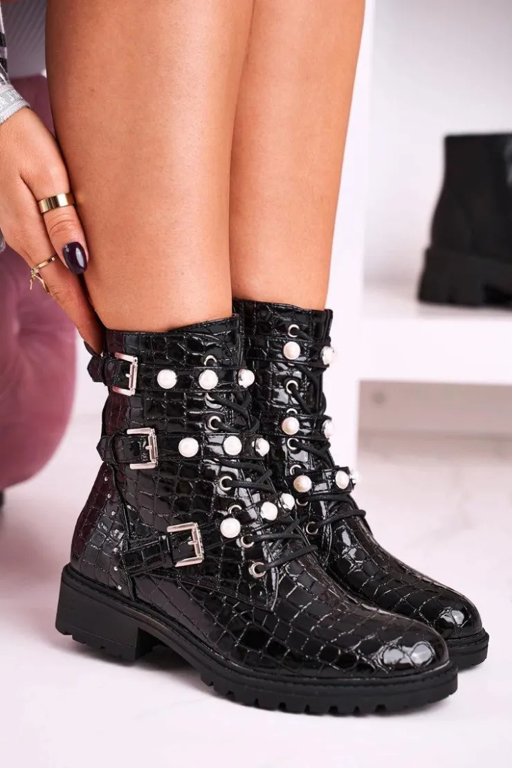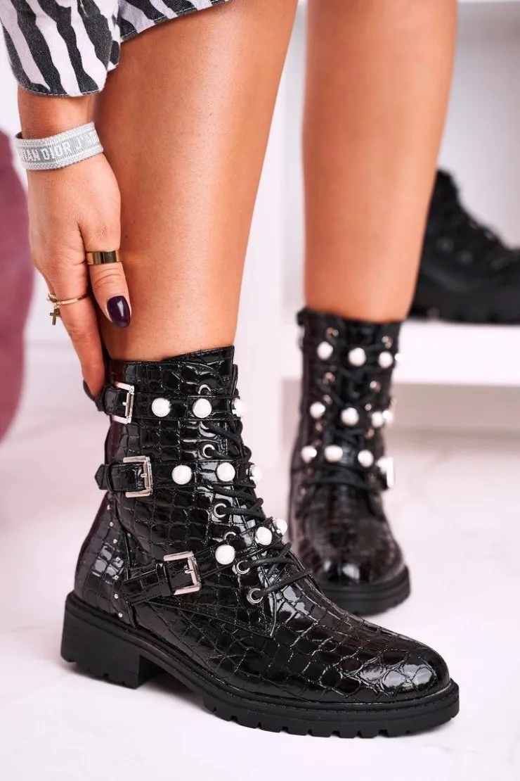 Boto Botki Sznurowane|Czarne Botki*Botki Z Perełkami Lakierowane Czarne Motyw Zwierzęcy Whitney