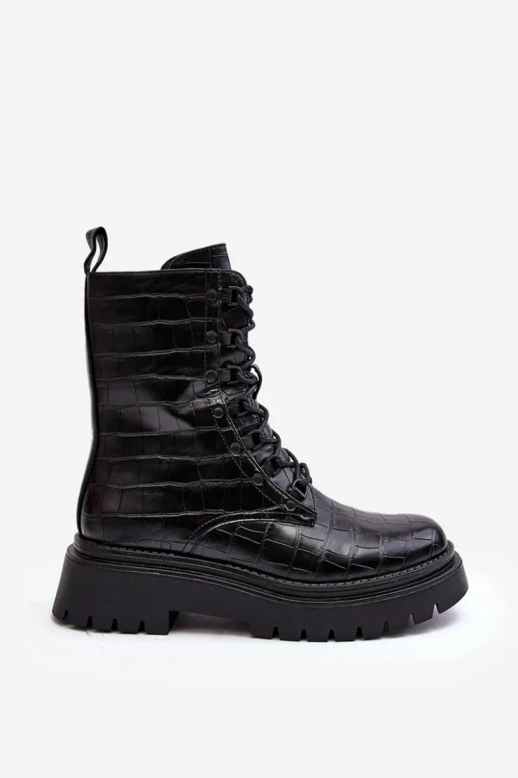 Botki damskie wykonane z eko skóry. Osadzone na płaskim obcasie oraz grubej podeszwie, co gwarantuje stabilność i komfort noszenia. Zamek z boku cholewki oraz dodatkowe sznurowanie, zapewnia idealne dopasowanie. Noski zaokrąglone. Środek ocieplony kocem obuwniczym. Doskonale sprawdzą się w różnych jesienno-zimowych stylizacjach! Przy wyborze rozmiaru prosimy sugerować się tabelą rozmiarów.
