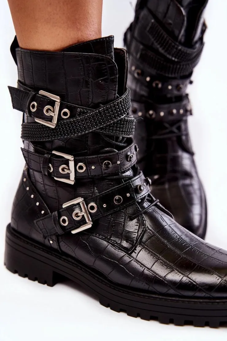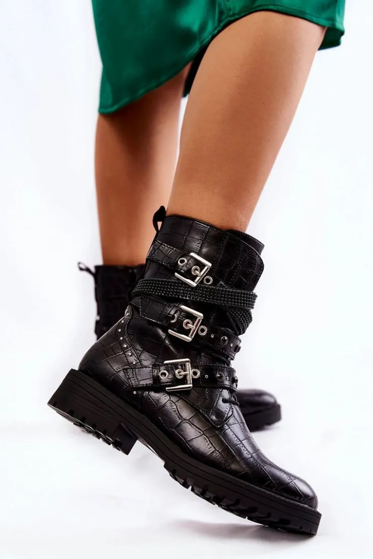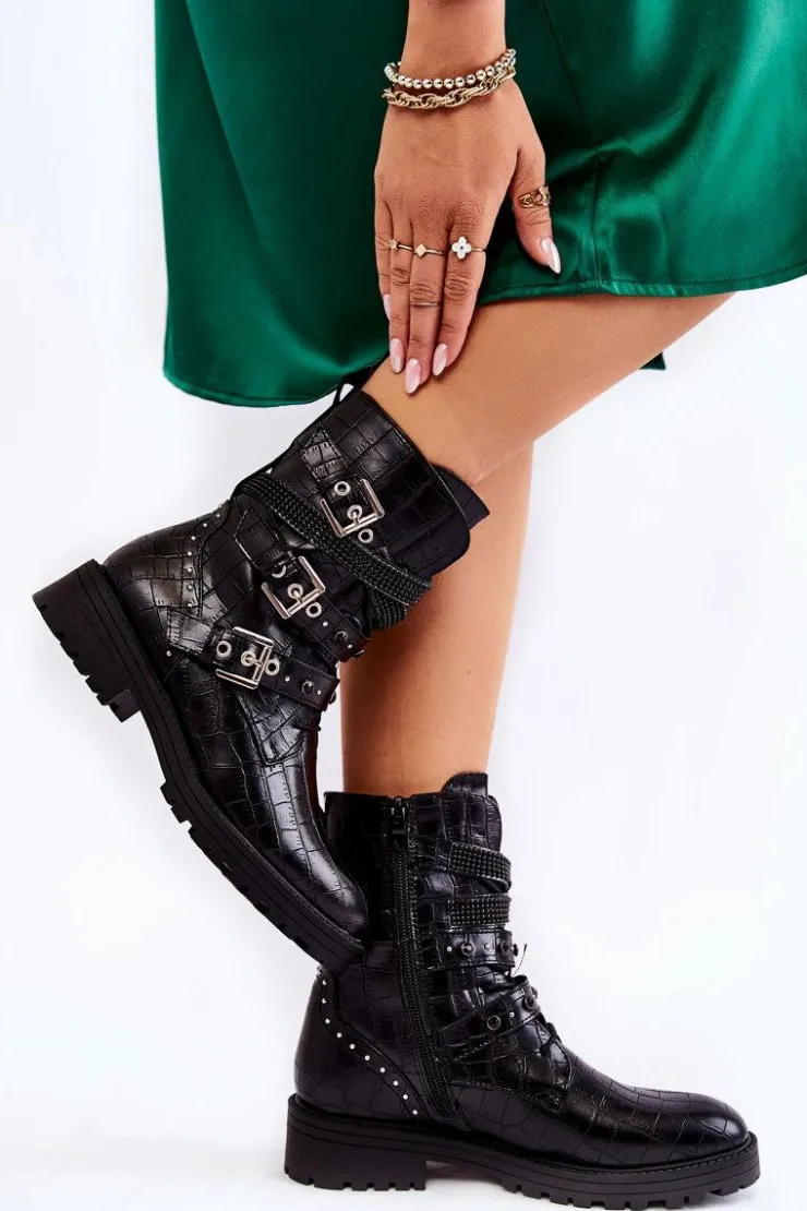Botki damskie zostały wykonane z eko skóry. Posiadają modne, regulowane paski z ozdobnymi dżetami i koralikami. Osadzone na płaskim obcasie ze żłobieniami. Model ze sznurowaniem oraz suwakiem z boku cholewki. Botki te posiadają ocieplenie w postaci koca obuwniczego. Dodatkowo zapiętek jest usztywniany. Te botki powinny znaleźć się w Twojej szafie! Przy wyborze rozmiaru prosimy sugerować się tabelą rozmiarów.