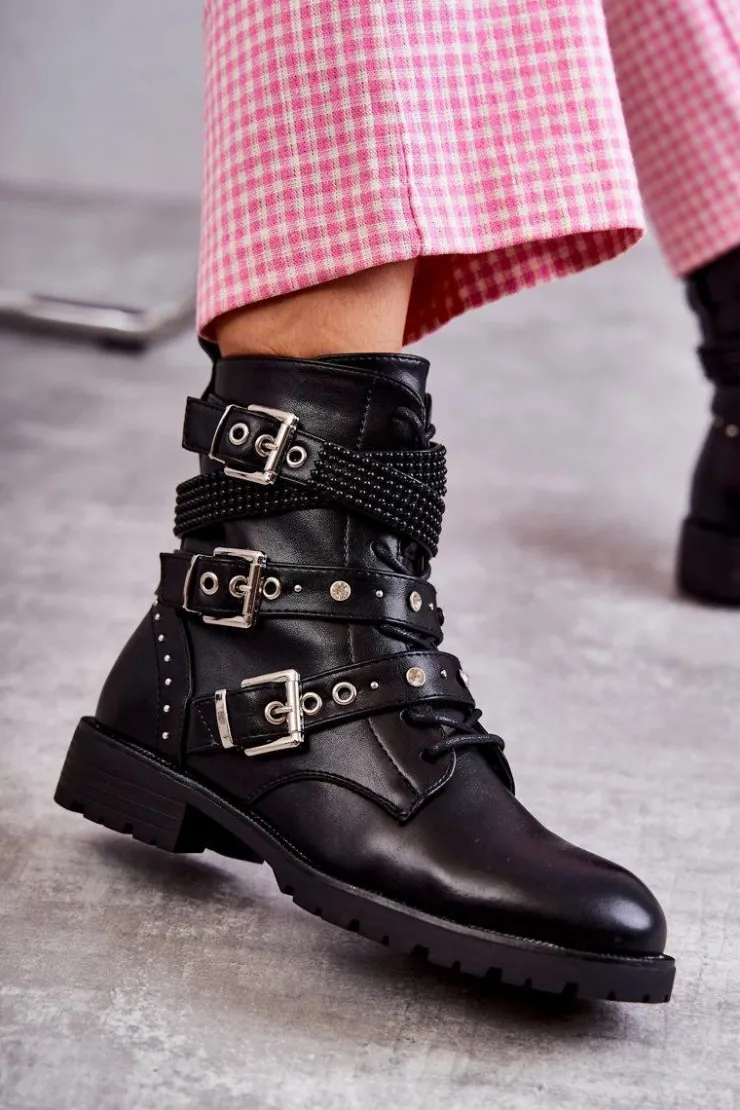 Modne damskie botki zostały wykonane z wierzchu z eko skóry. Na cholewce znajdują się paski z ozdobami w postaci ćwieków. Dodatkowo są one regulowane i posiadają klamry. Model ten jest zapinany na zamek błyskawiczny oraz sznurowany. Wnętrze botków jest pokryte miękkim kocem obuwniczym. Delikatna platforma oraz płaski obcas zapewnią stabilność na każdym kroku. Przy wyborze rozmiaru prosimy sugerować się tabelą rozmiarów.
