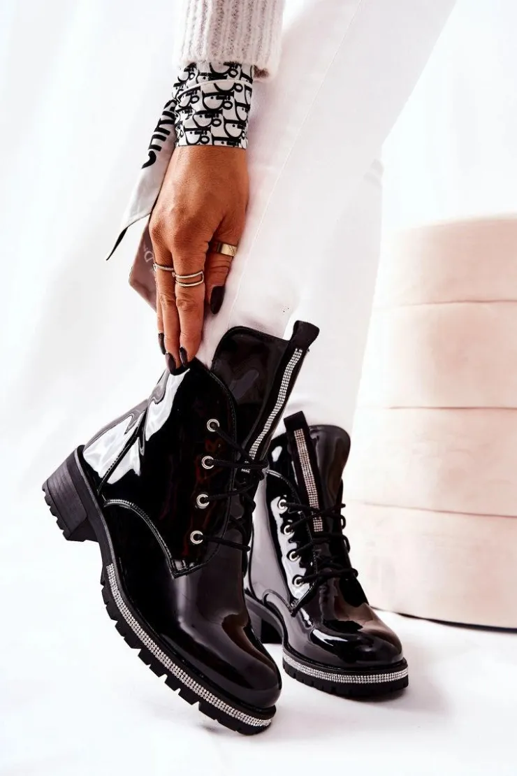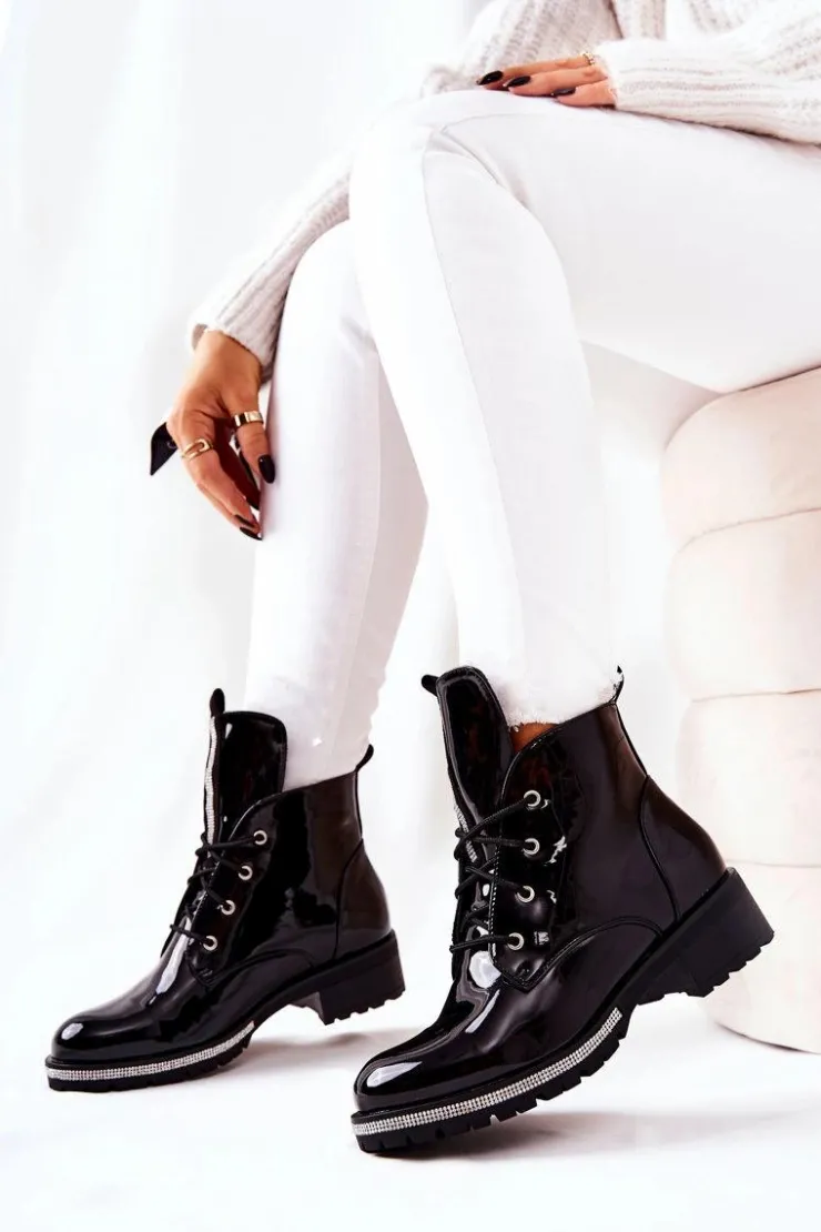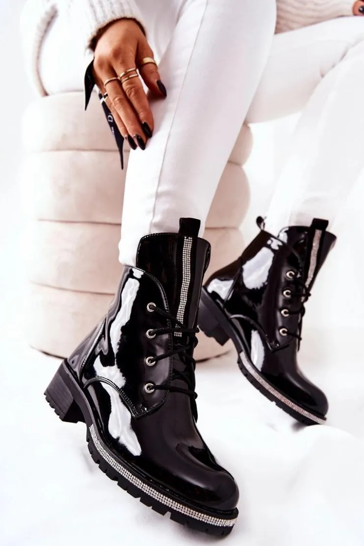 Eleganckie botki z lakierowanej skóry ekologicznej. Wnętrze pokryte jest ciepłym i miłym w dotyku kocem obuwniczym – gwarancja komfortu w każdej sytuacji. Na języku oraz przy podeszwie znajdują się ozdobne cyrkonie. Botki są wiązane. Koniecznie sprawdź całą naszą ofertę botków! Przy wyborze rozmiaru prosimy sugerować się tabelą rozmiarów.