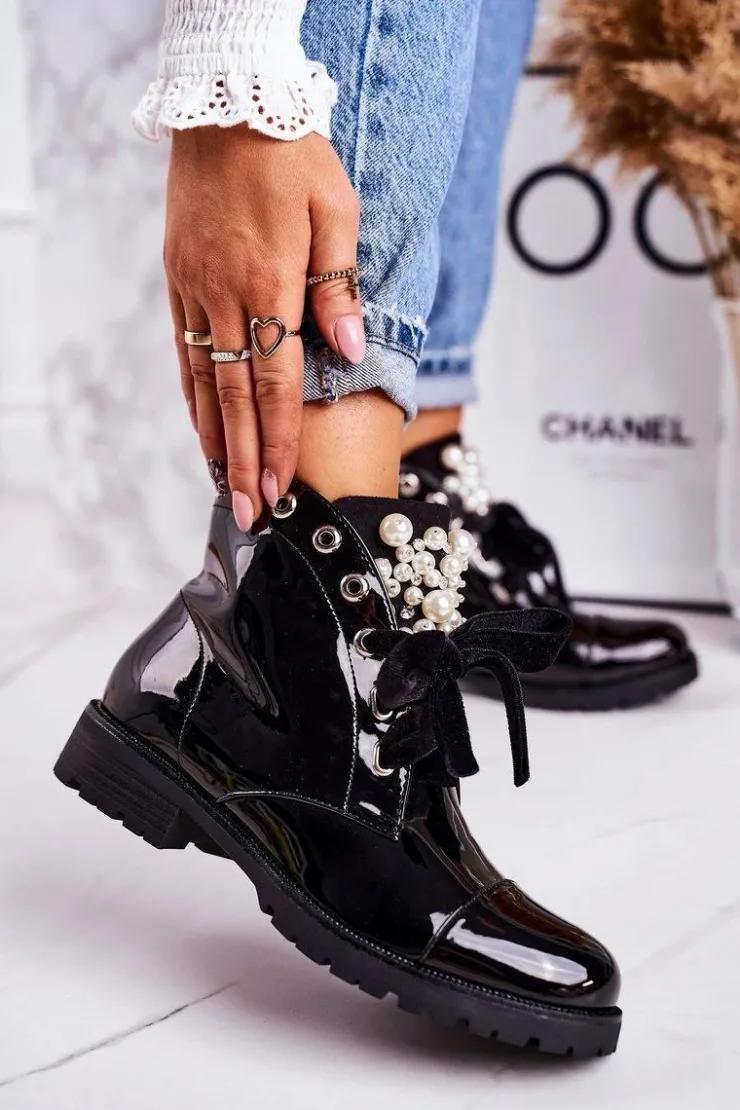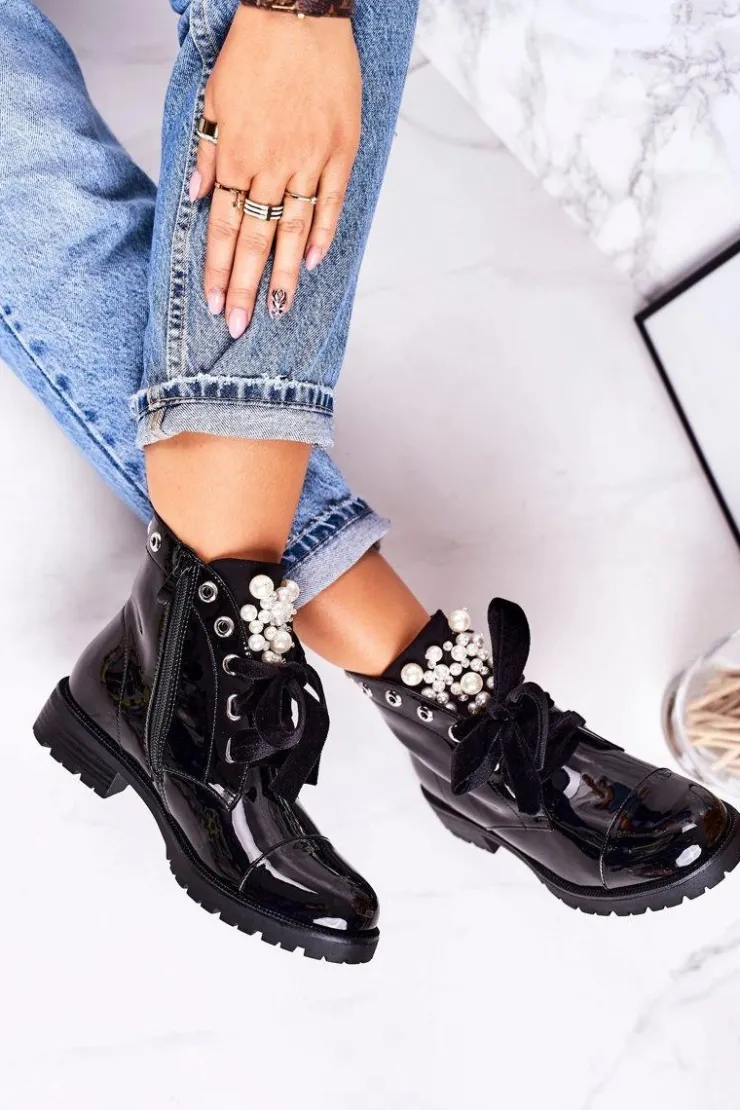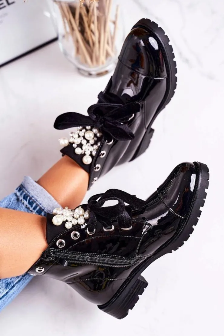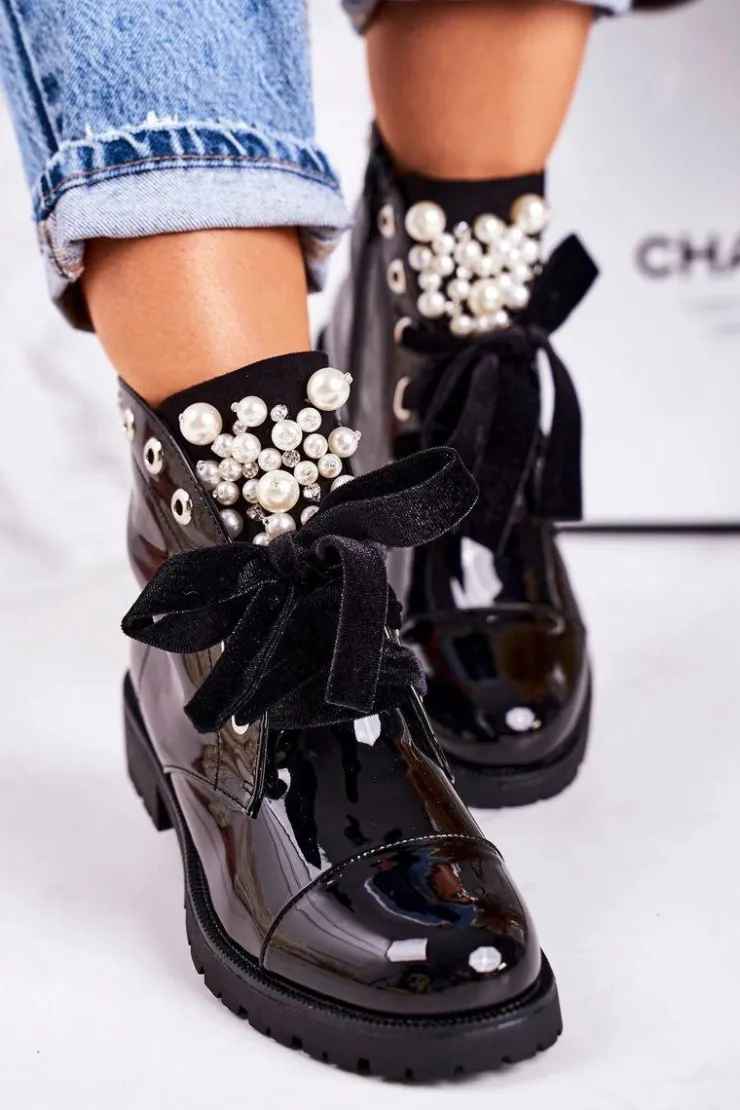 Wyjątkowe botki damskie wykonane z eko skóry. Wnętrze ocieplone jest miłym w dotyku kocem obuwniczym. Model wyróżnia się krojem cholewki oraz ozdobami. Przy wyborze rozmiaru prosimy sugerować się tabelą rozmiarów.