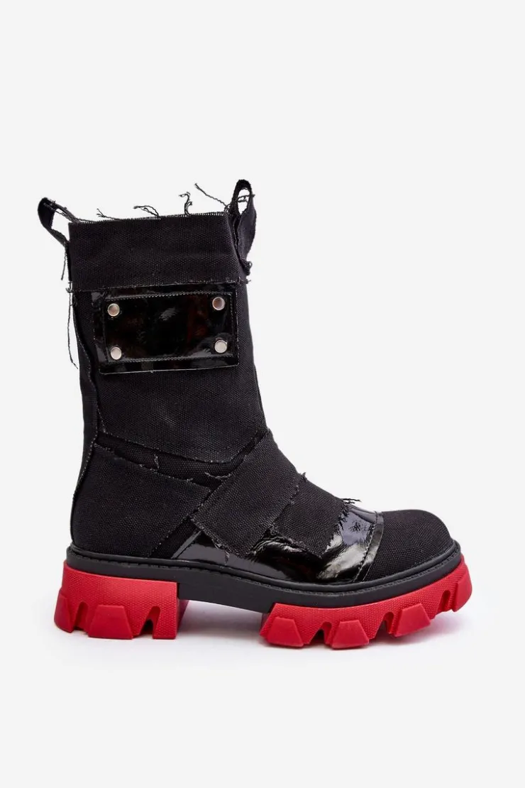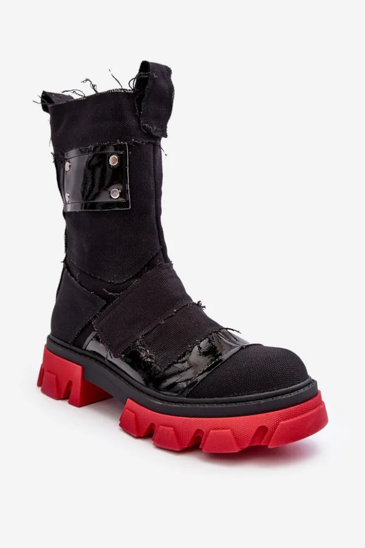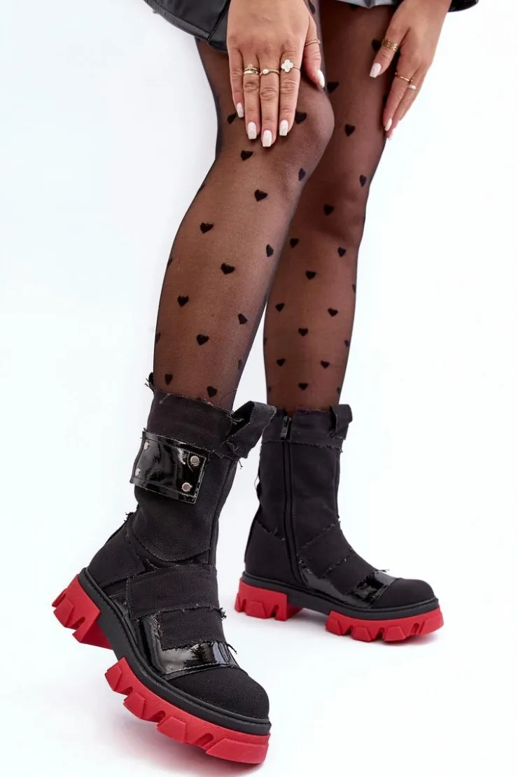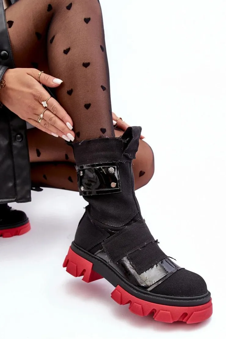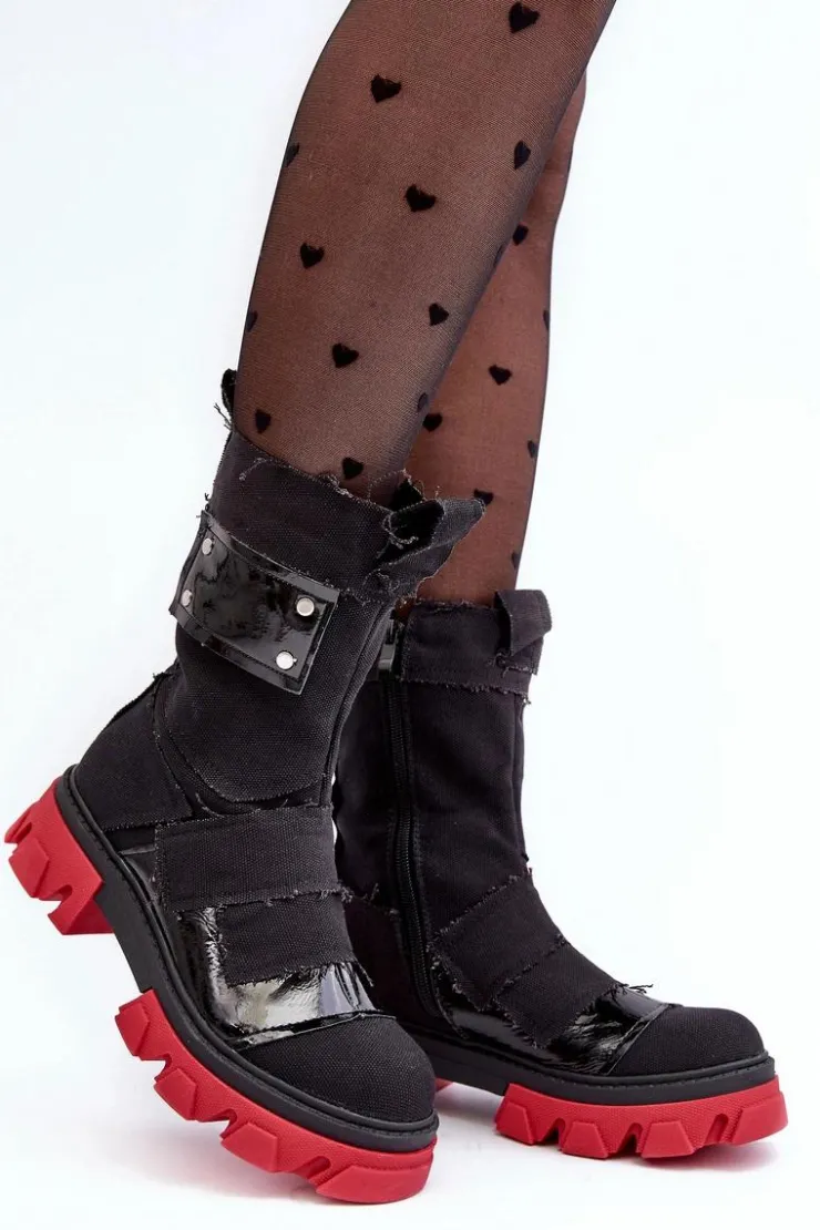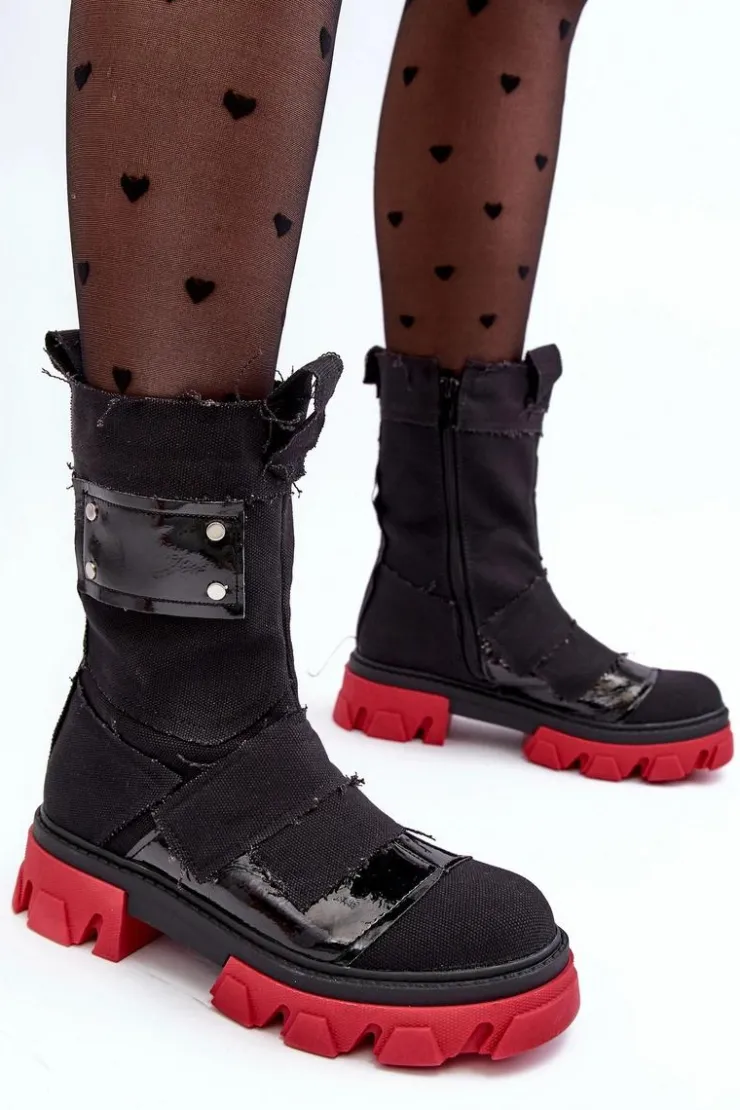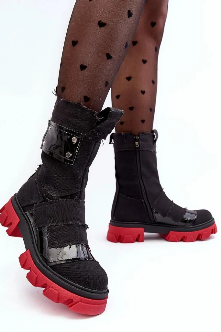 Botki damskie wykonane z połączenia materiału tekstylnego i eko skóry. Osadzone na płaskim obcasie i grubej podeszwie. Noski zaokrąglone. Miękka wkładka z eko skóry zapewni komfort podczas użytkowania. Usztywniony zapiętek. Nieocieplone. Przy wyborze rozmiaru prosimy sugerować się tabelą rozmiarów.