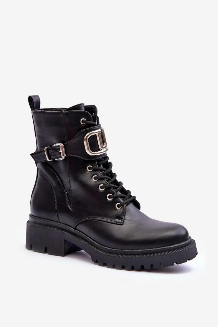 Modne, damskie workery na płaskim, masywnym obcasie i platformie. Wykonane zostały z eko skóry. Model ten zapinany jest na zamek i dodatkowo posiada sznurówki. Na pasku znajduje się ozdoba z tworzywa sztucznego oraz klamra. Świetnie sprawdzą się do wielu stylizacji! Przy wyborze rozmiaru prosimy sugerować się tabelą rozmiarów.