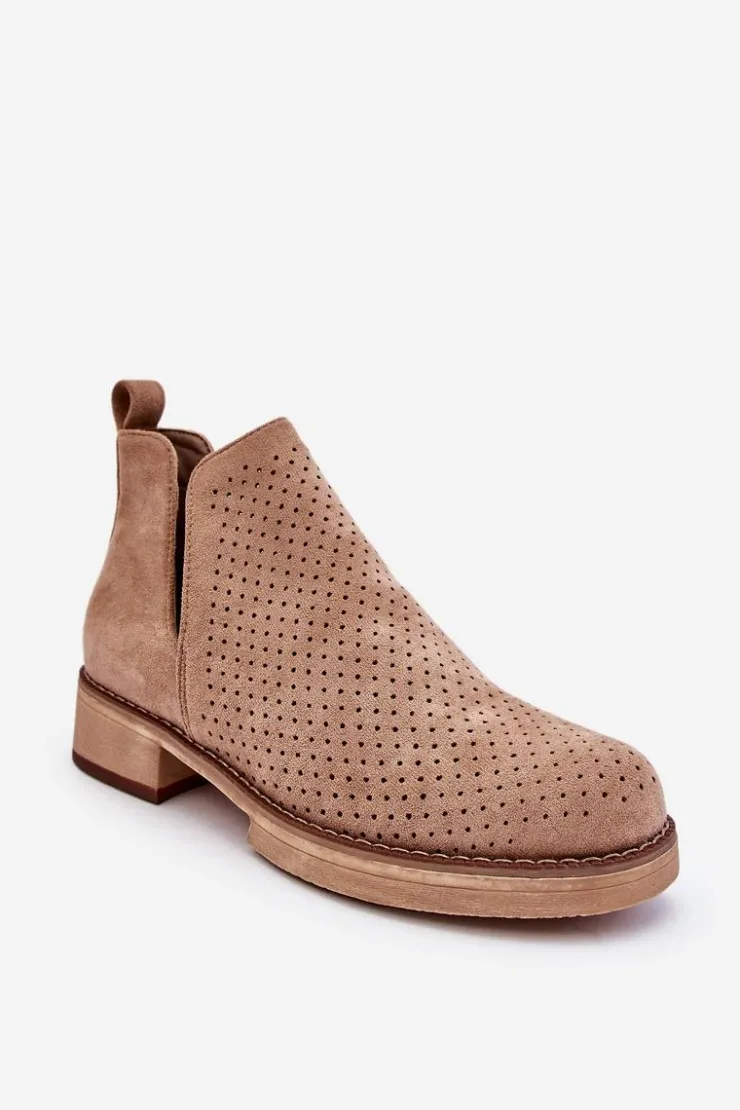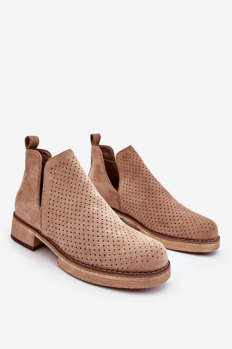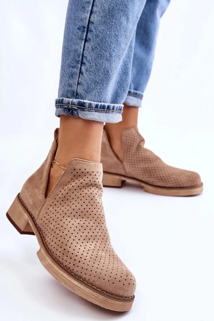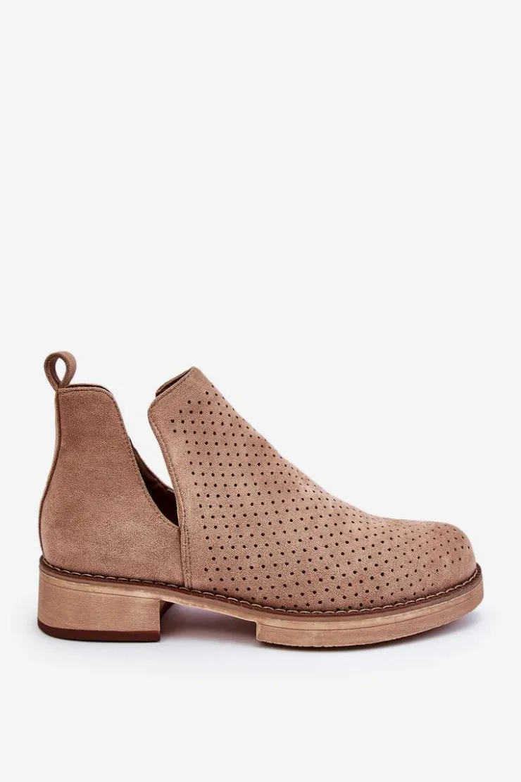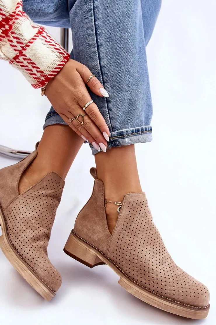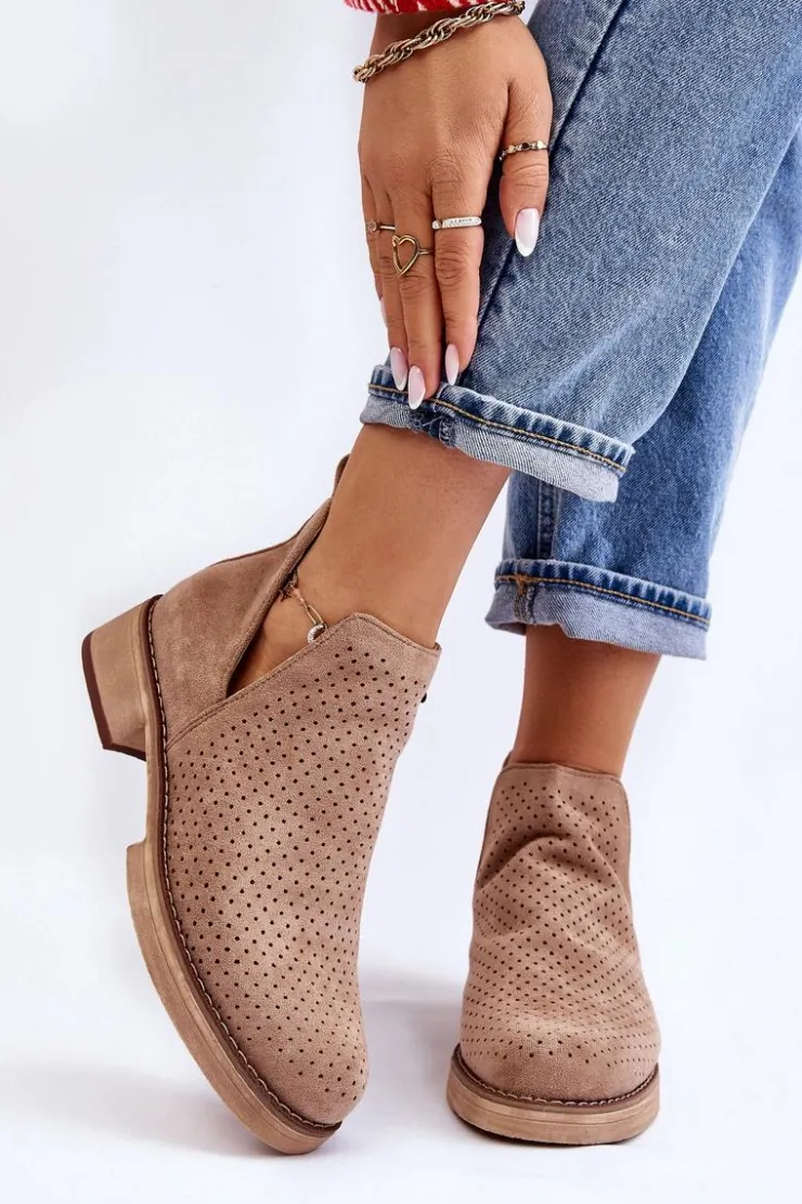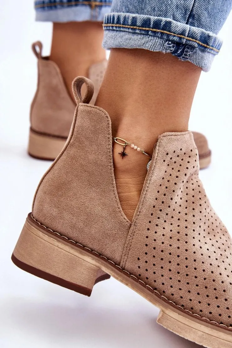 Botki zostały wykonane z eko zamszu w ażurowy wzór. Idealnie pasują do wielu kobiecych stylizacji. Miękka wkładka została wykonana z eko skóry. Model klasycznie wsuwany. Botki zostały osadzone na delikatnej platformie i płaskim obcasie. Świetnie sprawdzą się w sezonie wiosenno-letnim. Koniecznie musisz je mieć! Przy wyborze rozmiaru prosimy sugerować się tabelą rozmiarów.