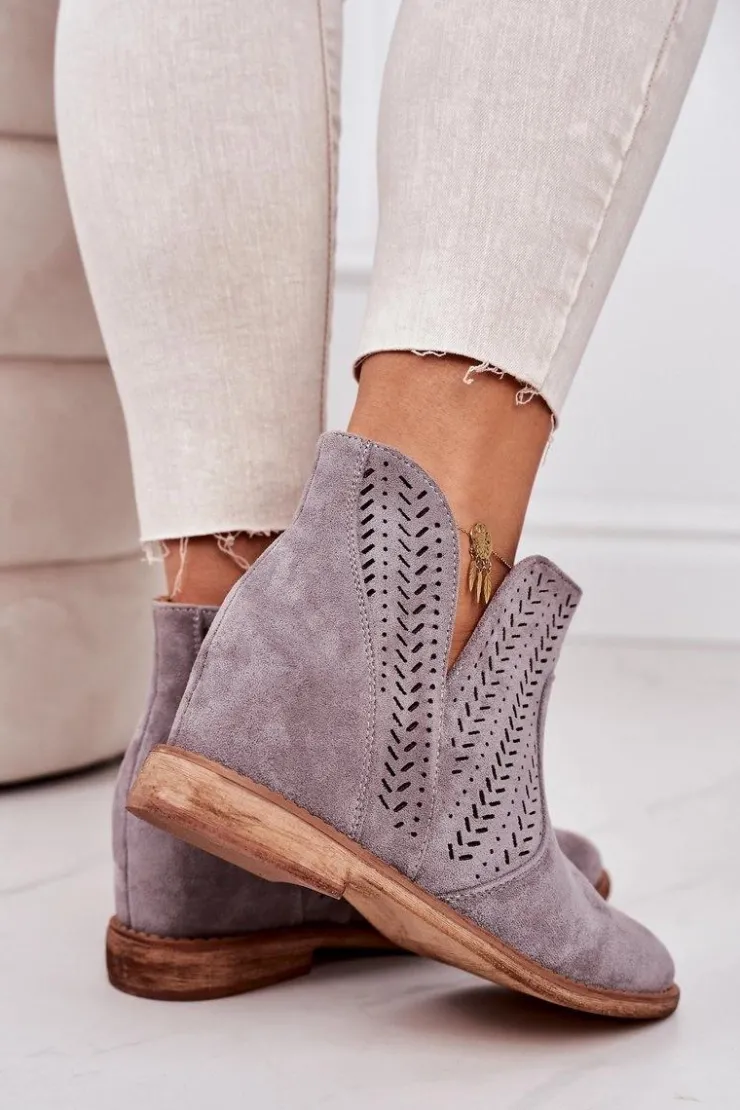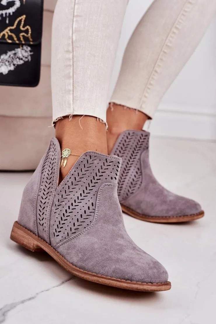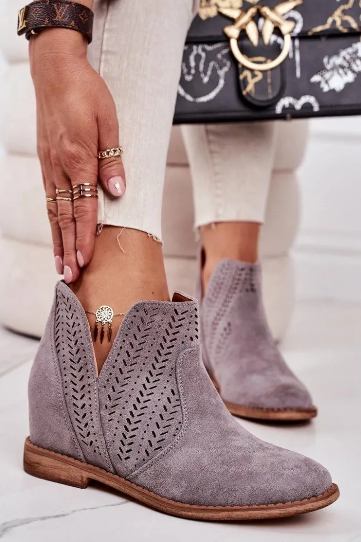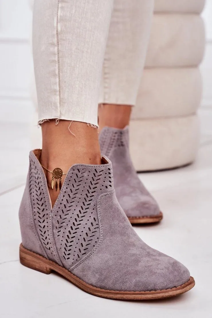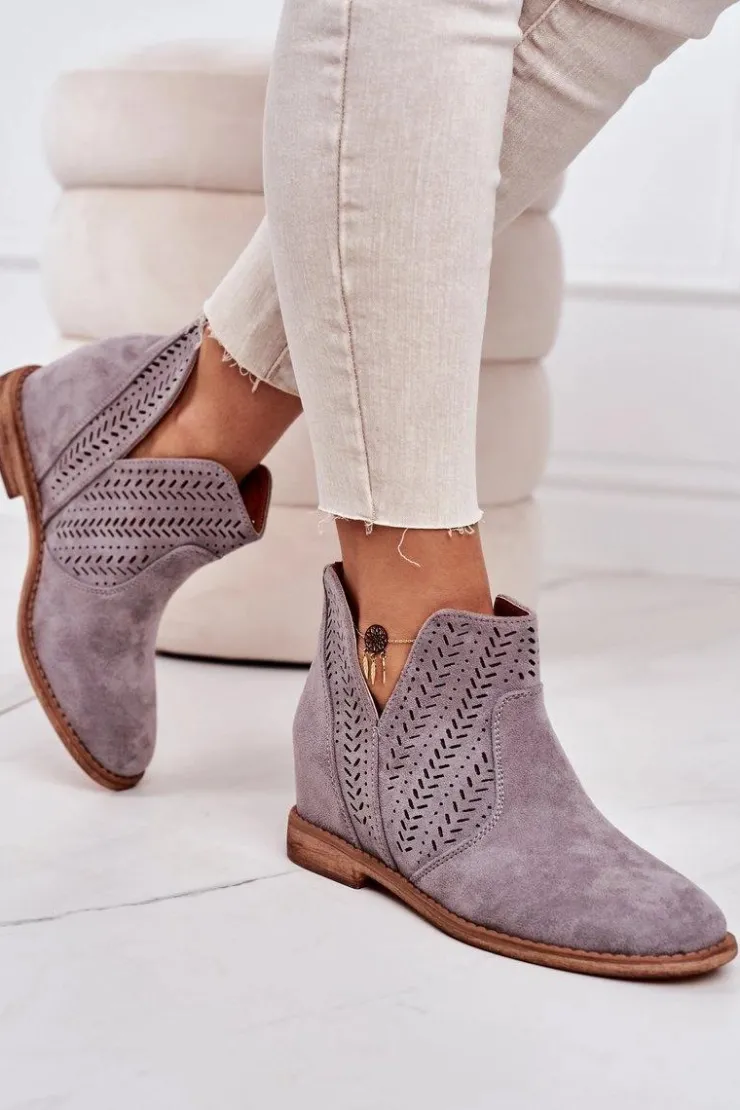 Wiosenne ażurowe botki na ukrytym koturnie. Buty wykonane są z eko zamszu. Botki są bardzo wygodne dzięki miękkiej wkładce ze skóry naturalnej. Koniecznie sprawdź całą naszą kolekcję damskich botków!