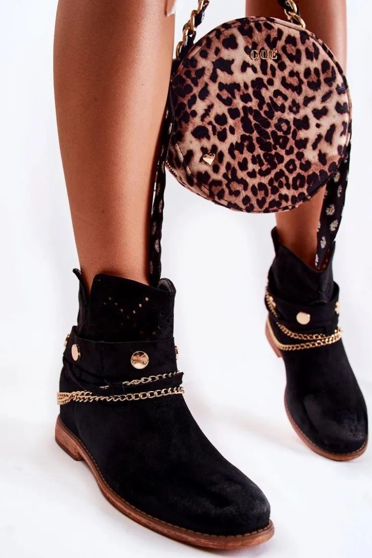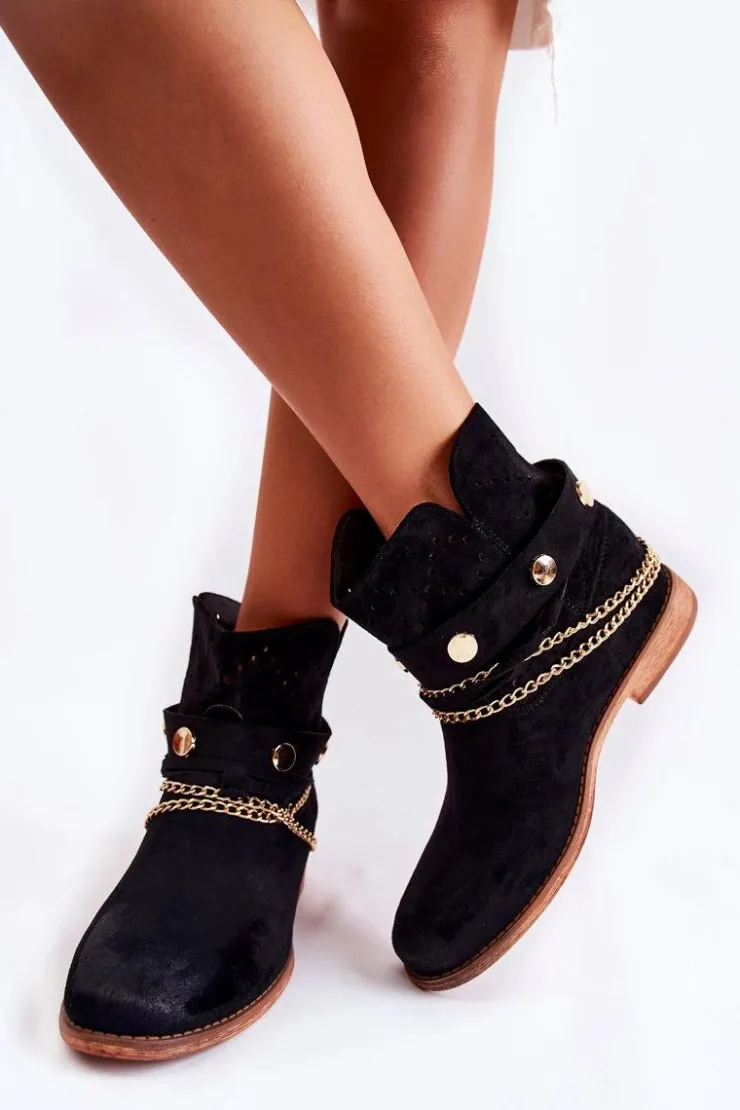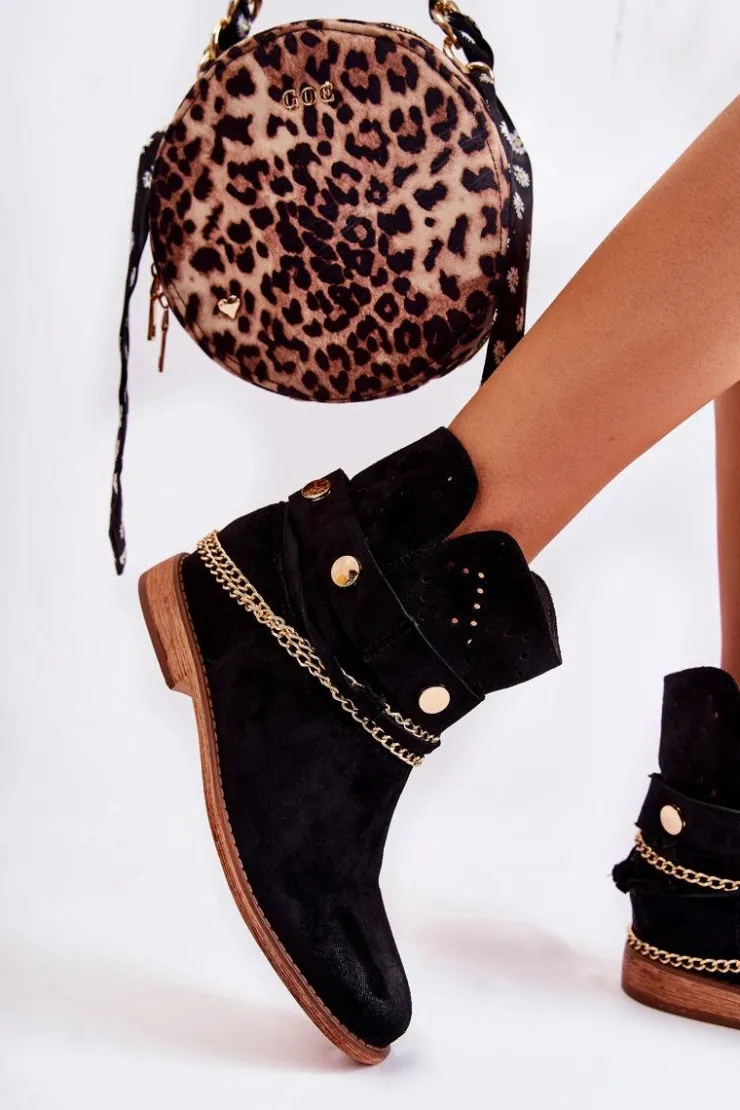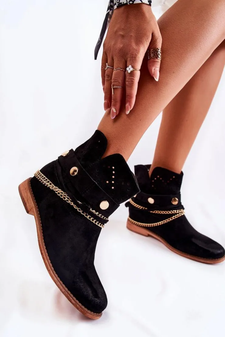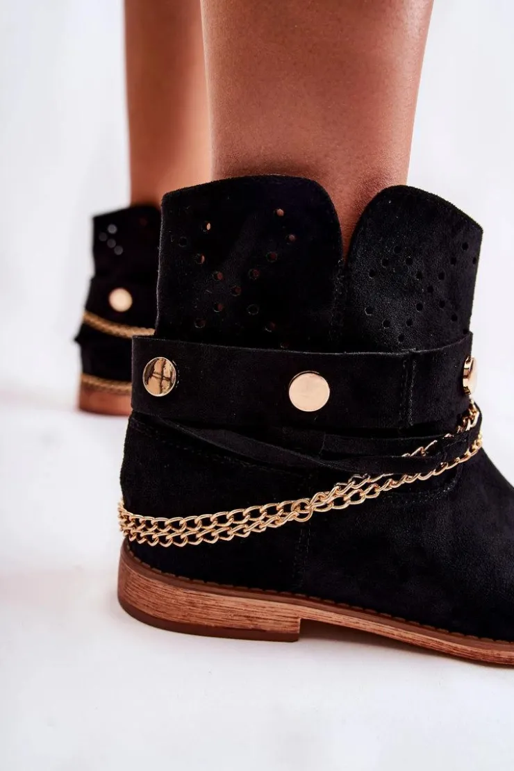Botki na ukrytym koturnie i płaskim obcasie posiadają cholewką za kostkę, która jest delikatnie perforowana. Model wsuwany, wykonany z eko zamszu. Miękka wkładka z eko skóry pozwala na wygodne użytkowanie. Zapiętek usztywniany. Idealne na sezon wiosenno-jesienny. Botki posiadają osobno ściągane paseczki i łańcuszek, dlatego możesz je nosić razem z ozdobami lub bez. Przy wyborze rozmiaru prosimy sugerować się tabelą rozmiarów.