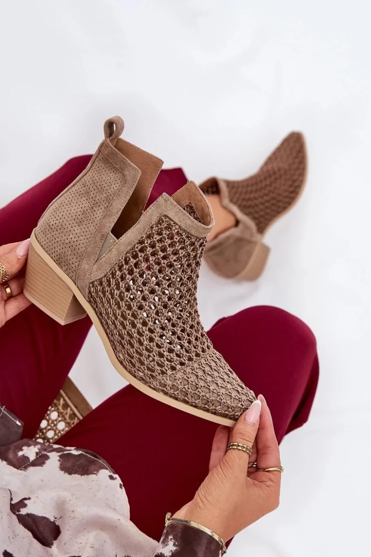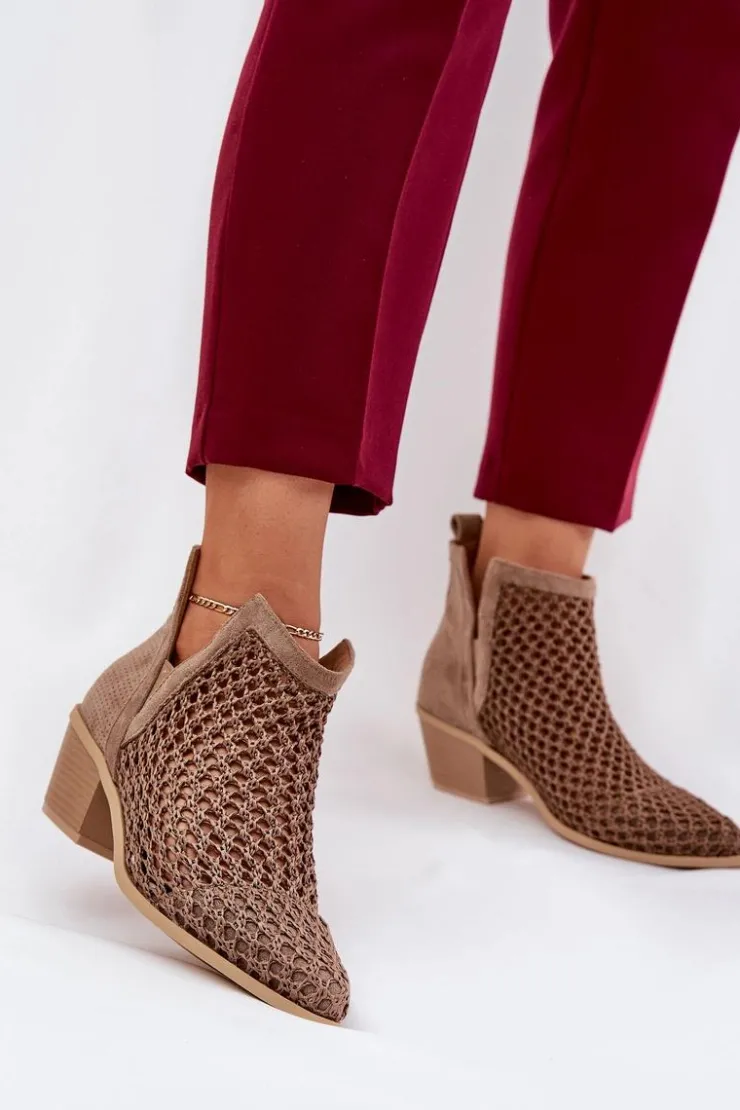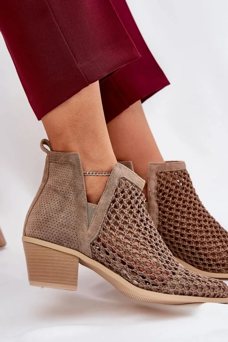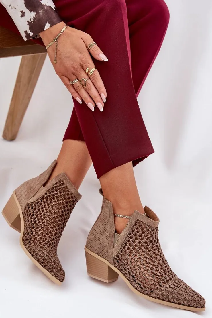 Niskie botki na obcasie, które łączą komfort z modnym wyglądem. Noski w szpic dodają im zmysłowego charakteru, a subtelne wycięcia po bokach cholewki sprawiają, że buty nabierają lekkości i nowoczesnego stylu. Przód buta ozdobiony ażurowym wzorem z plecionką, która podkreśla ich unikalny wygląd. Dodatkowym atutem jest miękka wkładka, zapewniająca wygodę podczas chodzenia przez cały dzień. Idealny wybór na wiosenne i letnie dni. Przy wyborze rozmiaru prosimy sugerować się tabelą rozmiarów.