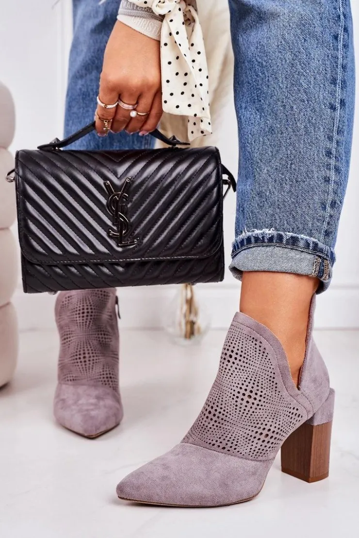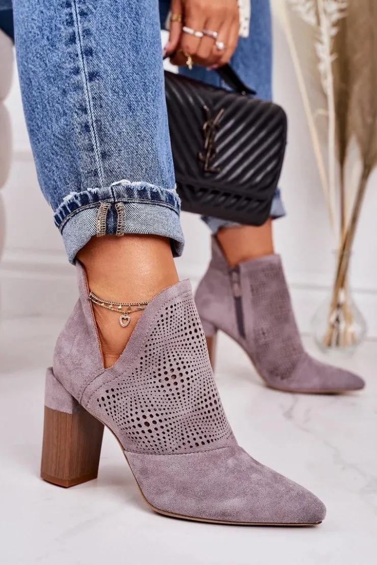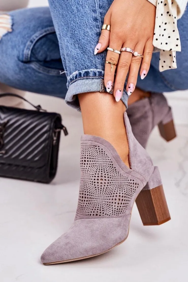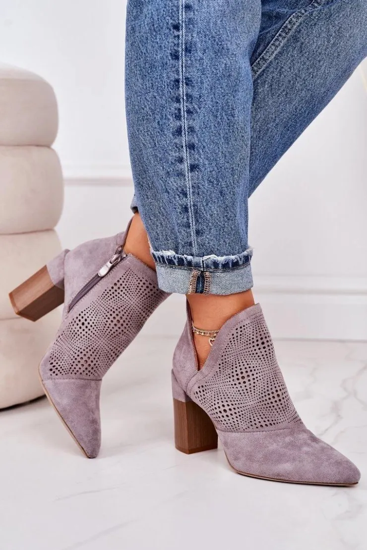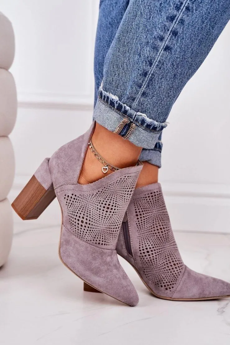 Wiosenne ażurowe botki na słupku. Buty wykonane są z eko zamszu. Botki są bardzo wygodne dzięki miękkiej wkładce oraz stabilnemu słupkowi. Koniecznie sprawdź całą naszą kolekcję damskich botków! Przy wyborze rozmiaru prosimy sugerować się tabelą rozmiarów.