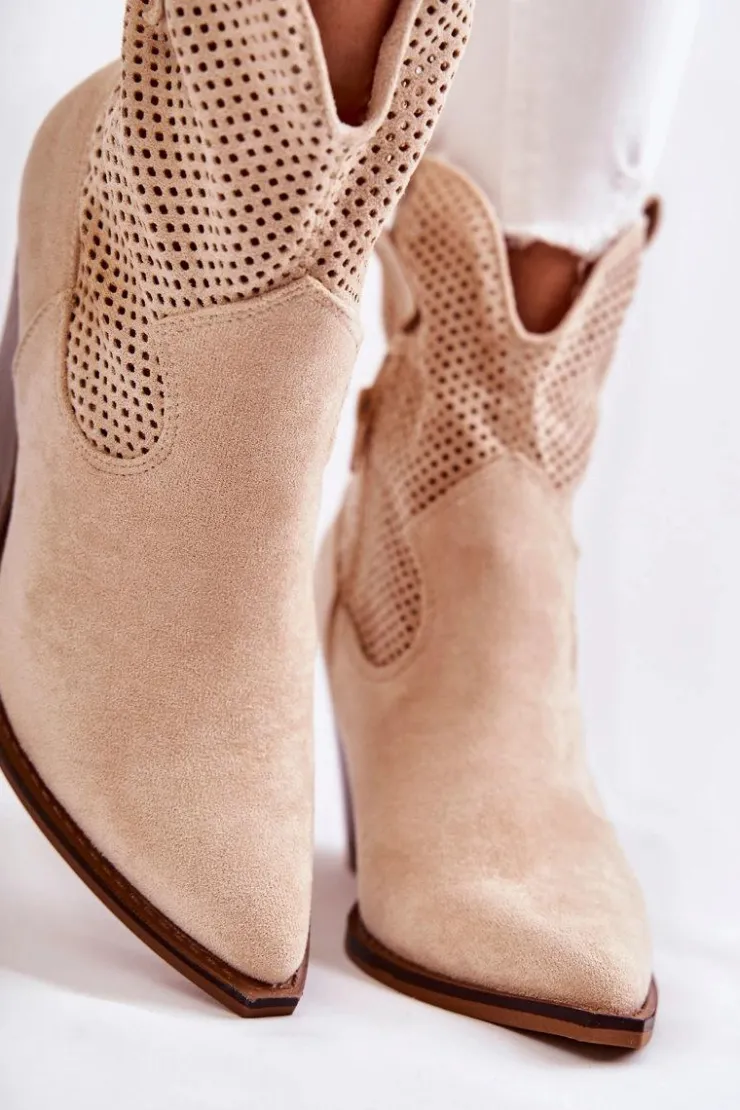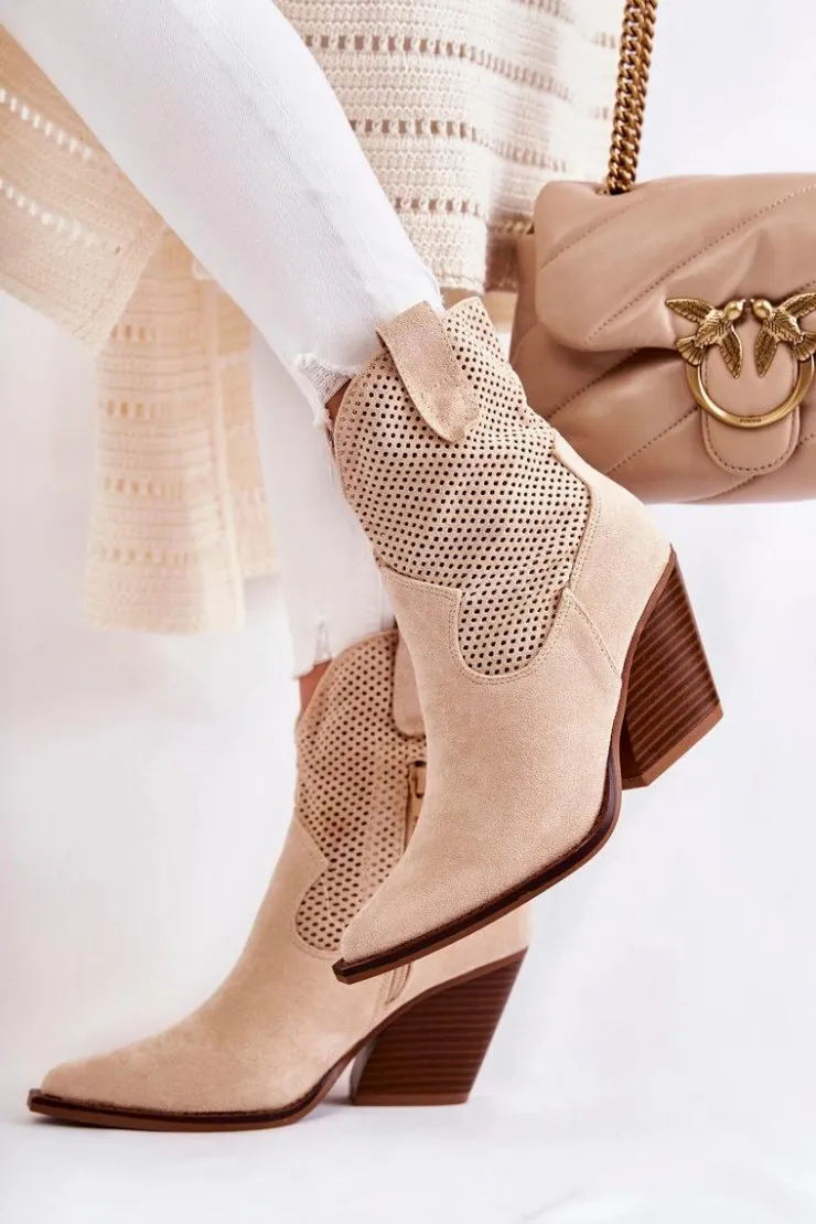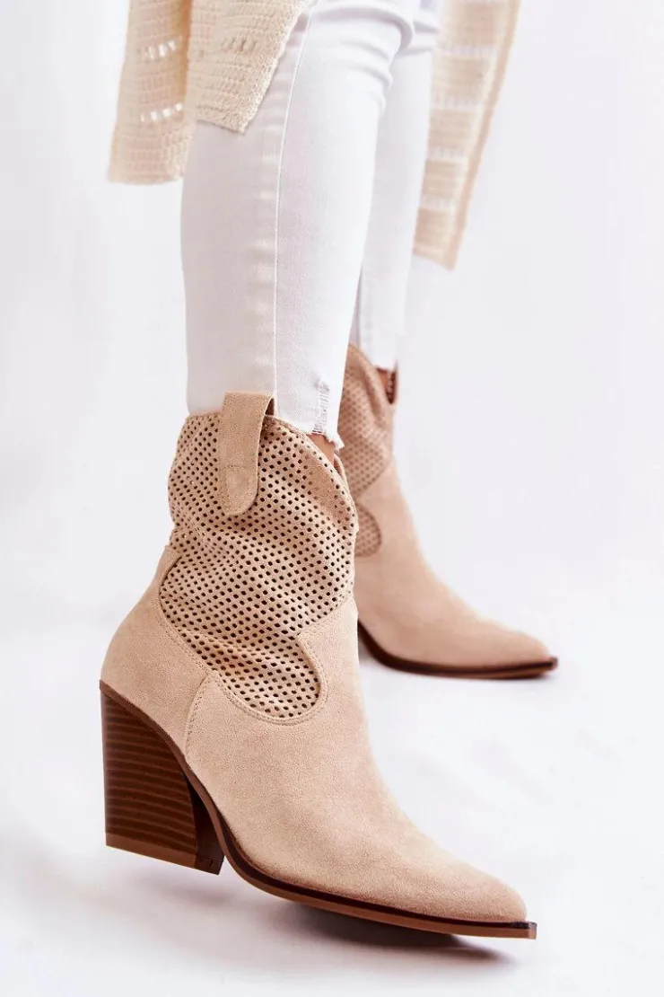Świetne botki damskie wykonane z eko zamszu w ażurowy wzór. Posiadają usztywniany zapiętek oraz nosek w szpic charakterystyczny dla fasonu kowbojek. Model wsuwany z dodatkowym suwakiem z boku cholewki. Osadzone na masywnym obcasie w postaci ściętego słupka. Botki te to idealny model na sezon przejściowy. Świetnie będą prezentować się w wielu stylizacjach. Przy wyborze rozmiaru prosimy sugerować się tabelą rozmiarów.