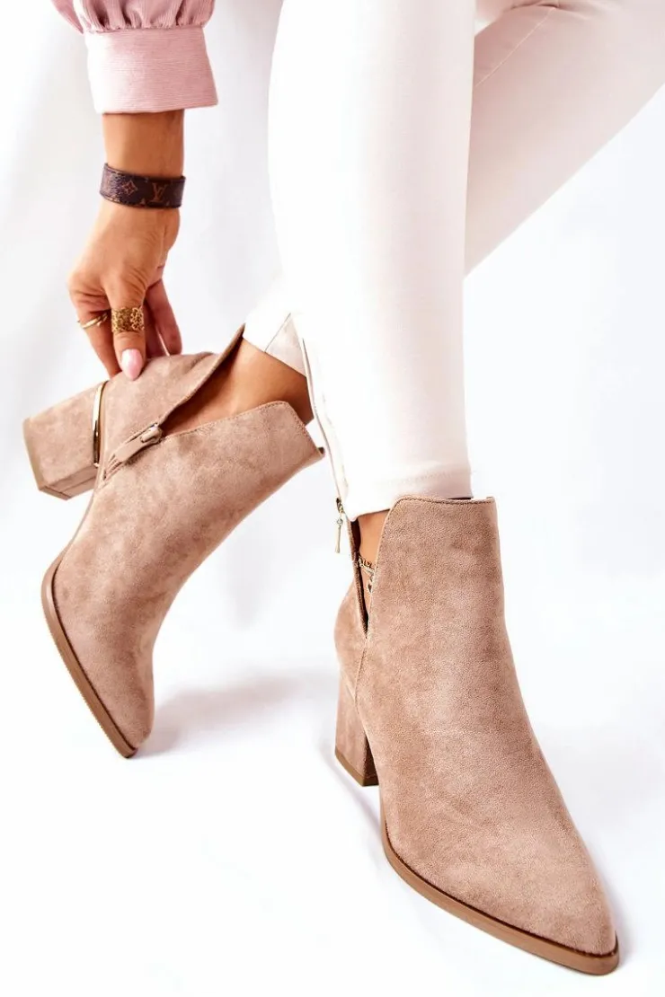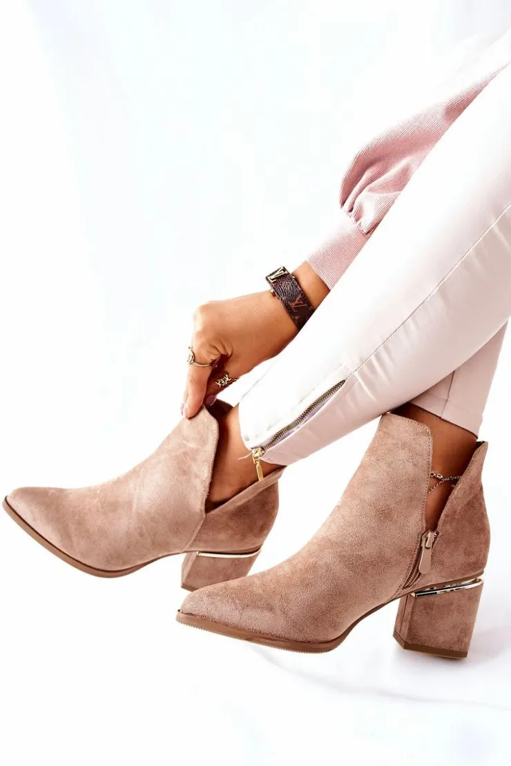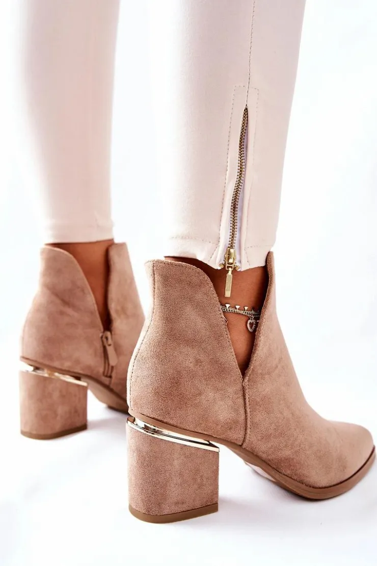 Klasyczne botki, dostępne w kilku kolorach. Cholewka z wycięciami na boku, wykonana z ekologicznego zamszu. Dzięki złotemu zdobieniu na słupku świetnie się prezentują w każdej stylizacji. Na boku znajduje się delikatny suwak, ułatwiający zakładanie. Przy wyborze rozmiaru prosimy sugerować się tabelą rozmiarów.