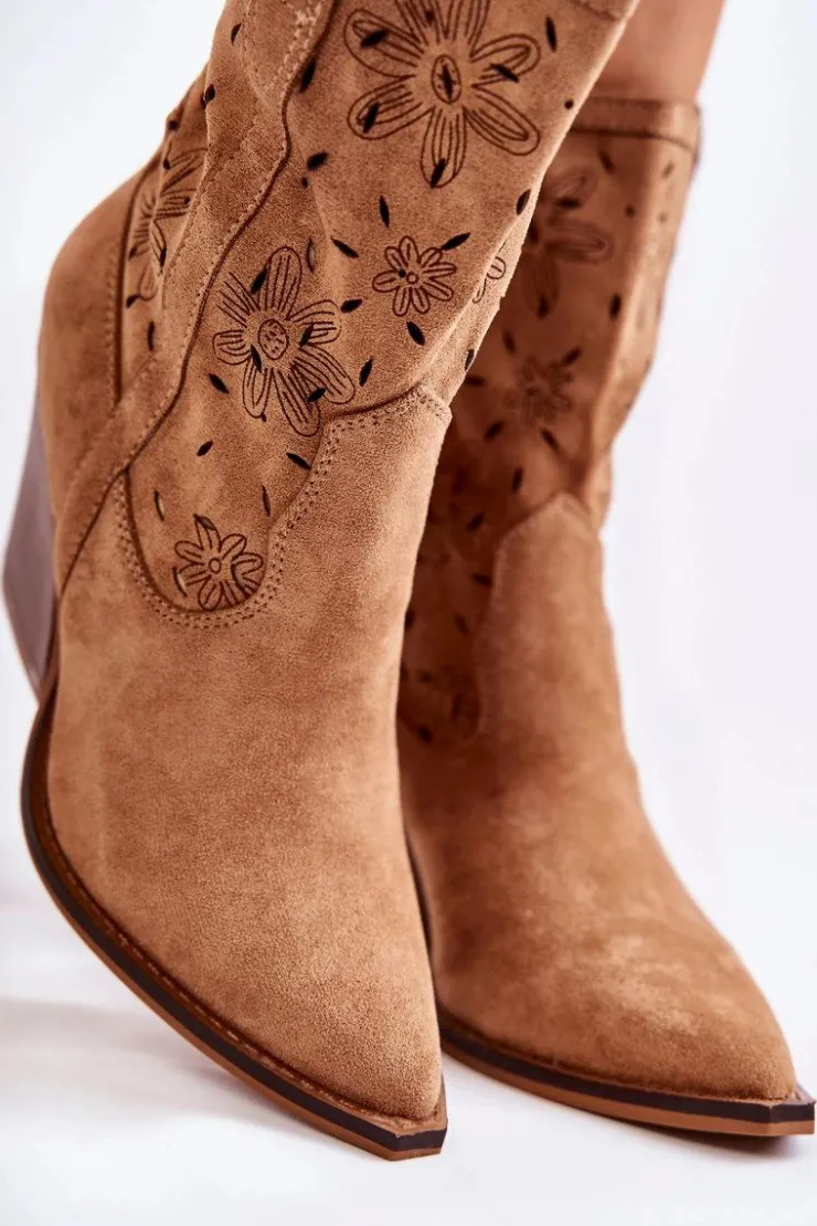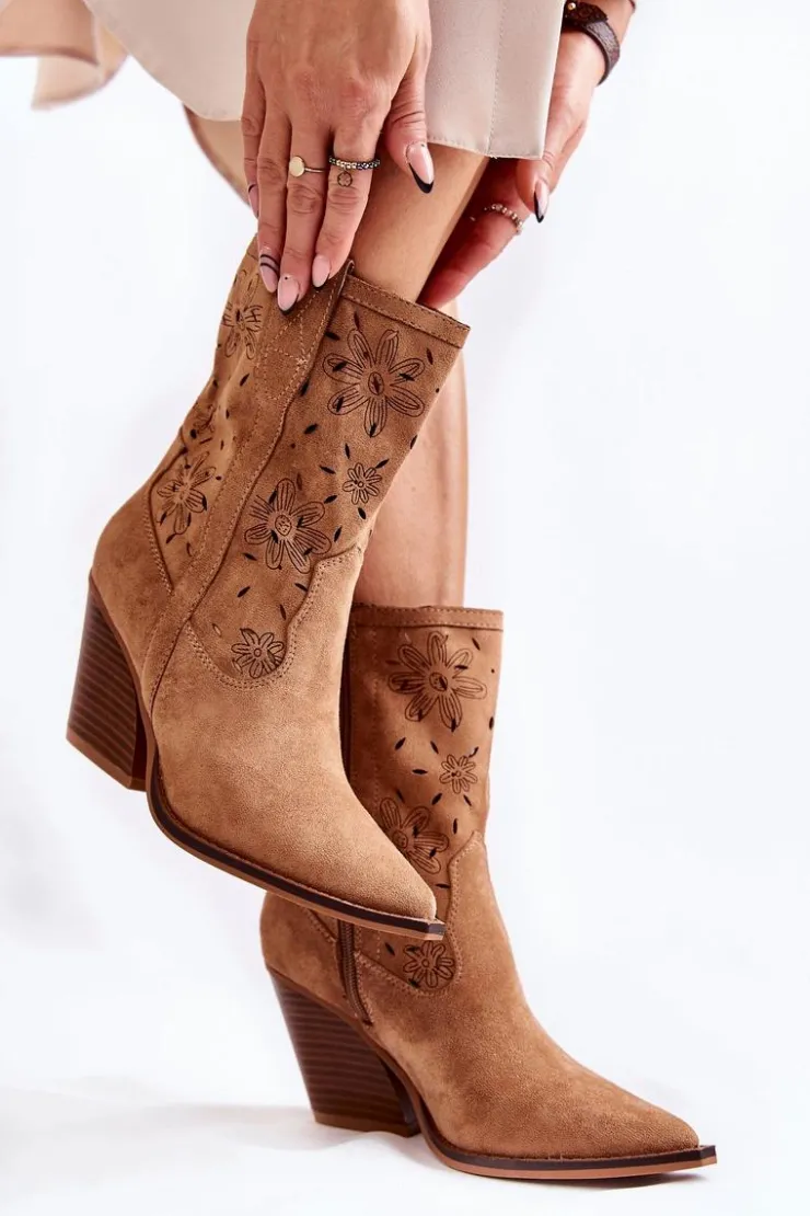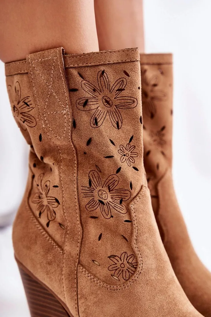 Botki o fasonie kowbojek zostały osadzone na obcasie w postaci ściętego słupka. Fason z cholewką do łydki. Charakterystyczny szpiczasty nosek wyróżnia ten fason. Po wewnętrznej stronie zamek błyskawiczny w pasującym kolorze. Wykonane z eko zamszu z delikatnym ażurowym wzorkiem i kwiatowym motywem. Wewnątrz znajduje się materiałowa wkładka. Buty nie posiadają ocieplenia. Kowbojki to doskonały wybór na sezon przejściowy. Przy wyborze rozmiaru prosimy sugerować się tabelą rozmiarów.