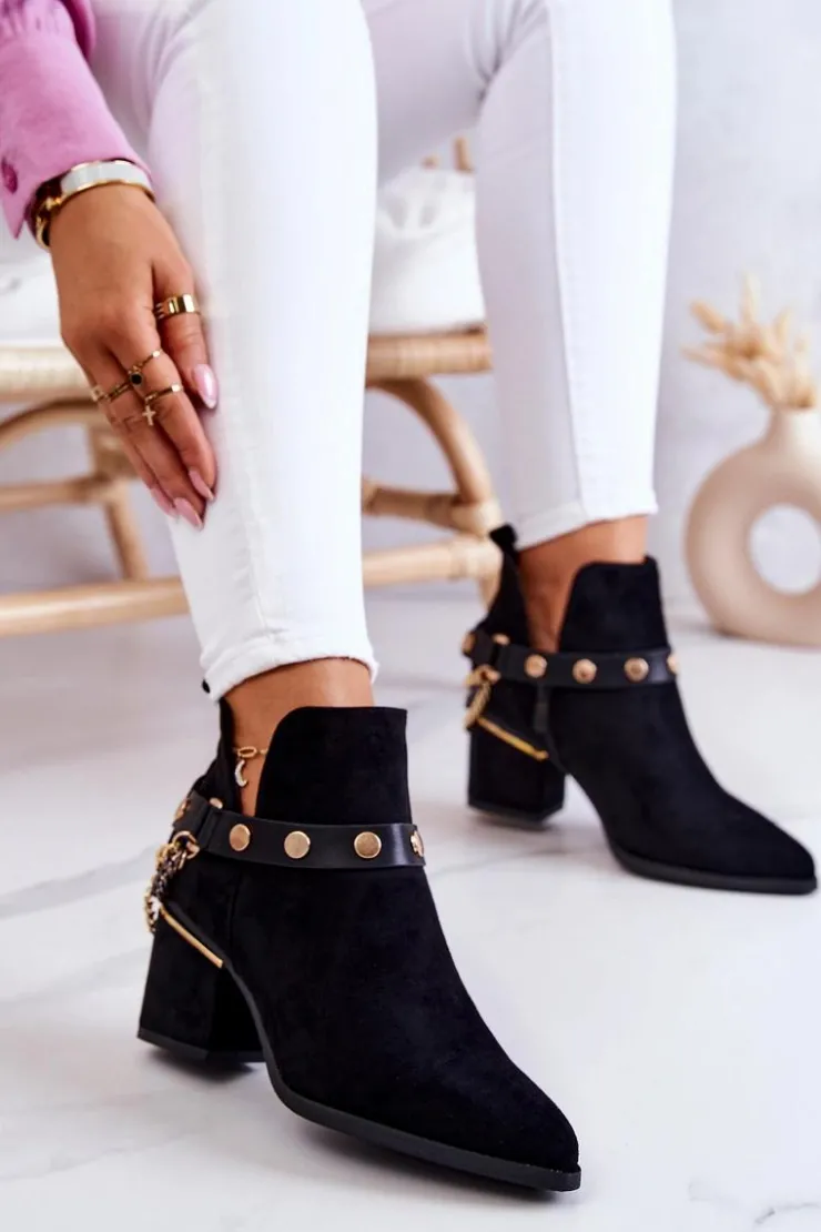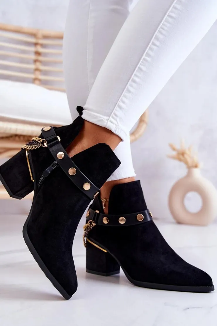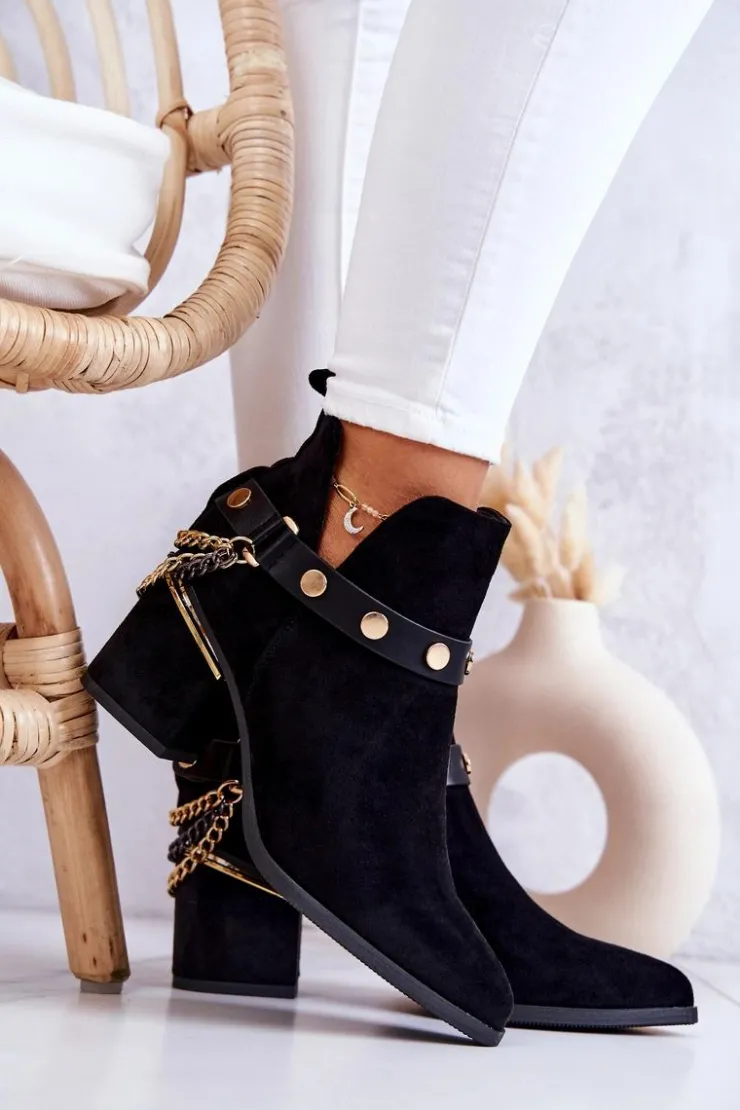 Cudowne botki, które idealnie sprawdzą się w sezonie wiosenno-jesiennym. Wykonane z delikatnego eko zamszu. Posiadają krótki suwak z wewnętrznej strony. Ozdobny pasek z łańcuszkami jest zapinany na napę i można go w każdej chwili odpiąć. Dwa modele w jednym! Fason kowbojek świetnie będzie komponował się z wieloma stylizacjami. Stabilny obcas w postaci szerokiego słupka delikatnie uniesie Twoją sylwetkę. Przy wyborze rozmiaru prosimy sugerować się tabelą rozmiarów.
